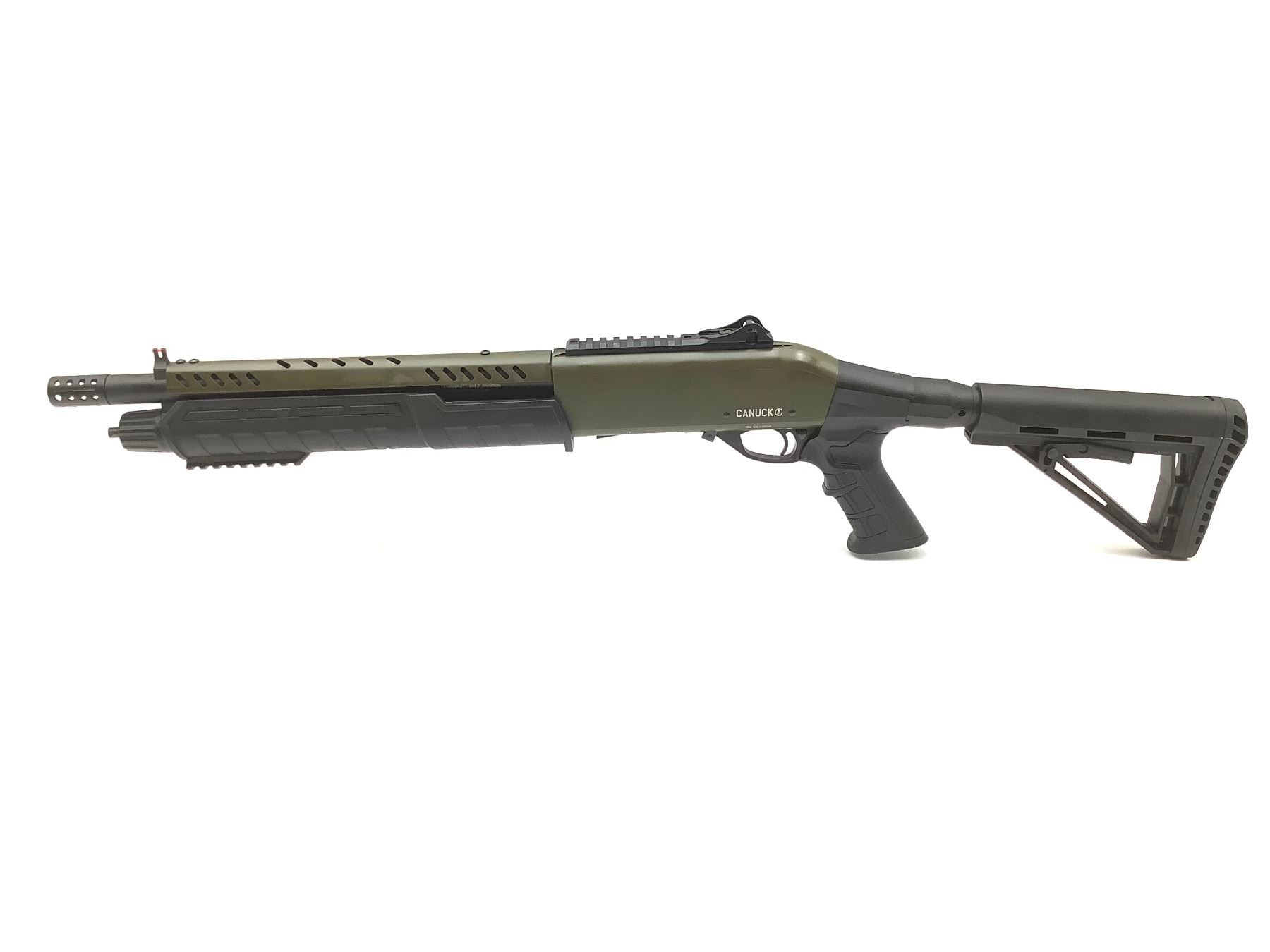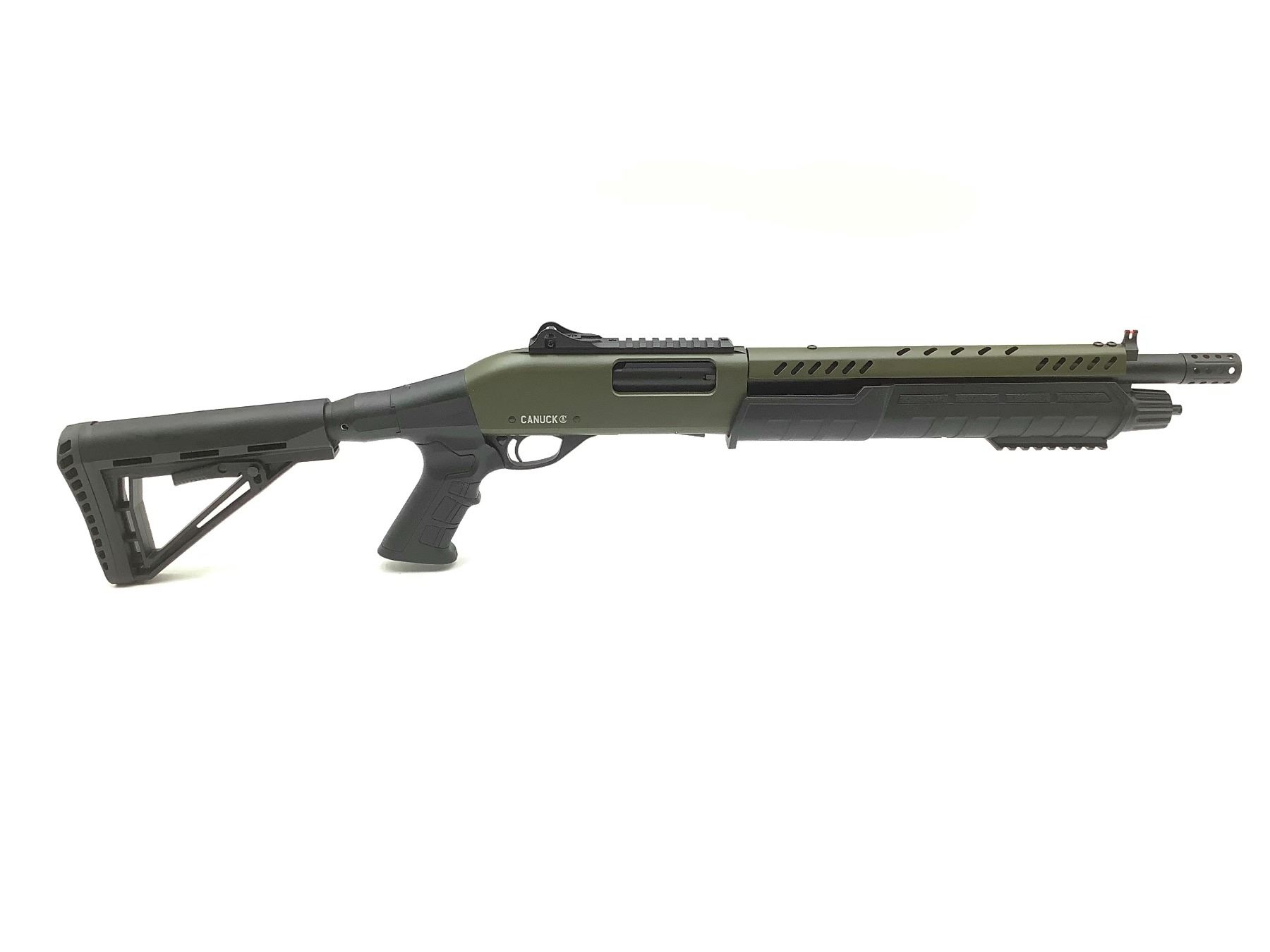 Canuck Commander 12Ga Pump Action Shotgun 3" Chamber 14" Barrel Green, New. Fiber optic front sight, includes interchangeable chokes. This is a non-restricted firearm.