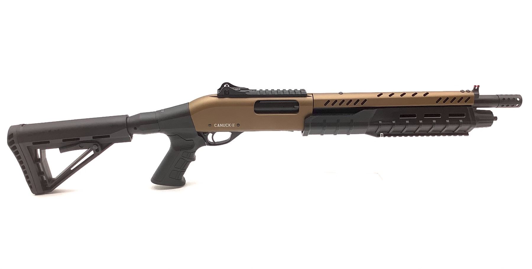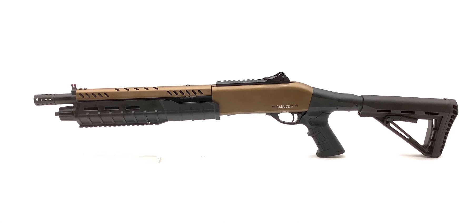 Canuck Commander Pump Action Shotgun 12 Ga 3" Chamber 14" Barrel Bronze Telescoping Stock, New. Includes three removable chokes and fiber optic sight. This is a non-restricted firearm.