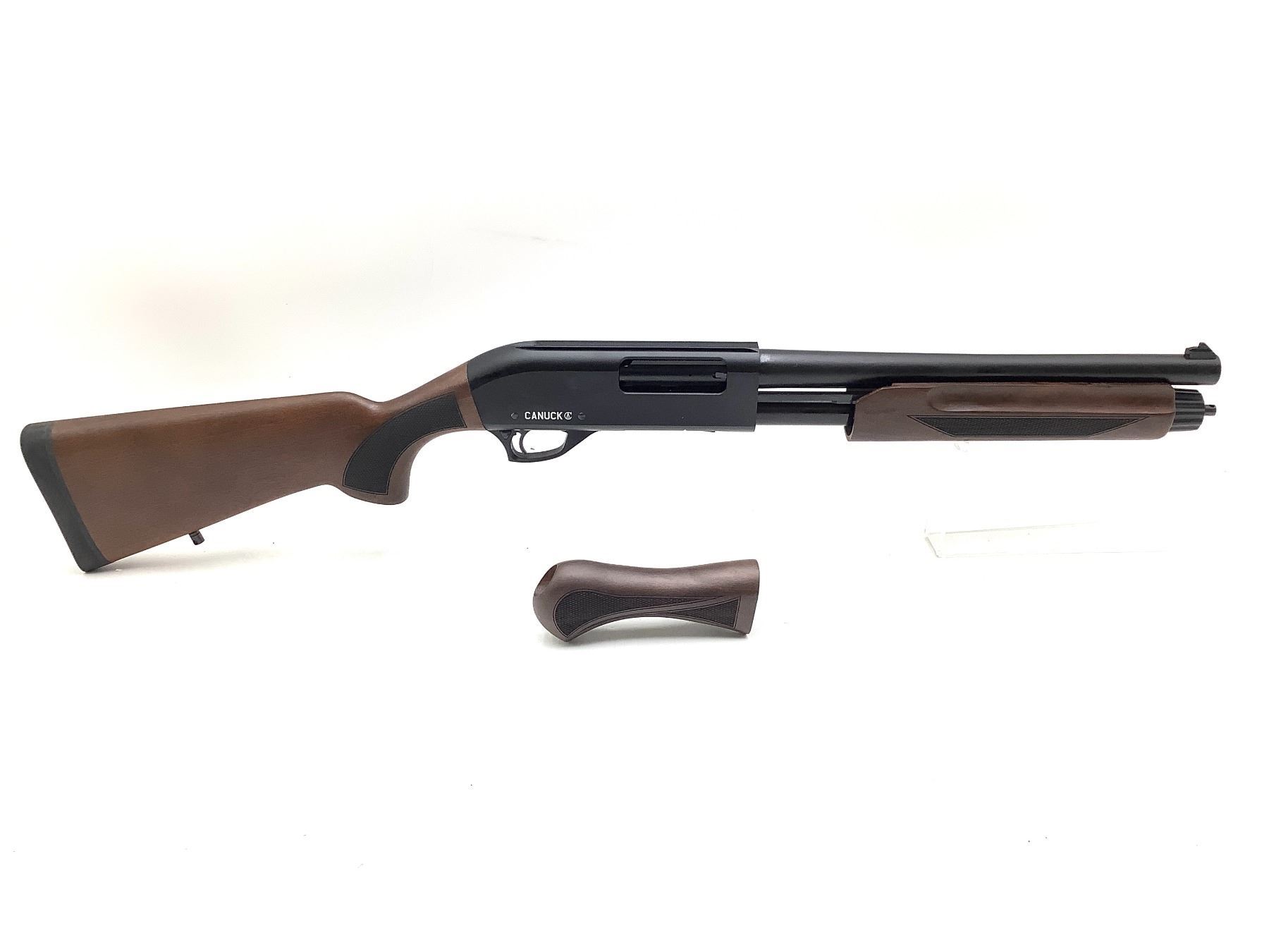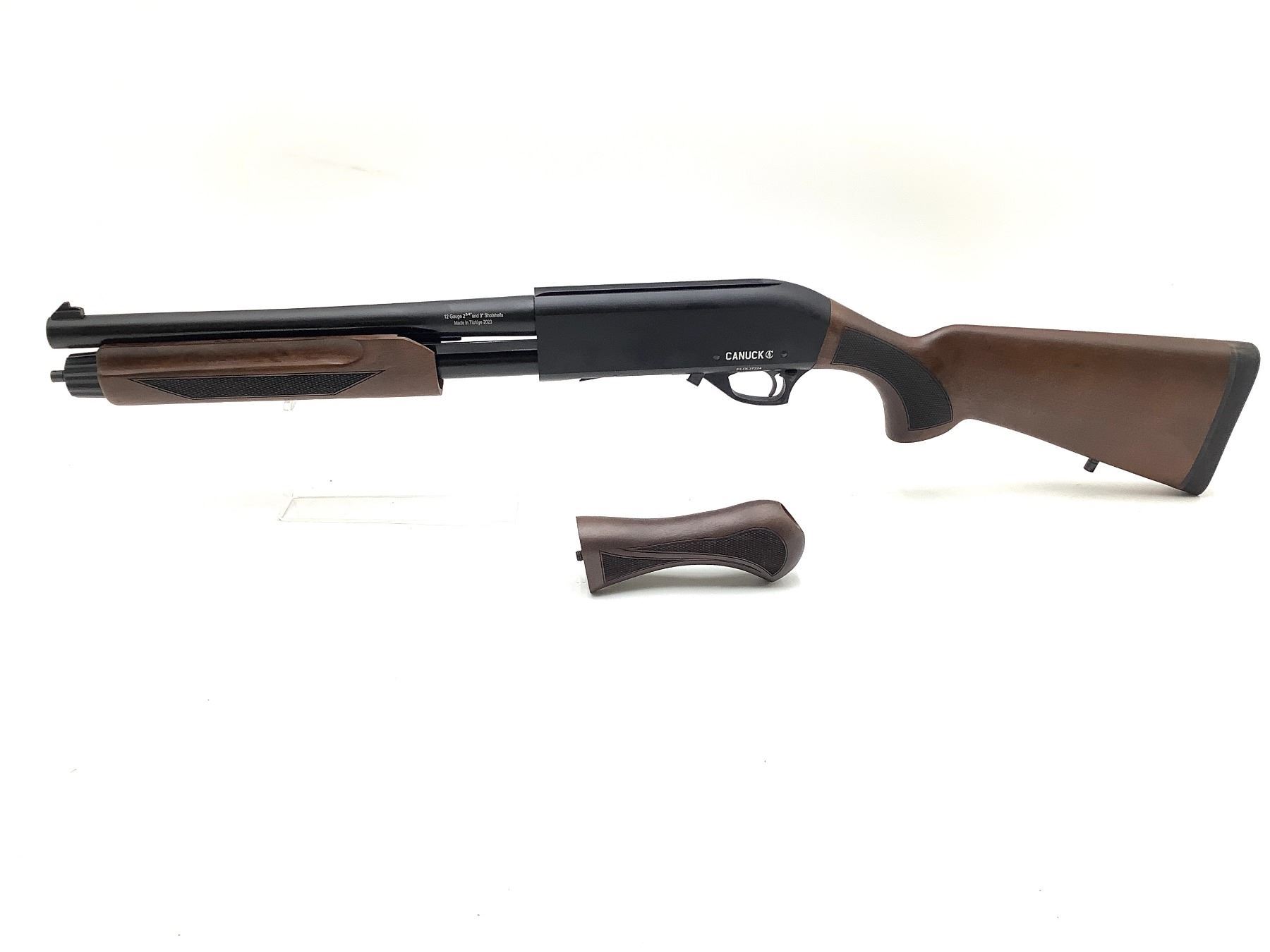 Canuck Defender Pump Action 12Ga Shotgun 3" Chamber 14" Barrel Wood Stock, New. Fixed front sight, removable choke. Comes with second grip. This is a non-restricted firearm.