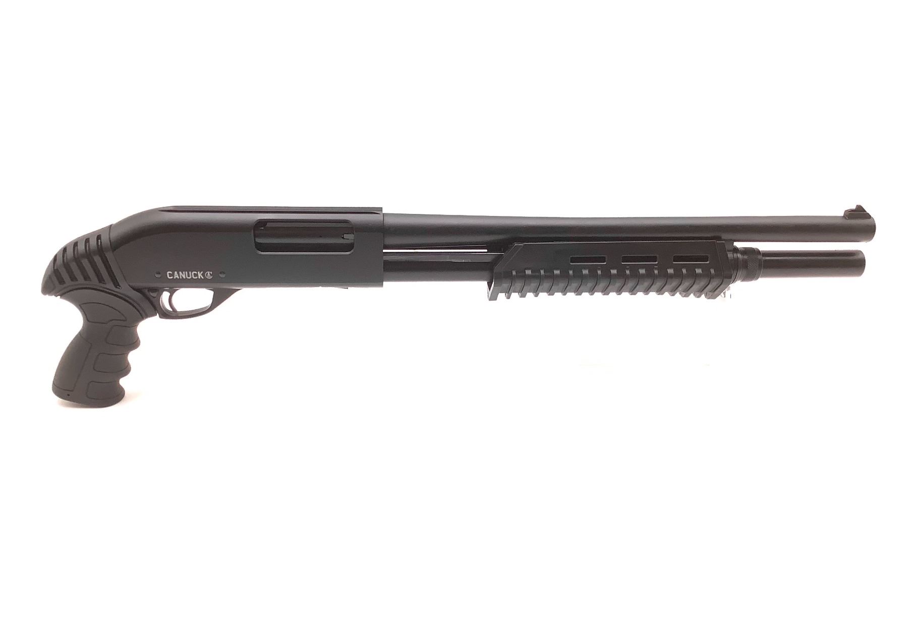 A new in box Canuck Enforcer Pump Action 12ga Shotgun 3", synthetic stock with 17" barrel, comes with stock, flash suppressor and 3 chokes. This is a non restricted firearm.