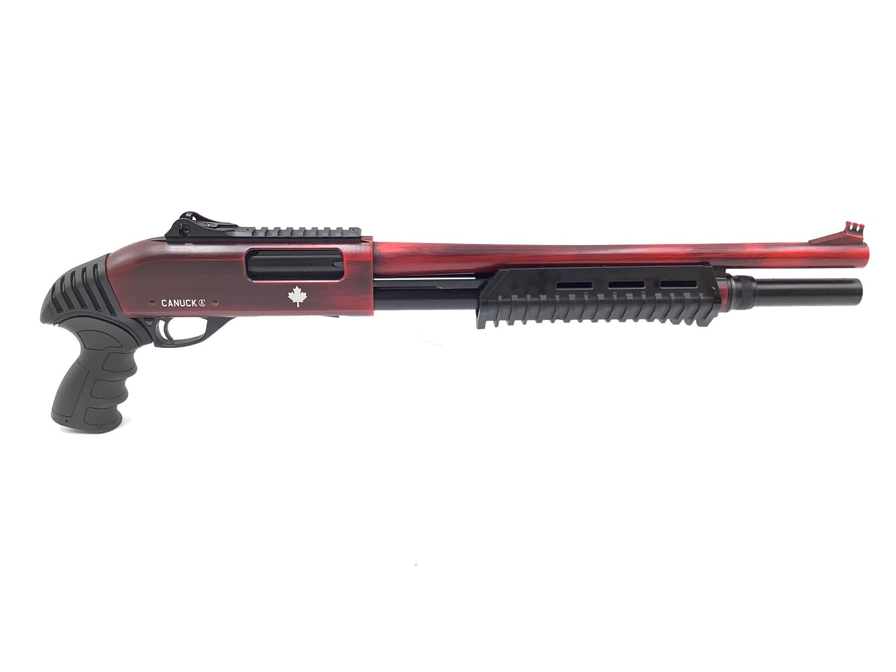 Canuck Freedom Enforcer 12Ga Pump Action Shotgun 17" Barrel 3" Chamber 3 Stocks Black/Distressed Red, New. Includes interchangeable chokes. This is a non-restricted firearm.