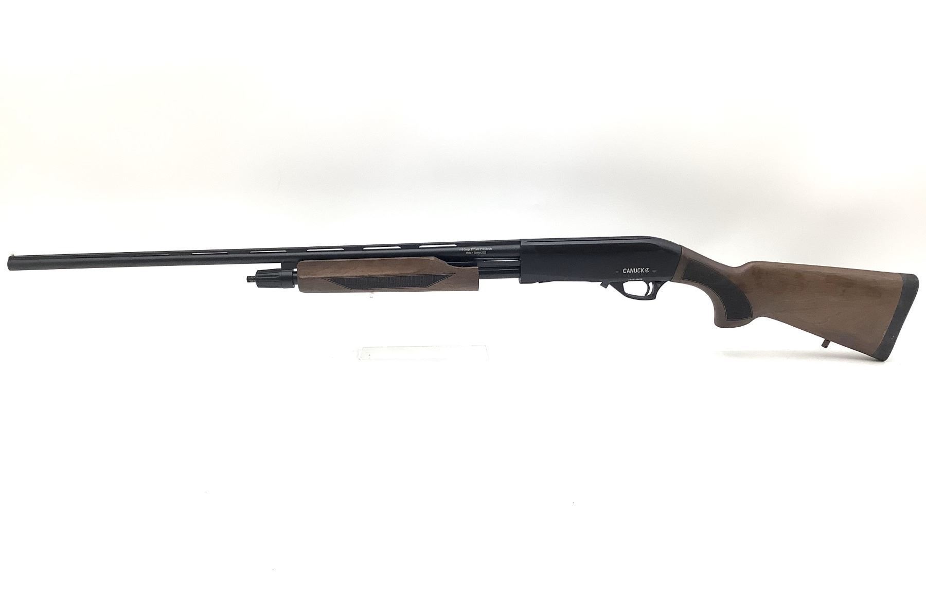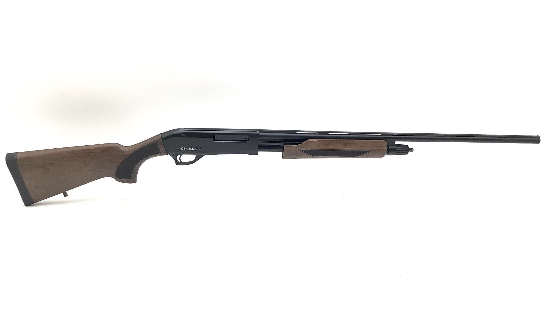 Canuck Hunter 410 Pump Action Shotgun 3" Chamber 26" Vent Rib Barrel Wood Stock, New. Comes with a removable choke. Bead front sight. This is a non restricted firearm.