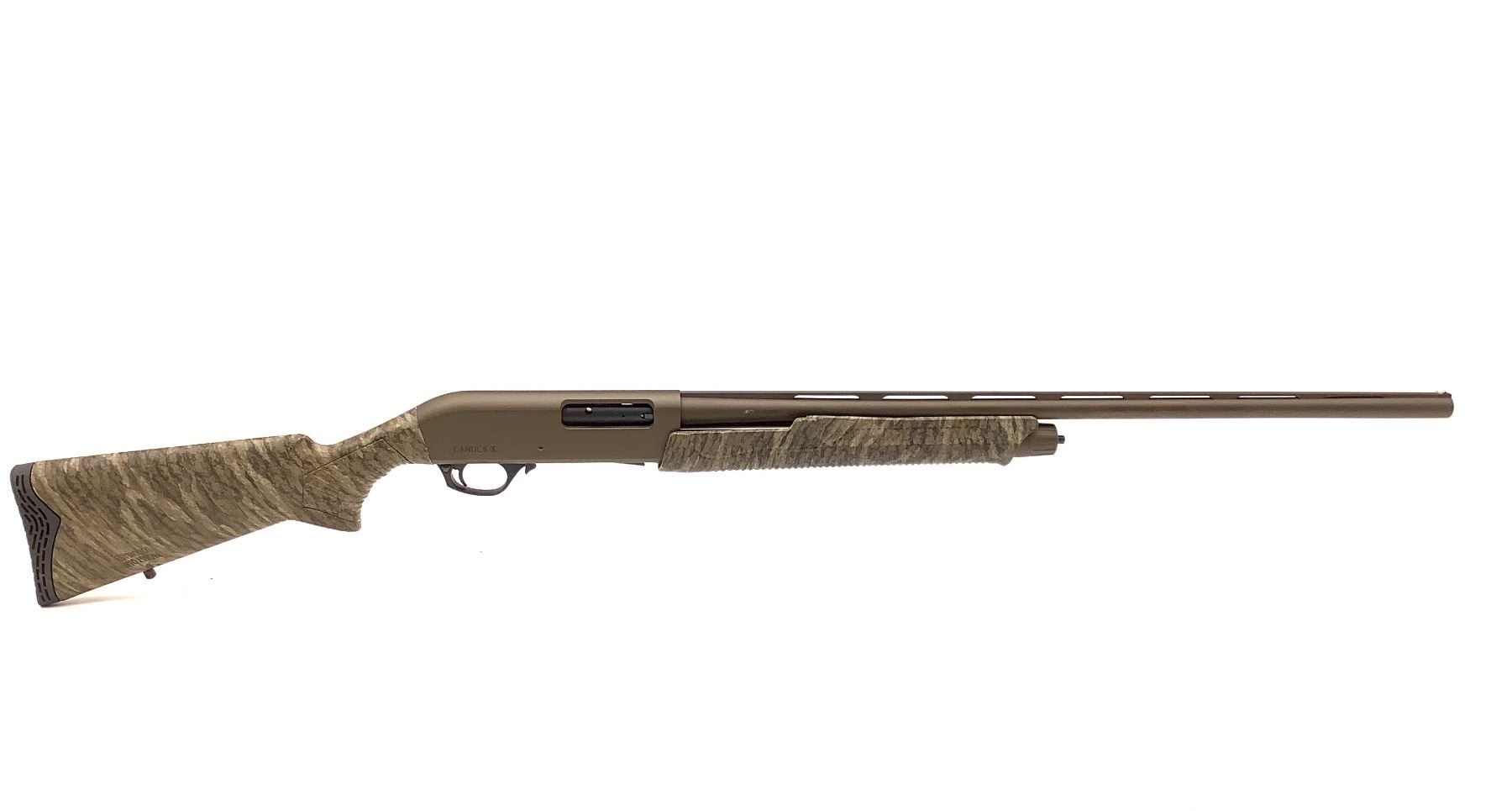 Canuck Hunter Pump Action 20Ga |Shotgun 28" Vent Rib Barrel Bronze And MO Bottomlands Camo, New. Fiber optic sight, 3" Chamber. Includes interchangeable chokes. This is a non-restricted firearm.