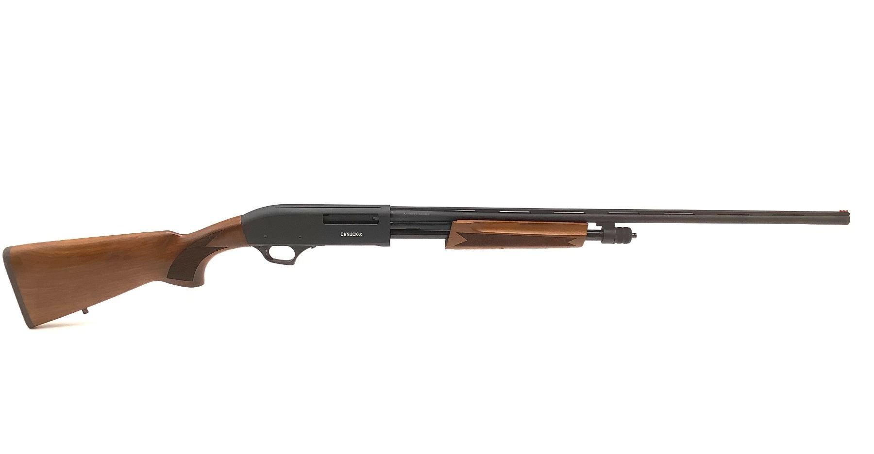 Canuck Hunter Pump Action 410 Shotgun 3" Chamber 26" Barrel Walnut Stock, Display Gun. Vent rib barrel, fiber optic sight. Includes interchangeable chokes. Some wear and marks on metal finish. This is a non-restricted firearm.
