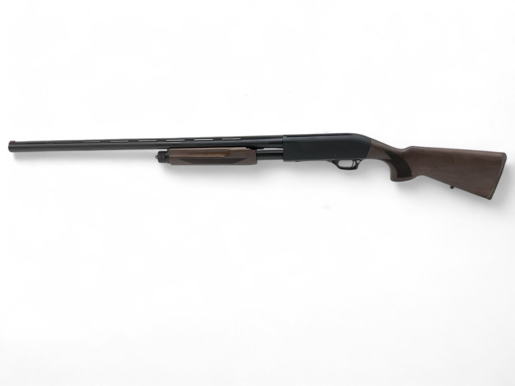 Canuck Pioneer Pump Action Shotgun 12Ga 3" Chamber 28" Vent Rib Barrel Wood Stock, New. Fiber optic sight; comes with a removable choke. This is a non-restricted firearm.