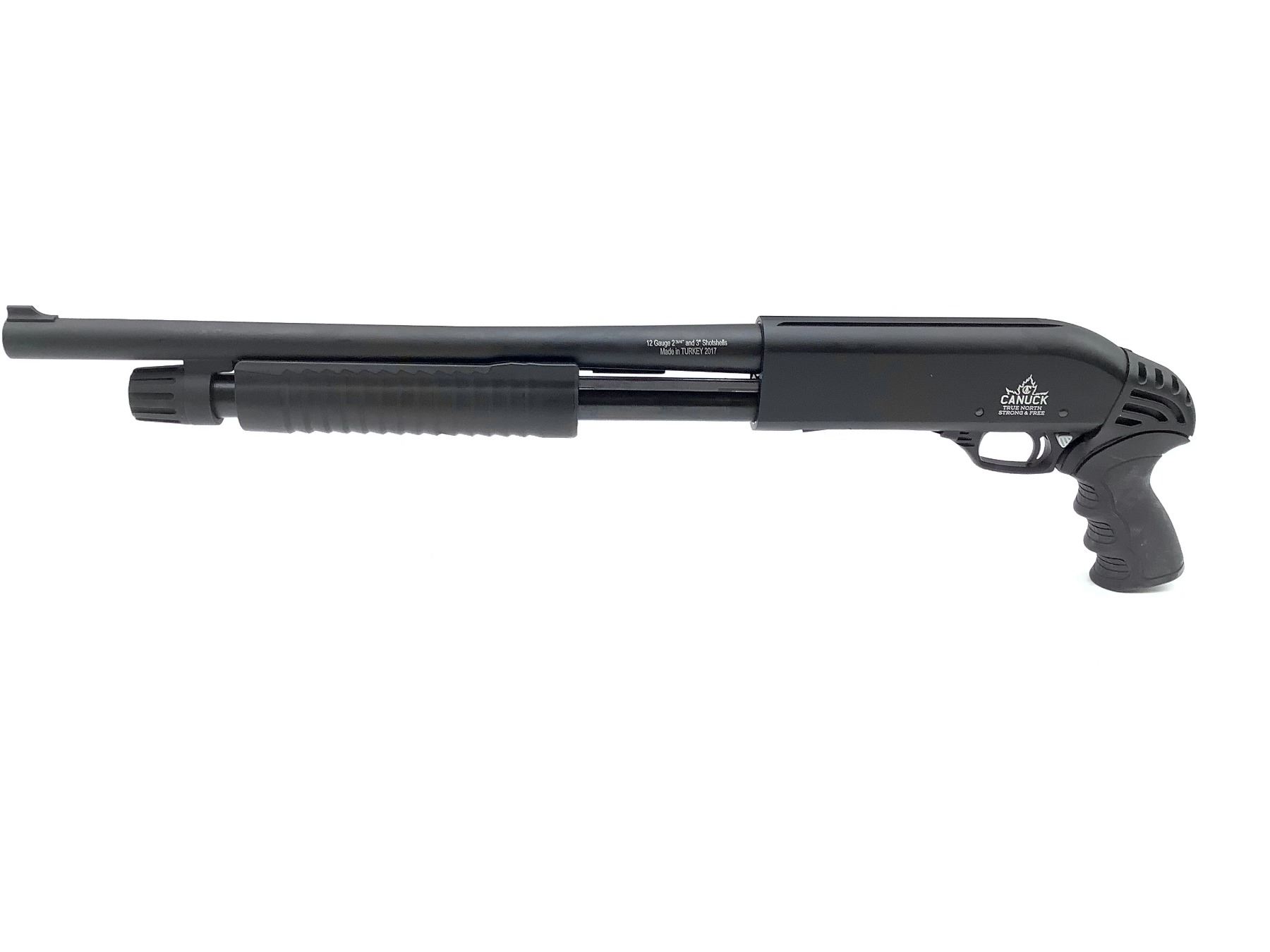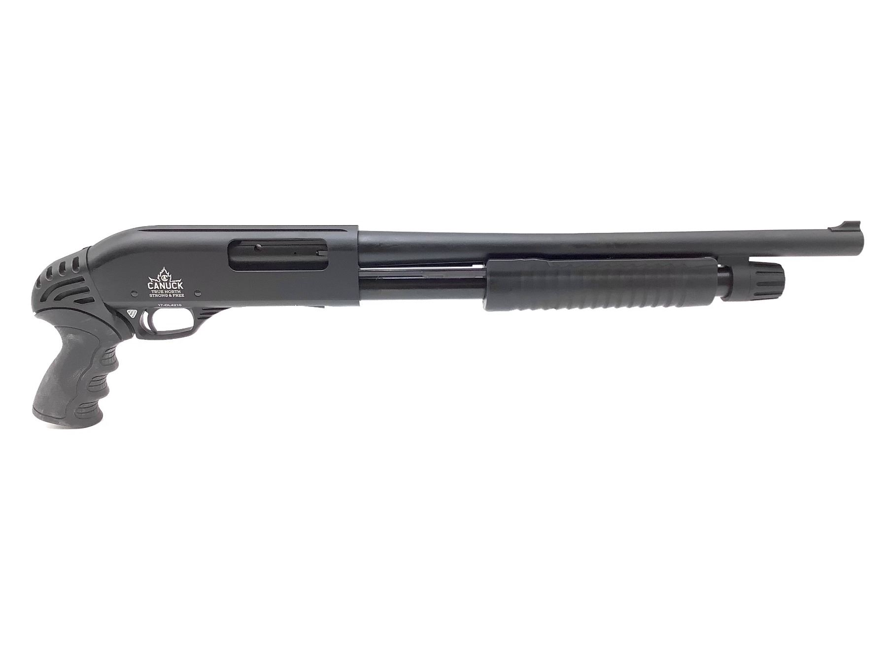Canuck Pump Action 12ga Shotgun 3" Chamber 17" Barrel Black Pistol Grip, New. Includes interchangeable chokes. This is a non-restricted firearm.