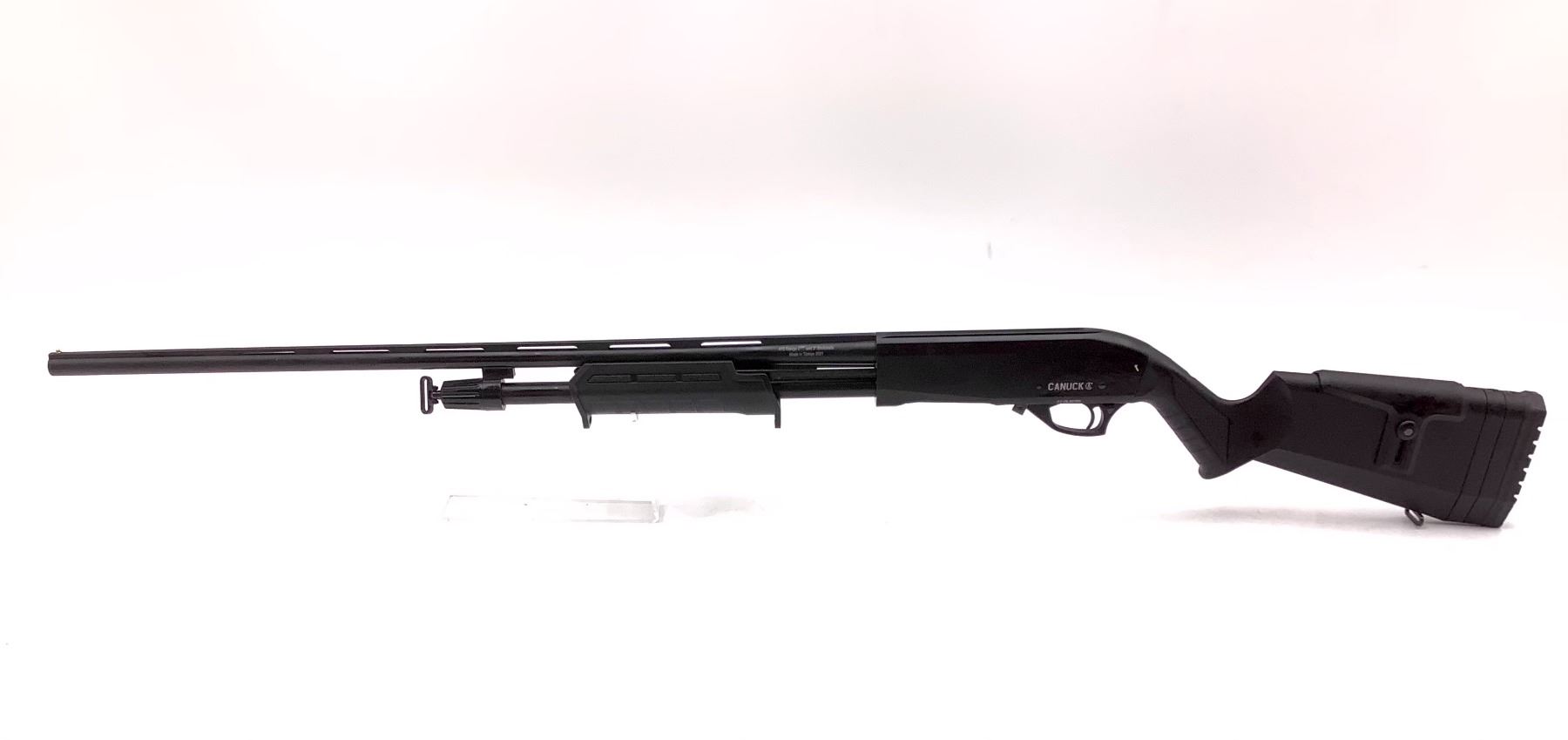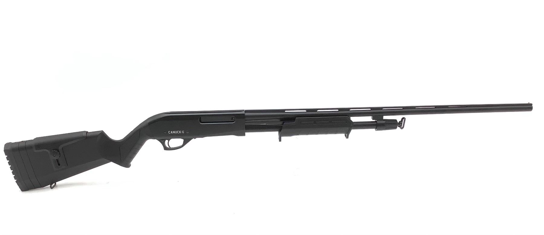 Canuck Pump Action Shotgun 410 3" Chamber 26" Barrel Synthetic Stock, New. Bead sight, includes three removable chokes. This is a non-restricted firearm.