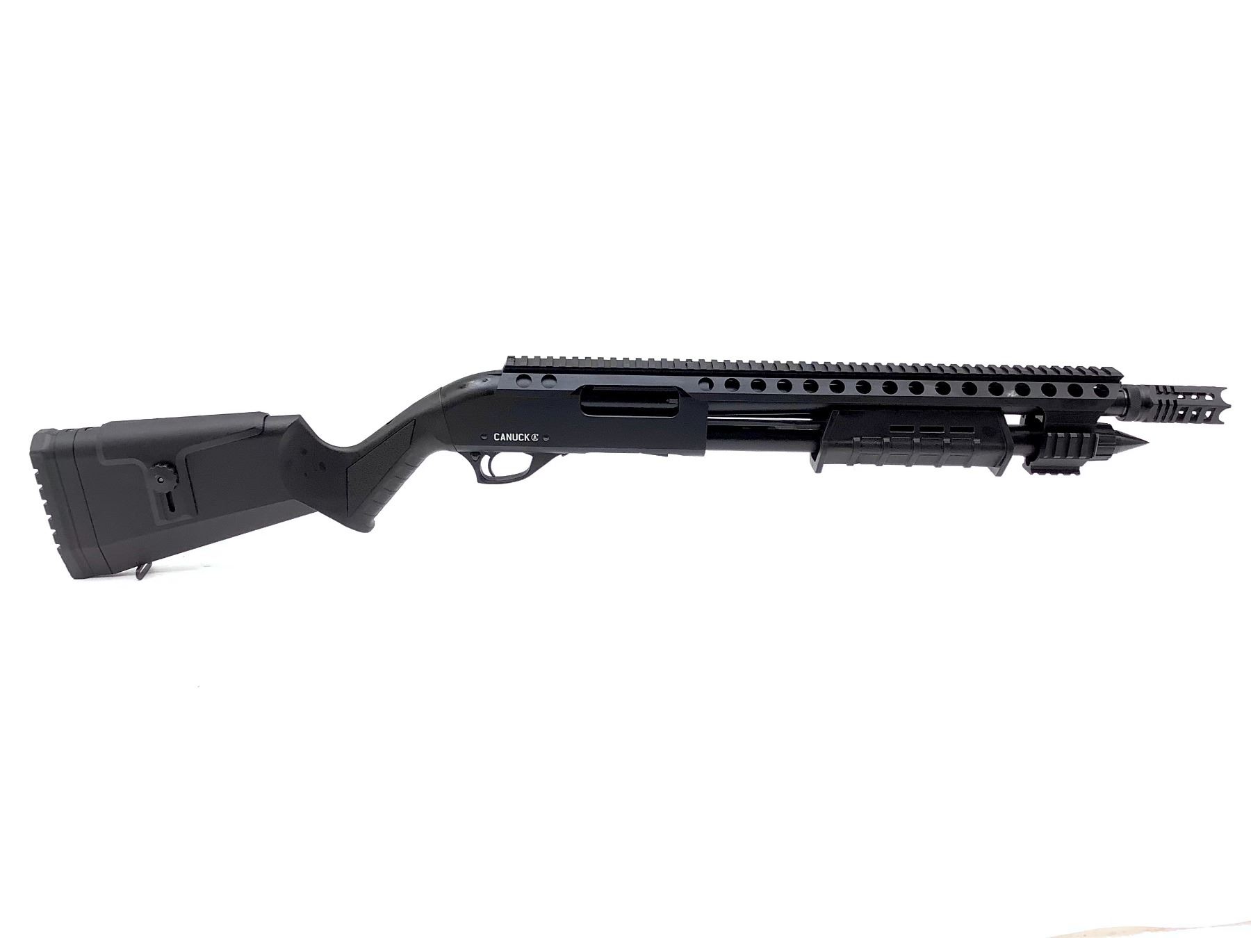 Canuck Renegade 12Ga Pump Action Shotgun 3" Chamber 14" Barrel Two Black Synthetic Stocks (Full stock and raptor grip). Includes Side saddle, interchangeable chokes and full length top rail. This is a non-restricted firearm.
