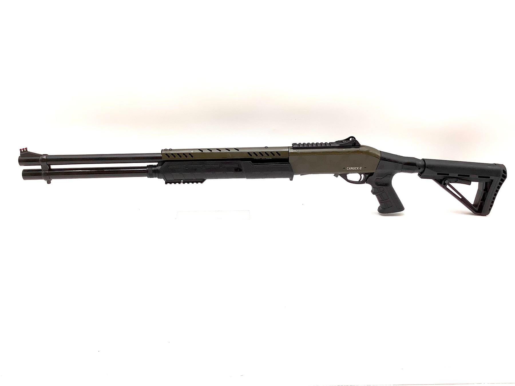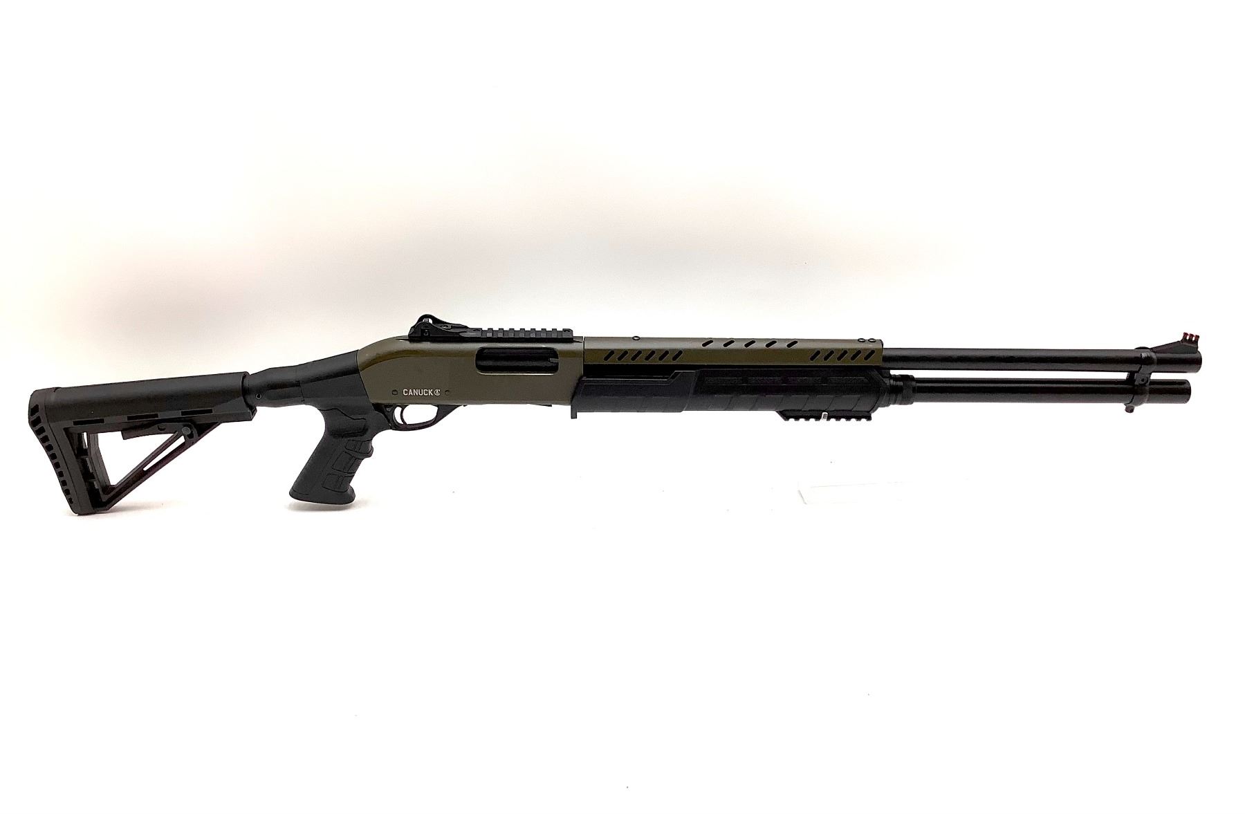 Canuck Sentry 12 Ga Pump Action Shotgun 3" Chamber 24" Barrel W Pistol Grip Green, New. Interchangeable chokes, adjustable stock, fiber optic front sight. This is a non restricted firearm.