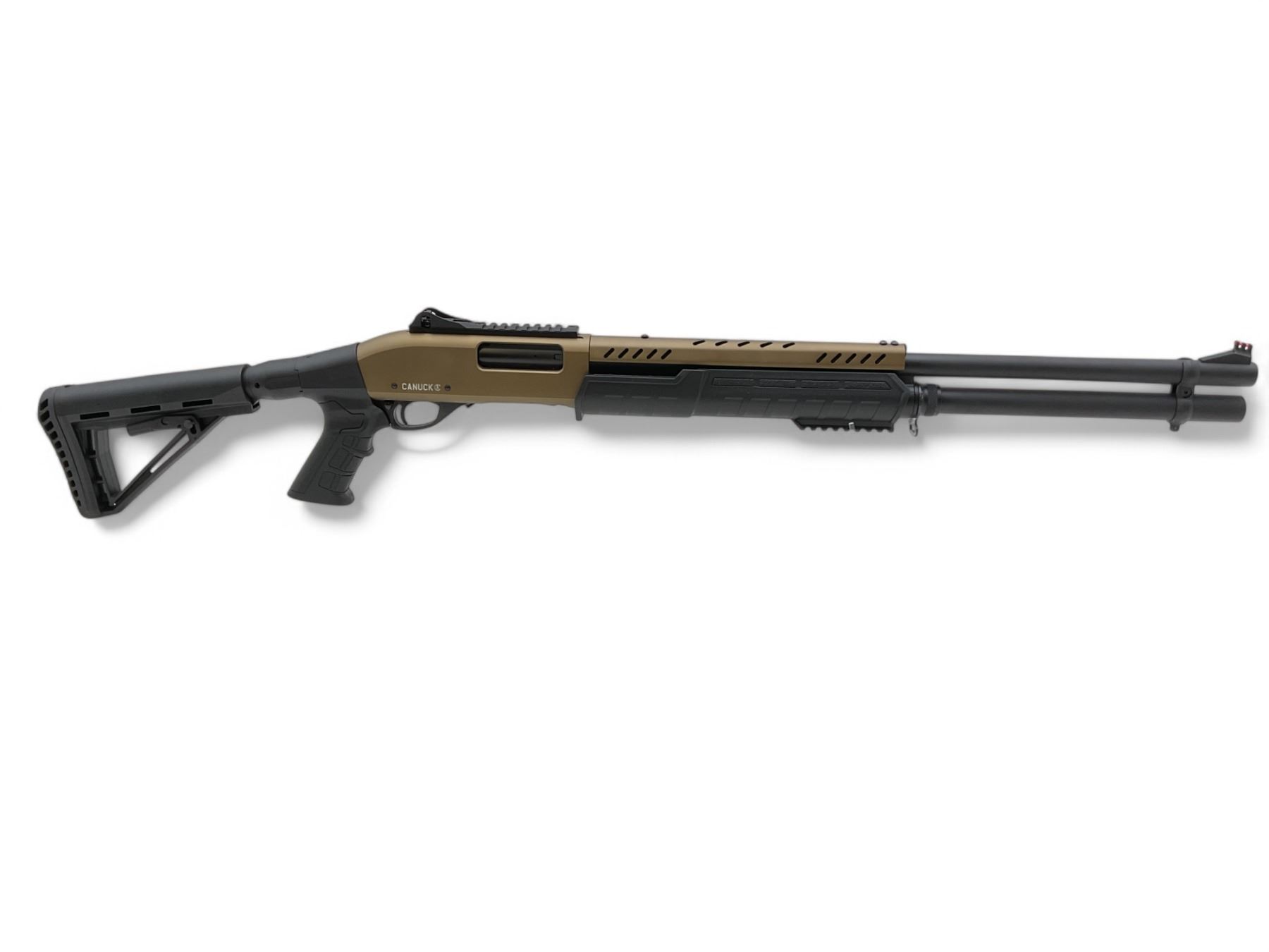 Canuck Sentry 12Ga Pump Action Shotgun 3" Chamber 24" Barrel With Pistol Grip Adjustable Stock Bronze, New. Adjustable stock; comes with a removable choke. Fiber optic front sight, adjustable rear sight. Receiver drilled and tapped with one piece rail installed. This is a non restricted firearm.
