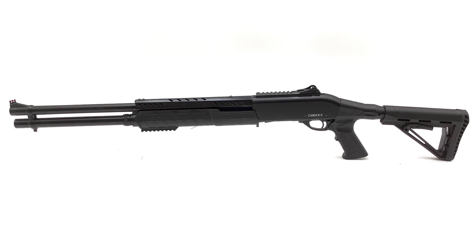 A new in the box Canuck Sentry Pump Action 12 Ga Shotgun 3". Black synthetic stock with a 23" barrel with heat shield and fiber optic front sight. Adjustable stock. Comes with 3 chokes and a muzzle brake. This is a non restricted firearm.