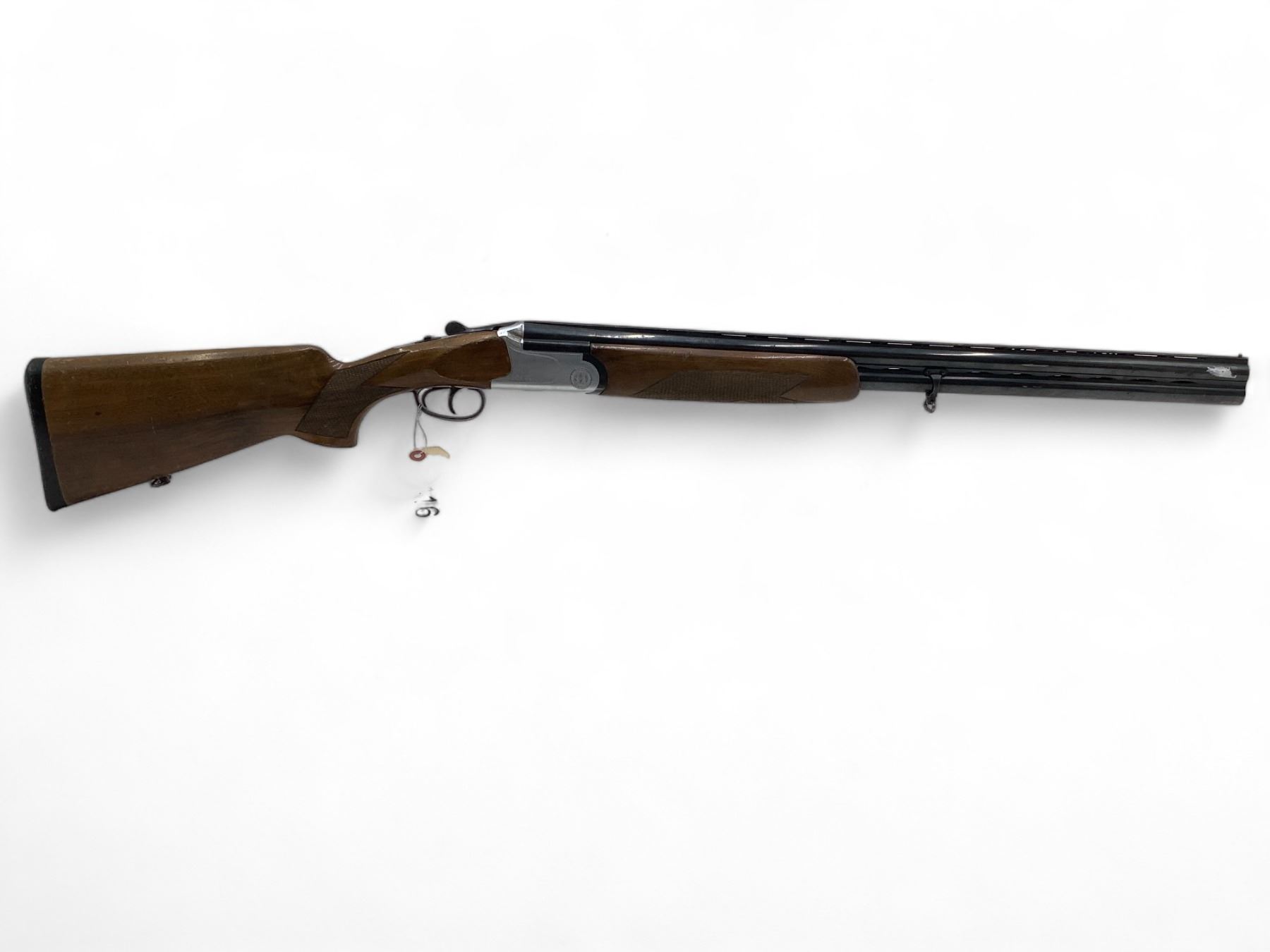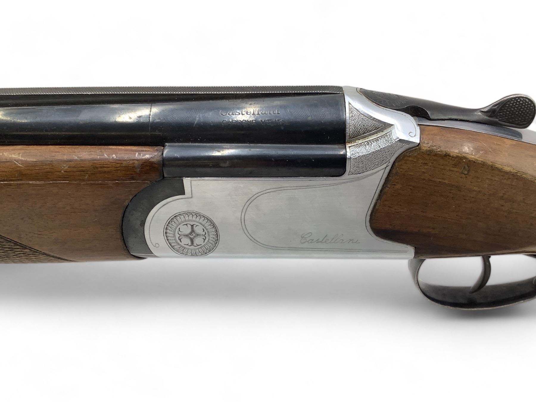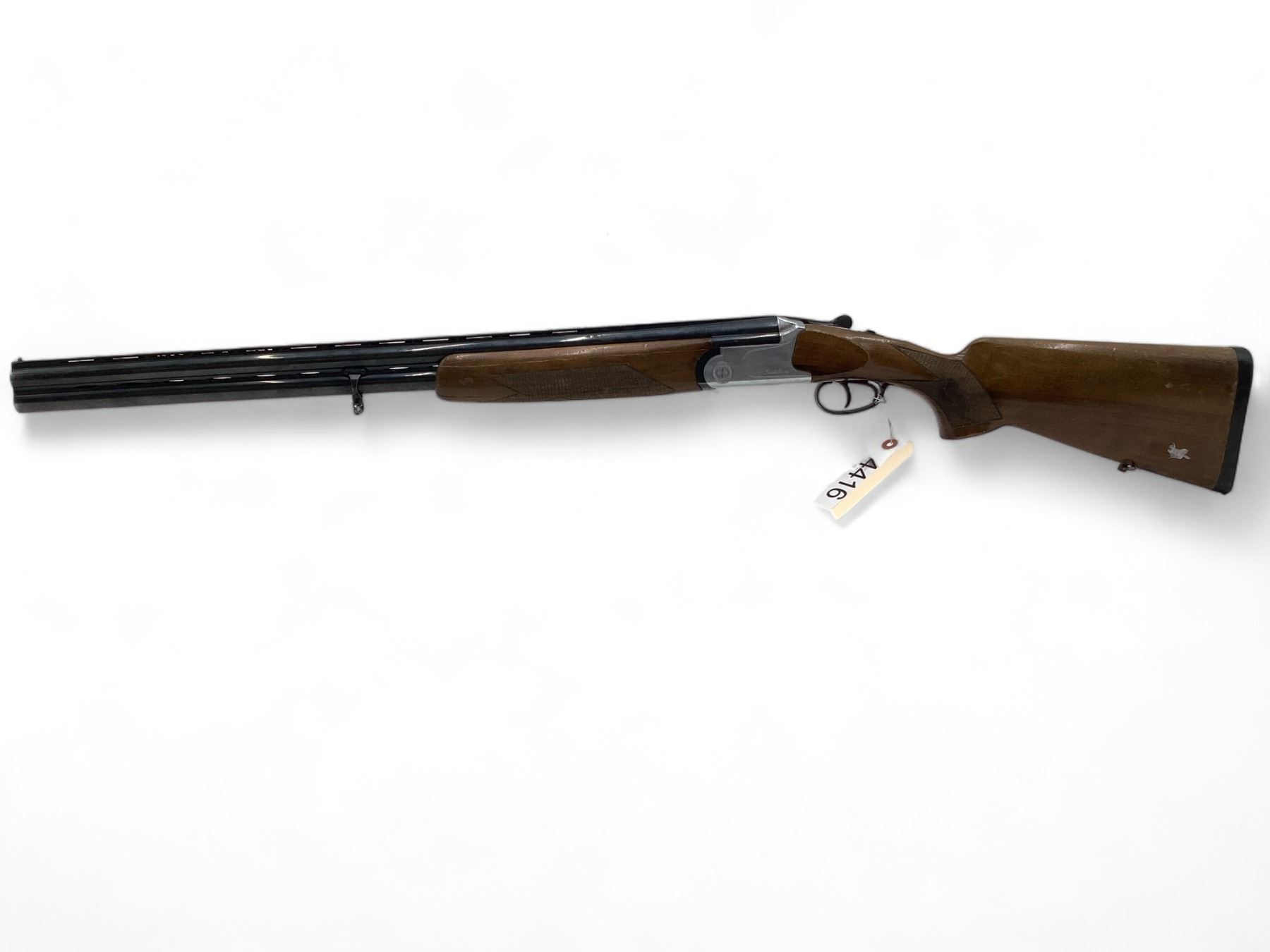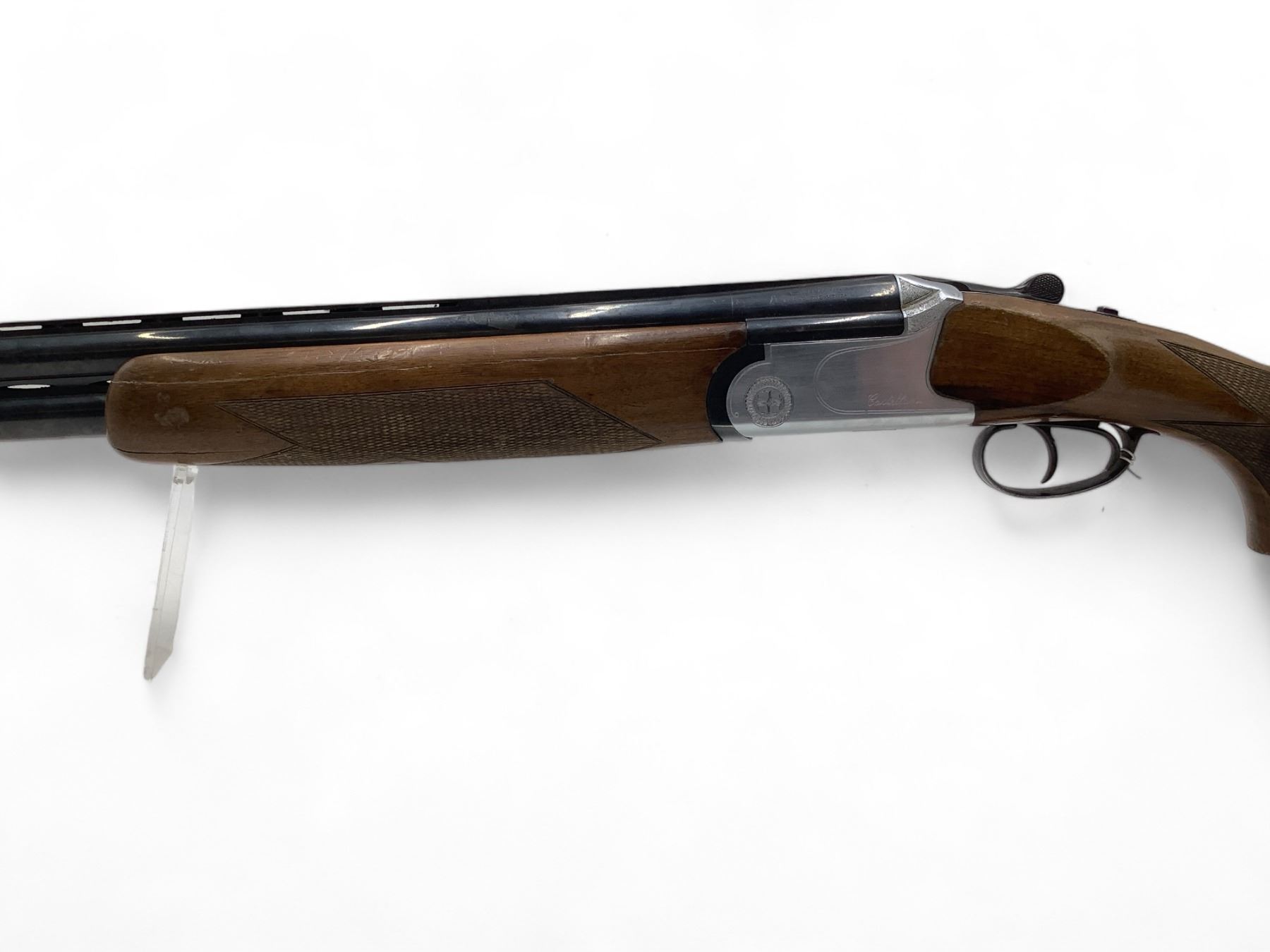 Castellani Over Under Shotgun 12Ga 27.5" Barrels Wood Stock. Vent rib with bead sight, fixed chokes. Double triggers. This is a non-restricted firearm.
