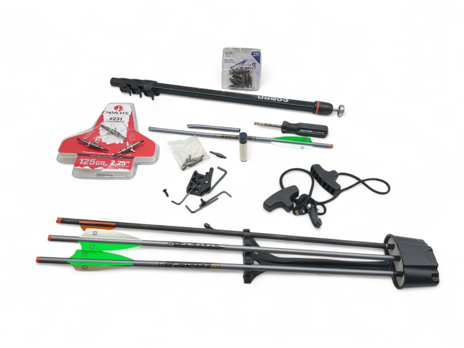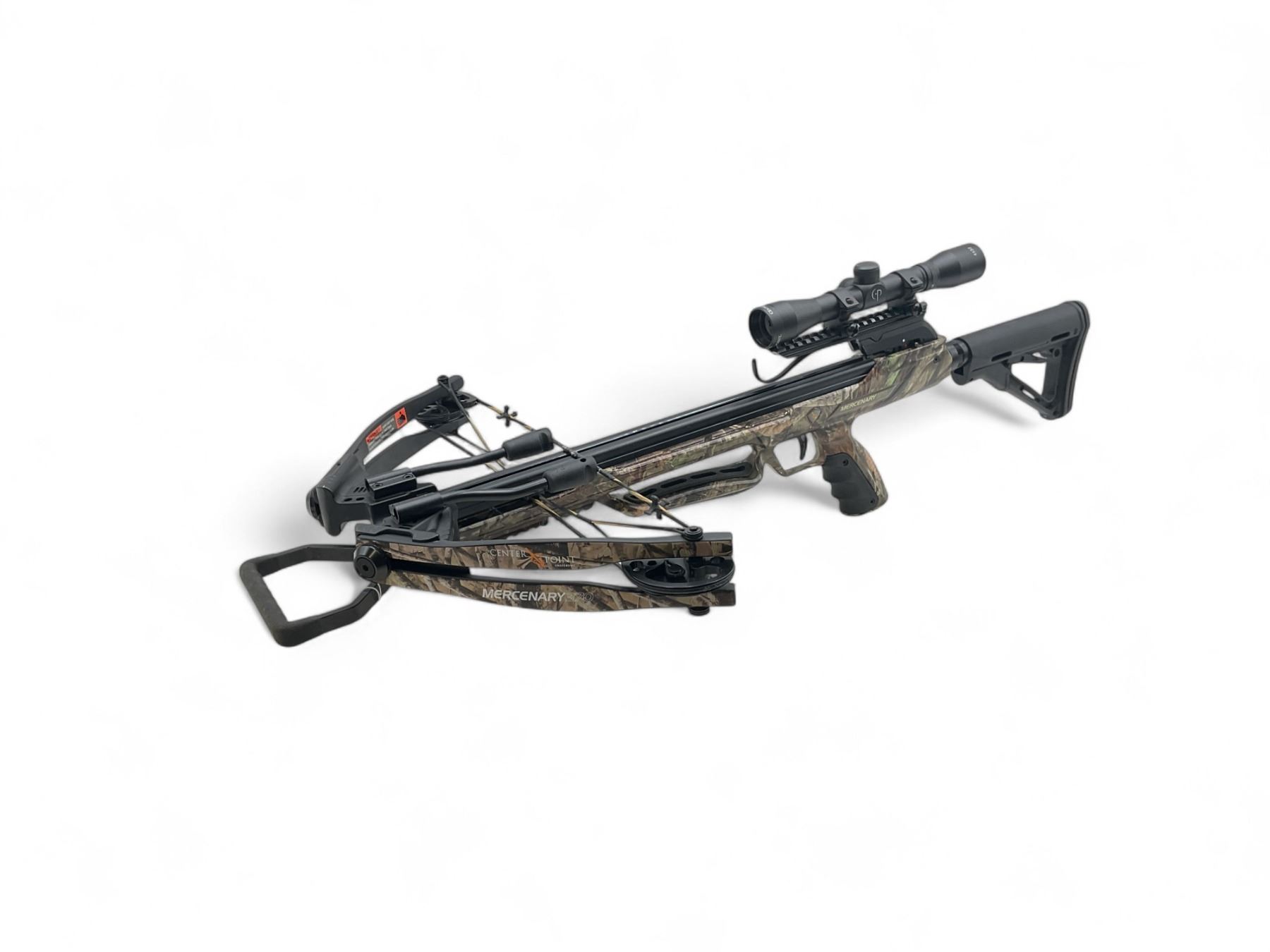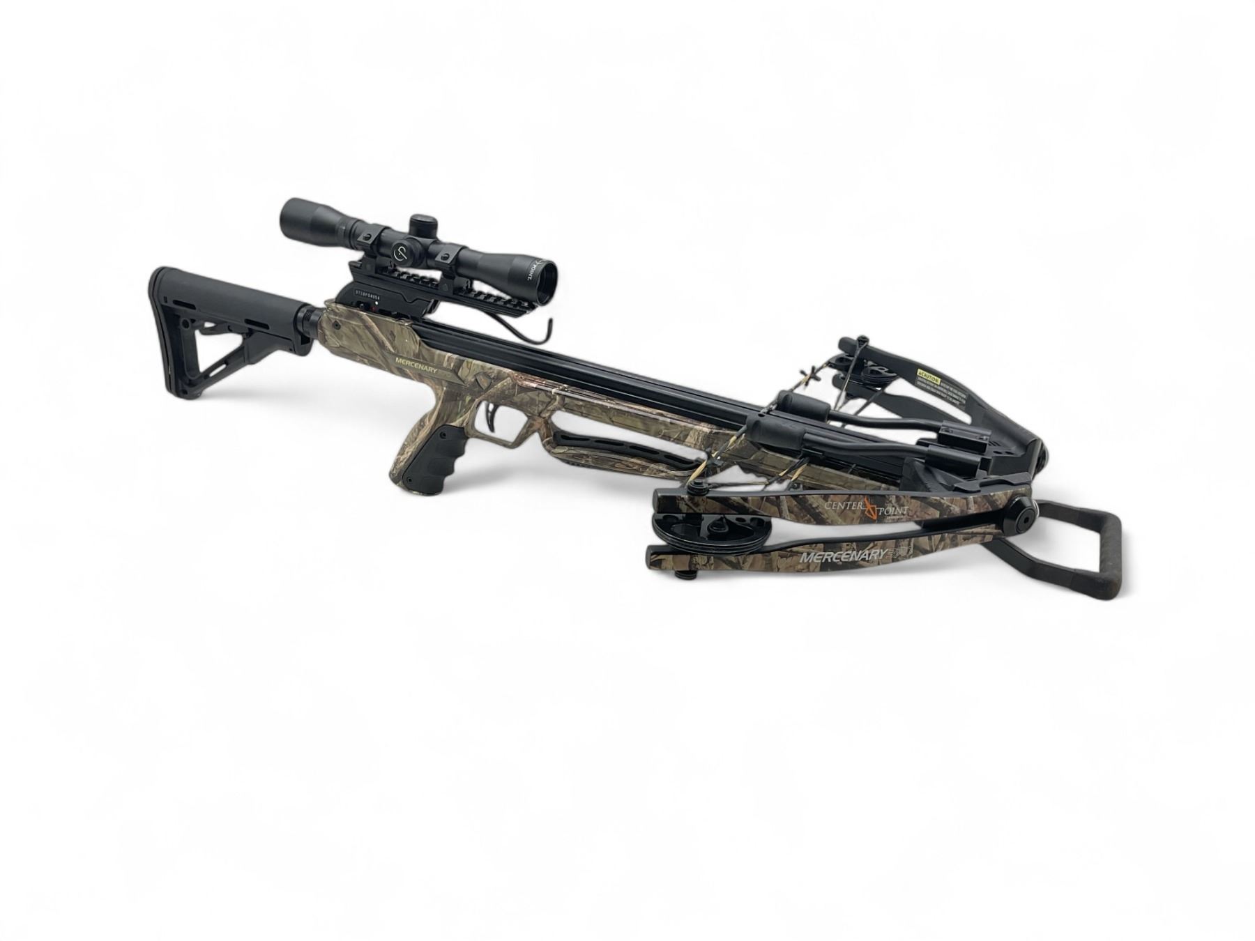 Centrepoint Camo Mercenary 370 Crossbow Adjustable Stock 4X32 Scope Quiver And Case. Quiver includes 3 bolts; also comes with cocking aid and accessories.