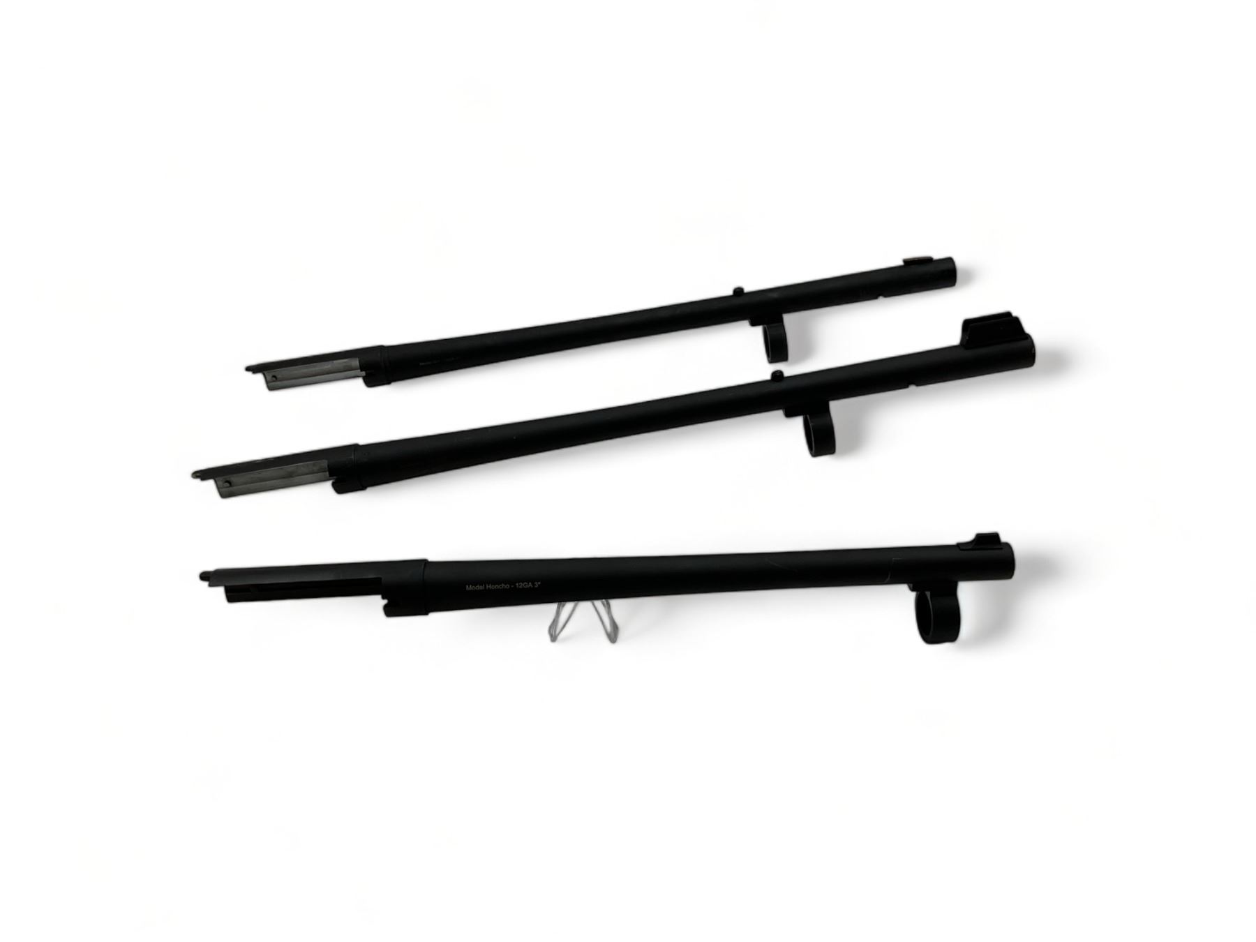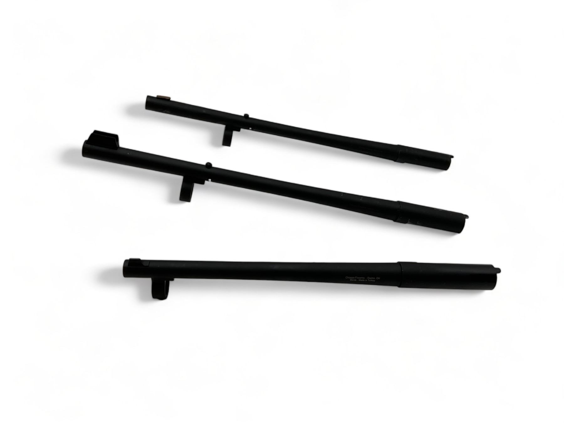 Charles Daly 12Ga Barrels Model 301 X 2 and Honcho X 1. Model 301 barrels (x2) are 18.5" long with 3" chamber. Both threaded for chokes but no choke included. Front sight broke on one, present on other. Both have broken stud mount. Honcho barrel is 3" chamber 14" length with fixed choke.