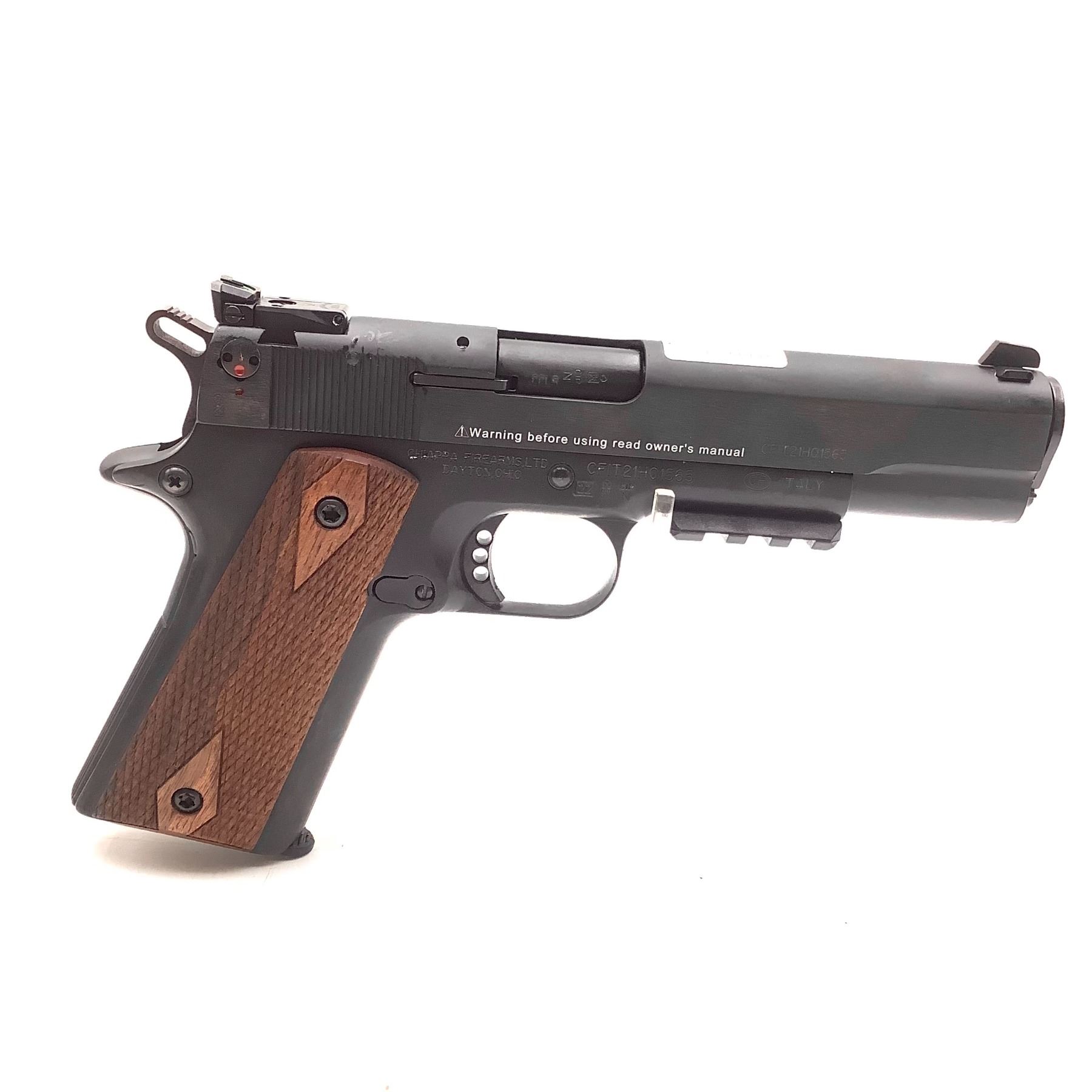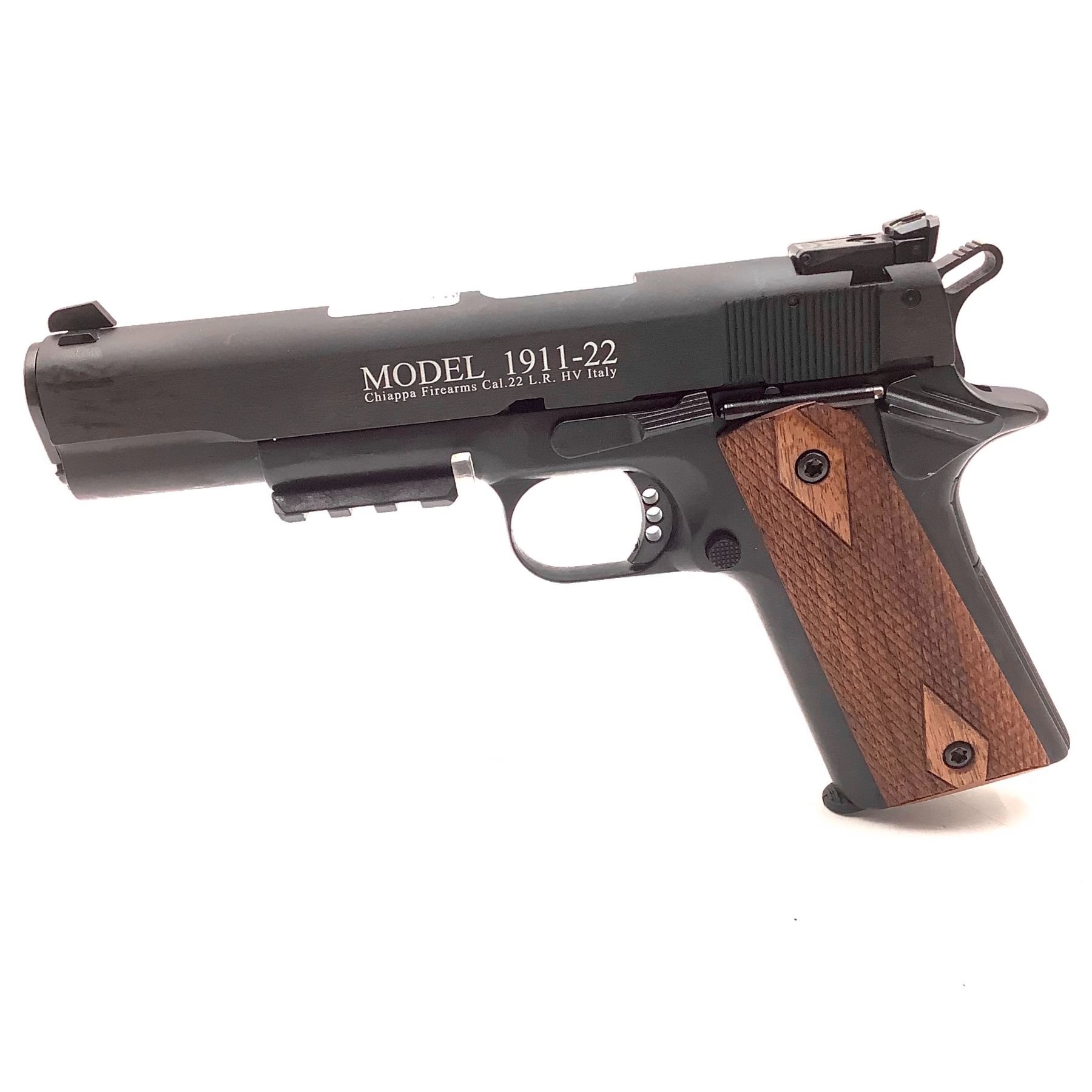 Chiappa 1911 Semi Auto Pistol 22LR 5" Barrel Black Wood Grips, New, Restricted. Fiber optic sights, two magazines and plastic case. This is a restricted firearm.