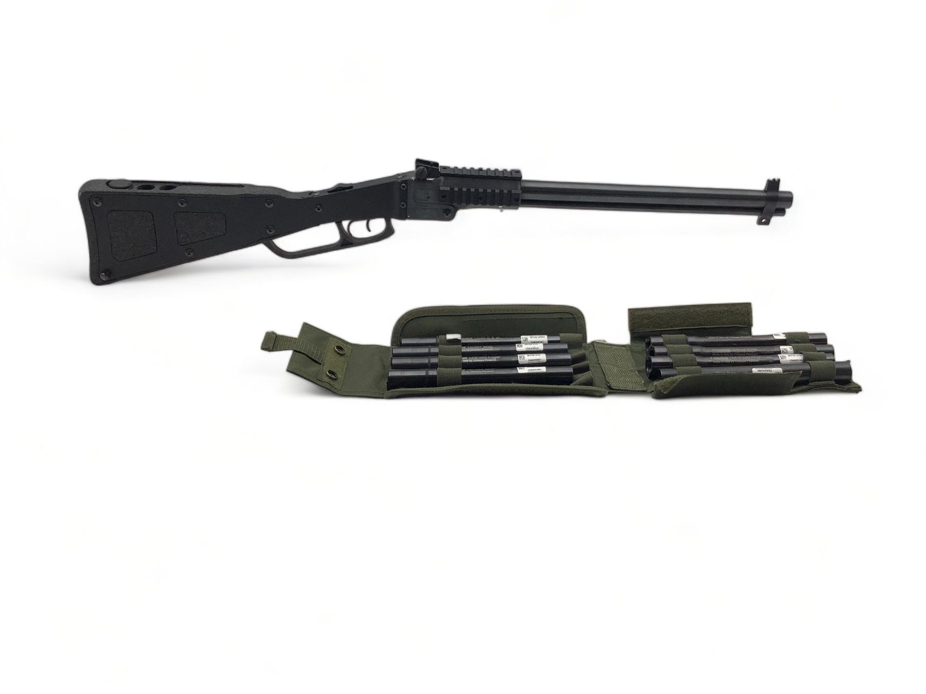 Chiappa X-Caliber Break Action 12Ga / 22LR Combination Gun 18.5" Barrel With Inserts. Front sight missing, adjustable rear sight. Comes with 8 caliber inserts for the 12Ga barrel: 20Ga, 410, 45ACP, 44 Rem Mag, 40 S&W, 357 Magnum, 9MM Luger and 380 ACP. This is a non-restricted firearm.