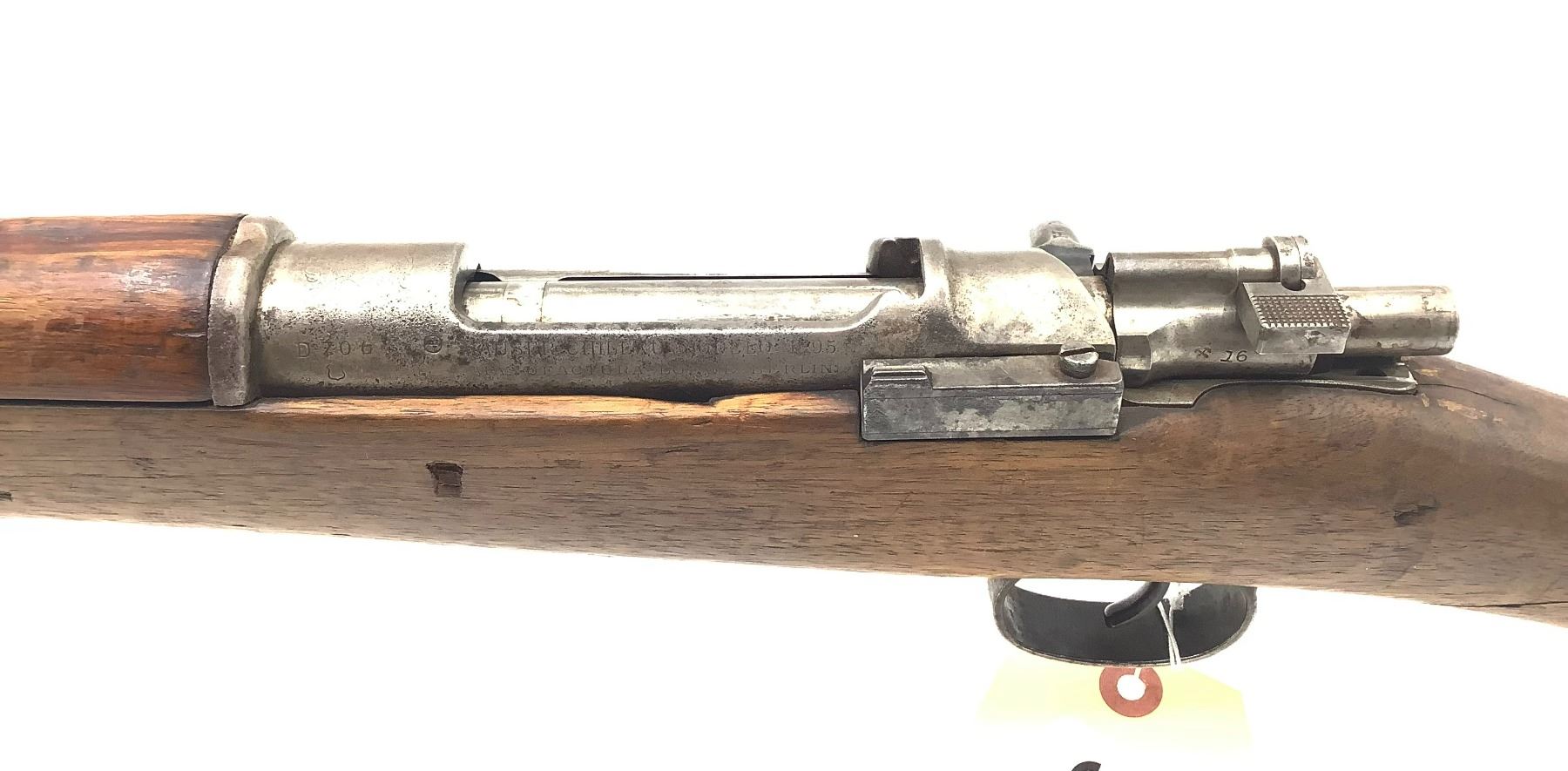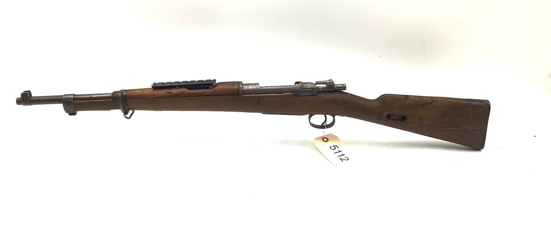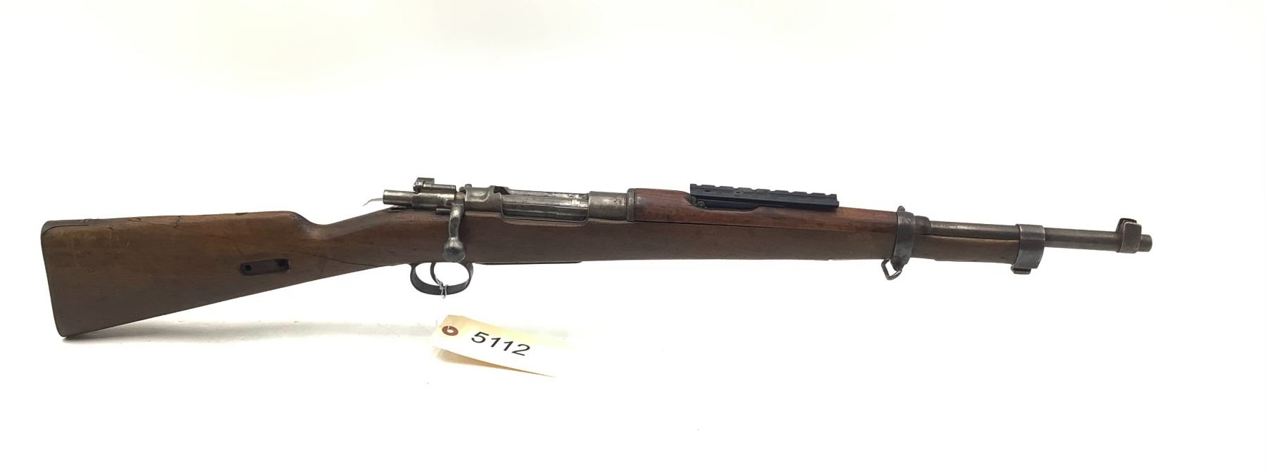 A Chilean Mauser Model 1895 bolt-action Cavalry Carbine manufactured by Ludwig Loewe in Berlin, 18" barrel with worn bore chambered in 7mm Mauser (7X57). Wooden stock is split from the rear trigger guard screw, missing saddle ring from buttstock and cleaning rod. Rear sight has been replaced with an after-market scope rail to accommodate a long eye relief scope or a red dot. Internal 5-round magazine.