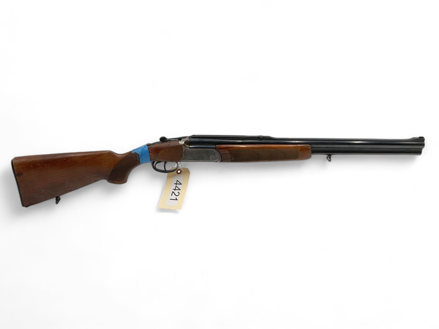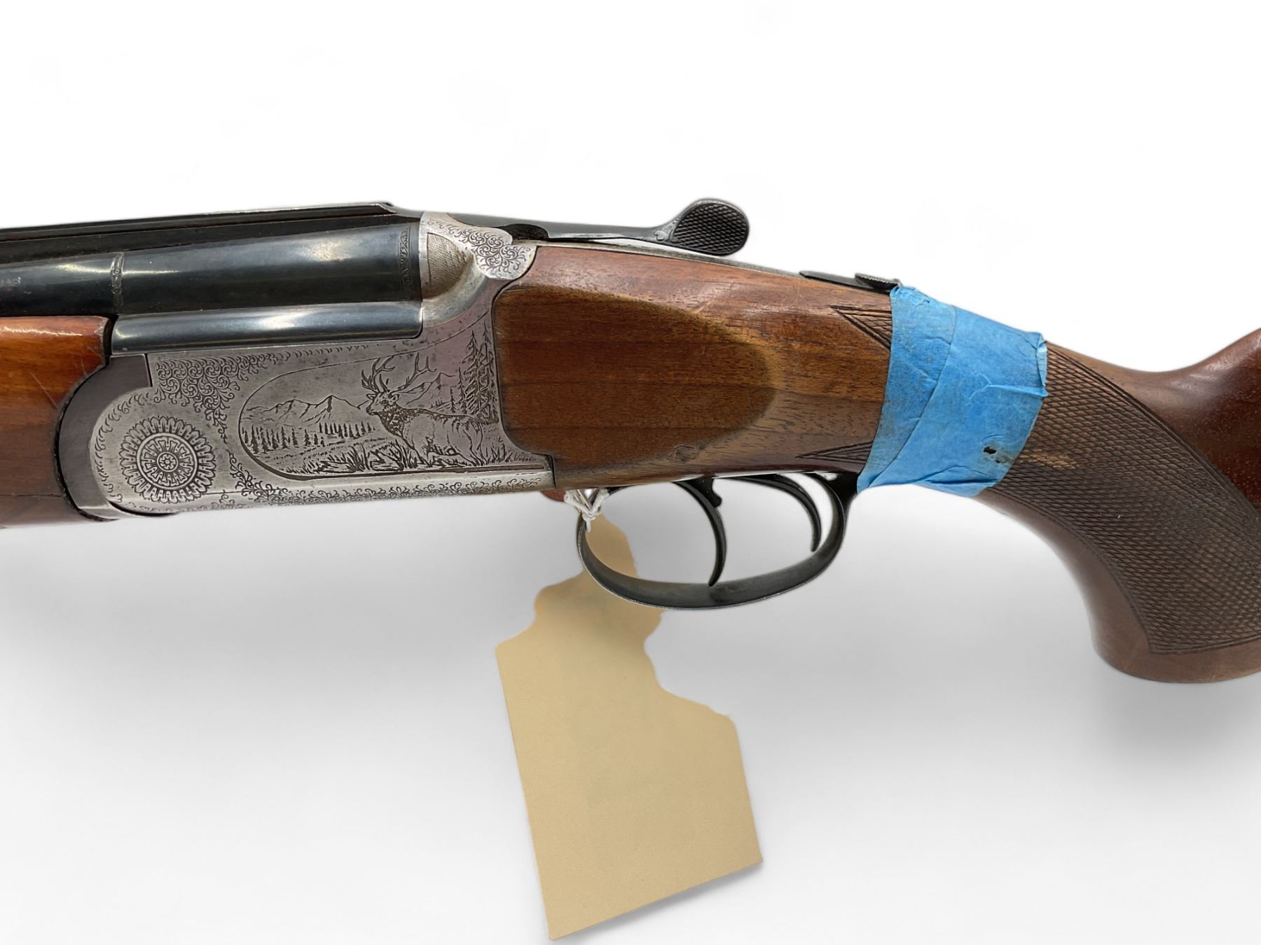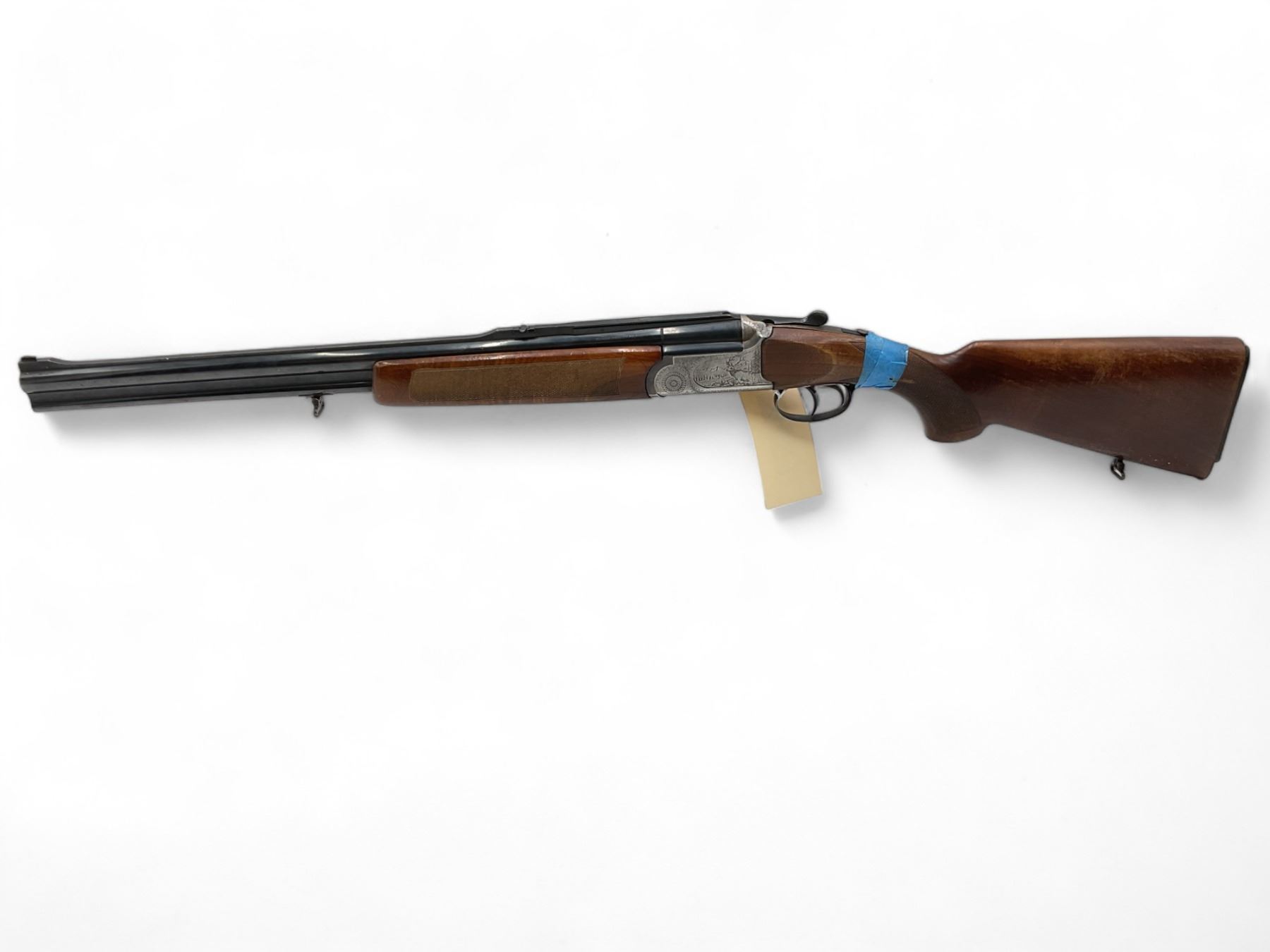 Classic Made By Fias Combination Gun 12Ga And 7X57R 24" Barrels Wood Stock. 12Ga barrel has 2.75" chamber. Fixed front sight, flip up rear sight. Wood forend is cracked and broken. Plastic butt plate is cracked and missing a section; rear stock is broken and cracked. Double triggers do not release when pulled, appears to be binding internally. This is a non-restricted firearm.