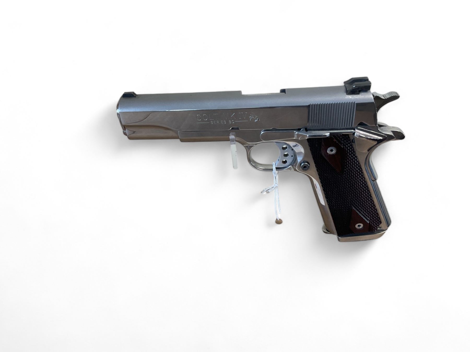 Colt Mk IV Series 80 Semi Auto Pistol 45 ACP 5" Barrel Wood Grips, Restricted. Comes with one detachable magazine. Fixed sights, guide rod appears to have been upgraded. This is a restricted firearm and can only be sold to exempted individuals under the new firearms legislation, other businesses, export, deactivated for a fee of $250, or stripped and sold without the frame for an additional $95 fee.