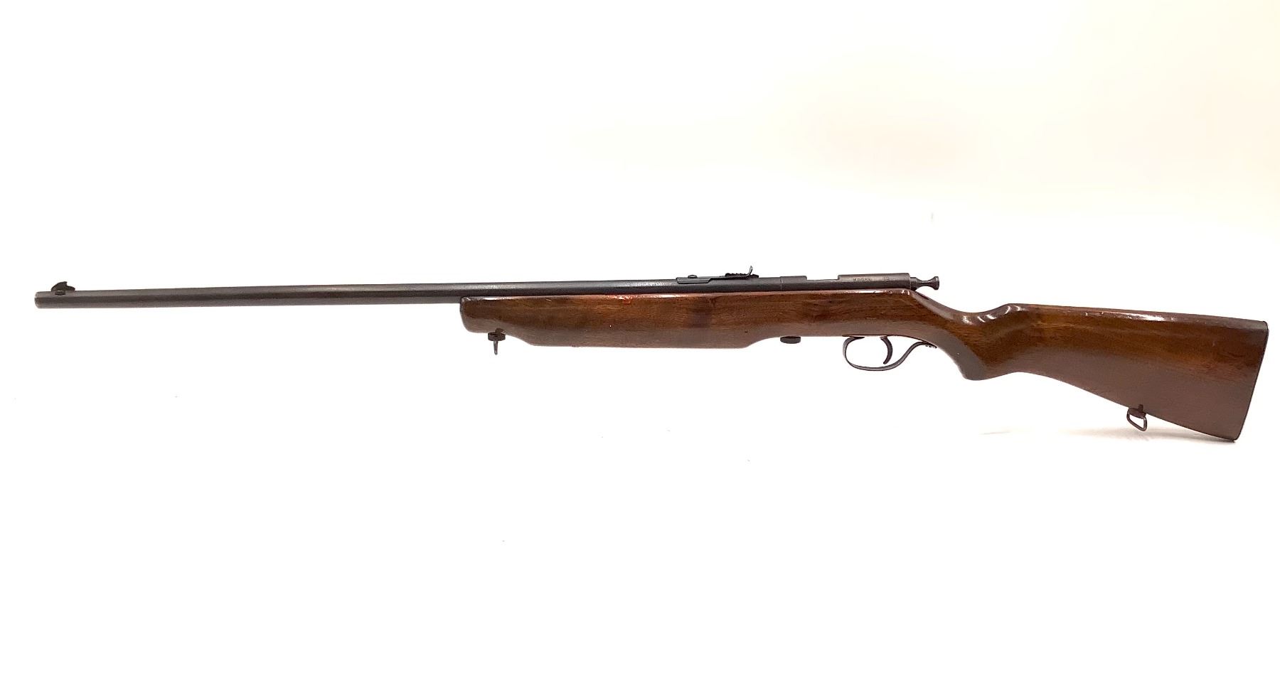 Cooey Model 75 Single Shot Rifle 22 LR 27" Barrel Wood Stock. Sling mounts, open sights. Wood stocks have scratches, nicks and marks. Metal finish is worn with pitting and scratches. This is a non-restricted firearm.
