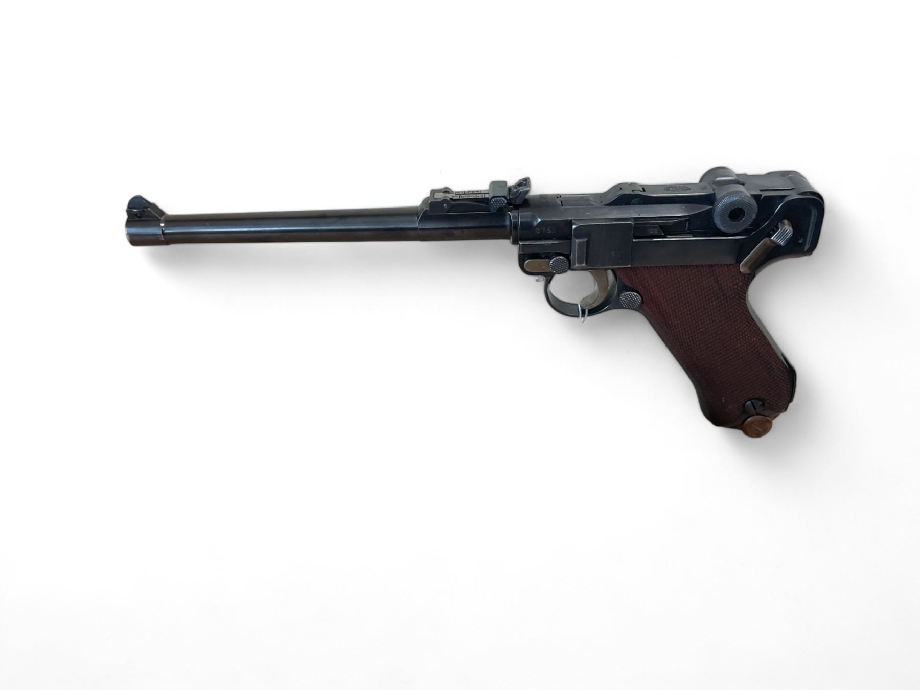 DWM Luger 1914 Artillery Semi Auto Pistol 9MM 8" Barrel Wood Grips, Restricted. Comes with a detachable magazine. Fixed front sight, adjustable rear sight. Stamped 1915 on barrel. This is a restricted firearm and can only be sold to exempted individuals under the new firearms legislation, other businesses, export, deactivated for a fee of $250, or stripped and sold without the frame for an additional $95 fee.