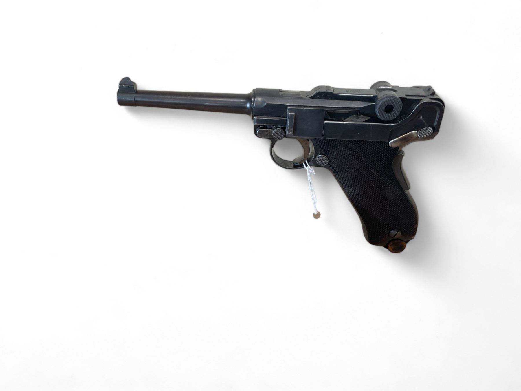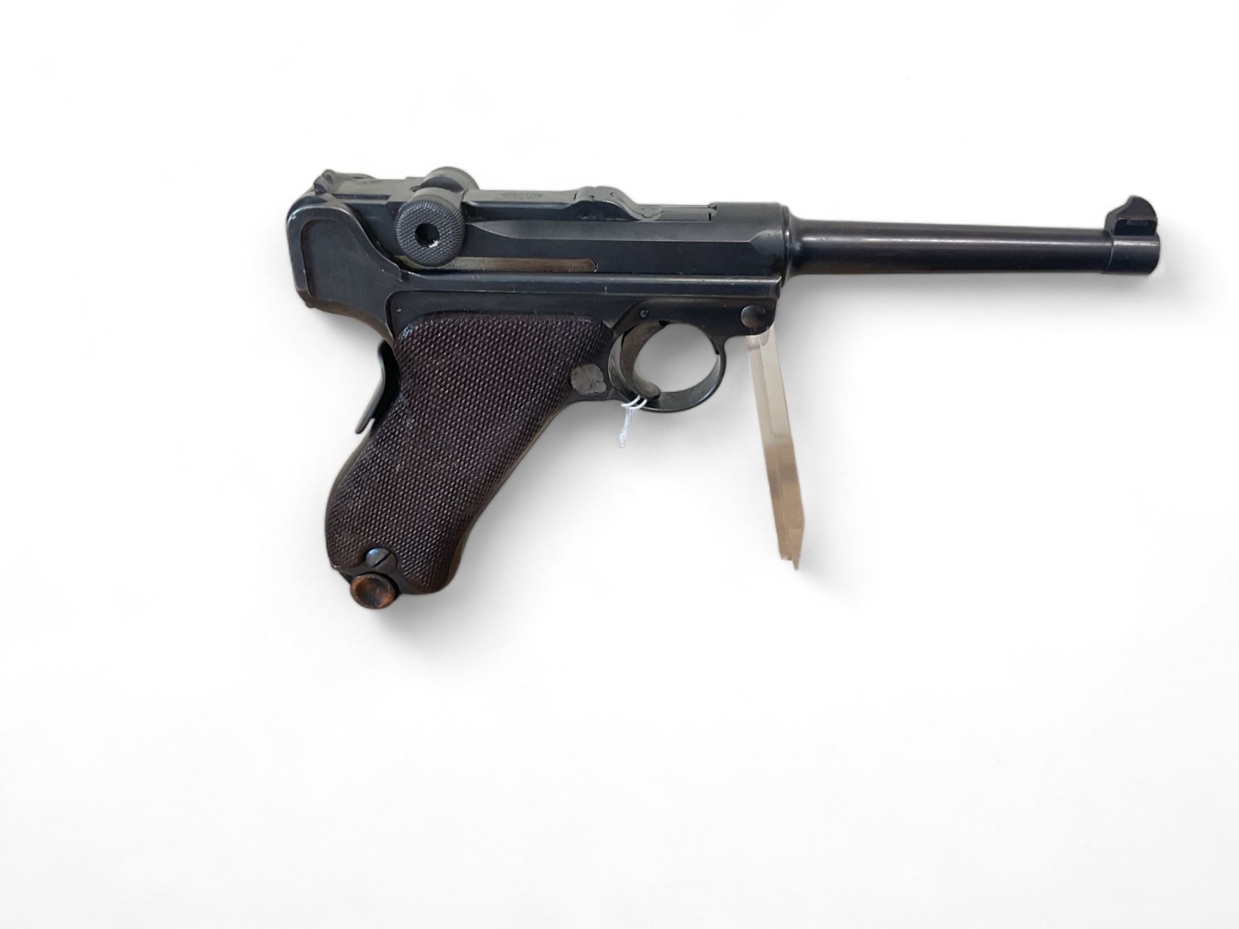 DWM Luger P08 Semi Auto Pistol 7.65MM (.30 Luger) 4.7" Barrel Wood Grips, Prohibited. Comes with one magazine. Grip safety, fixed sights. This is a prohibited firearm and can only be sold to exempted individuals under the new firearms legislation, other businesses, export, deactivated for a fee of $250, or stripped and sold without the frame and barrel for an additional $95 fee.