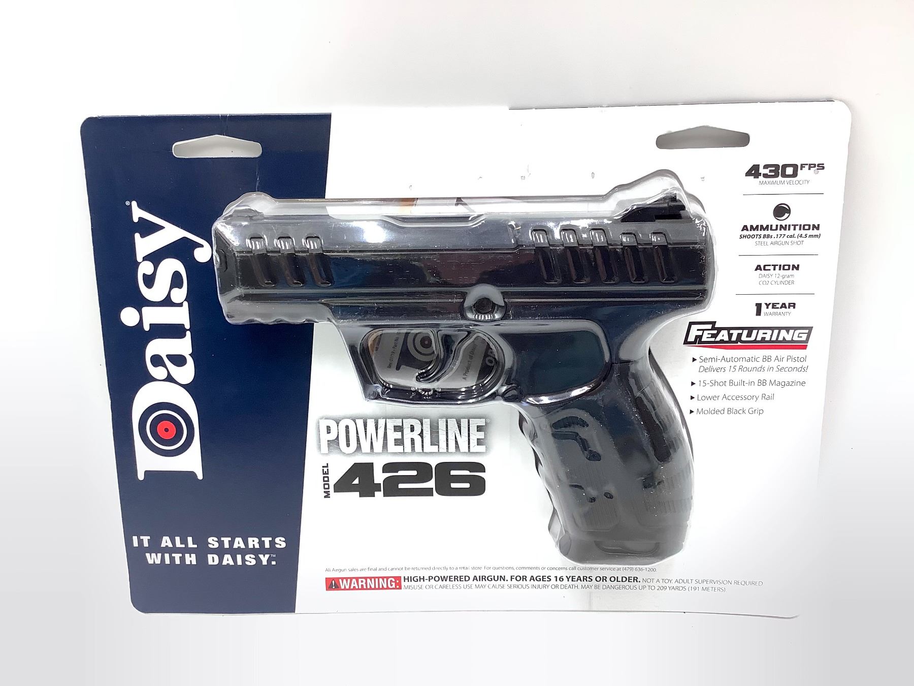 Daisy Powerline 426 .177 Cal BB CO2 Air Pistol 430 fps, New. This Powerline air pistol features a blade and ramp front/fixed front sights and is powered by CO2. You must be over 18 years of age to purchase this item.
