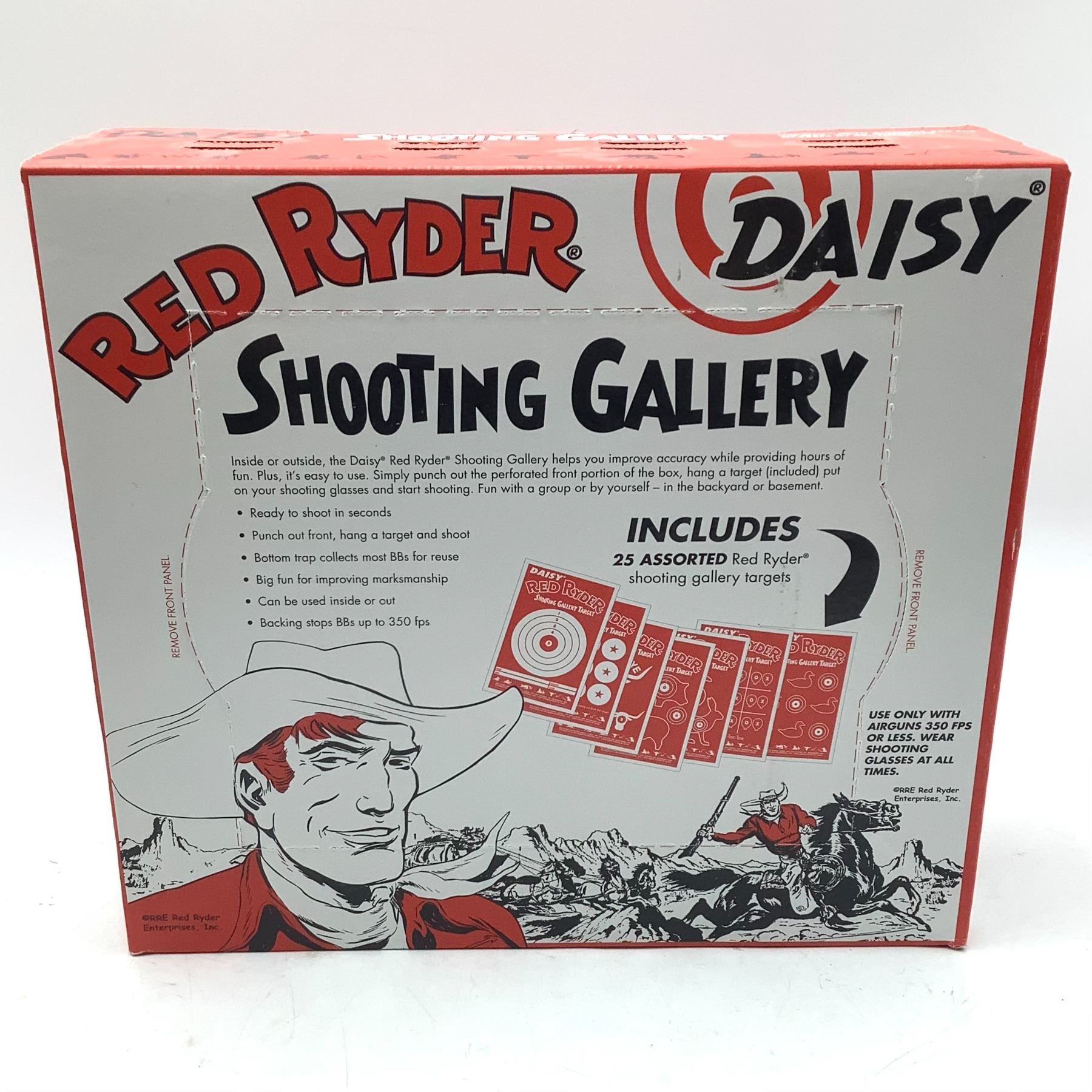 Daisy Red Ryder Shooting Gallery Combo Kit, New. The front portion of the box punches out to hang the included targets; the rubber backing stops BBs (up to 350 fps) and a bottom trap collects BBs to be used again. The Red Ryder Shooting Gallery Combo includes one 350-count BB tube, Red Ryder shooting glasses, Red Ryder gun sleeve, and 10 gallery targets