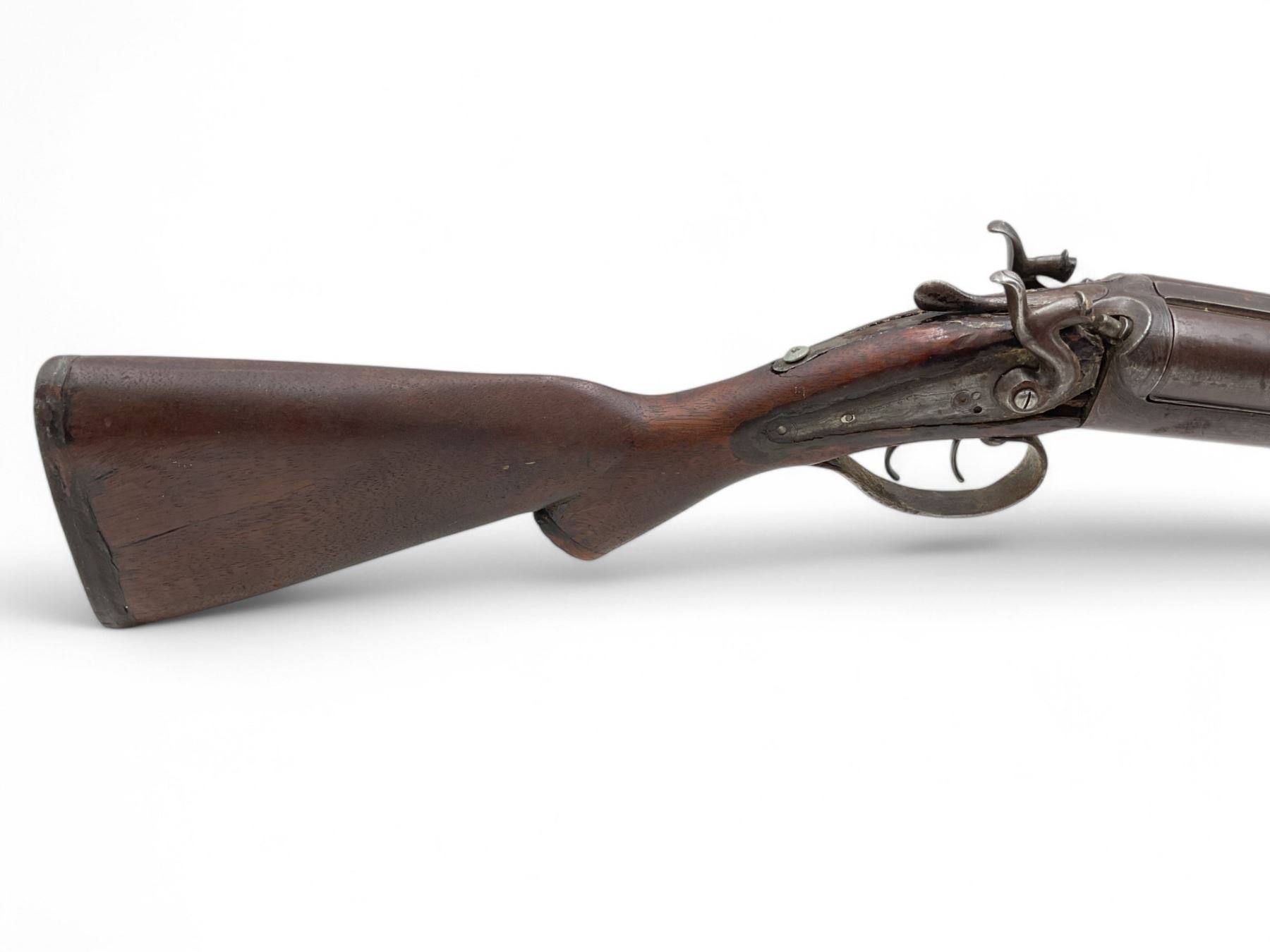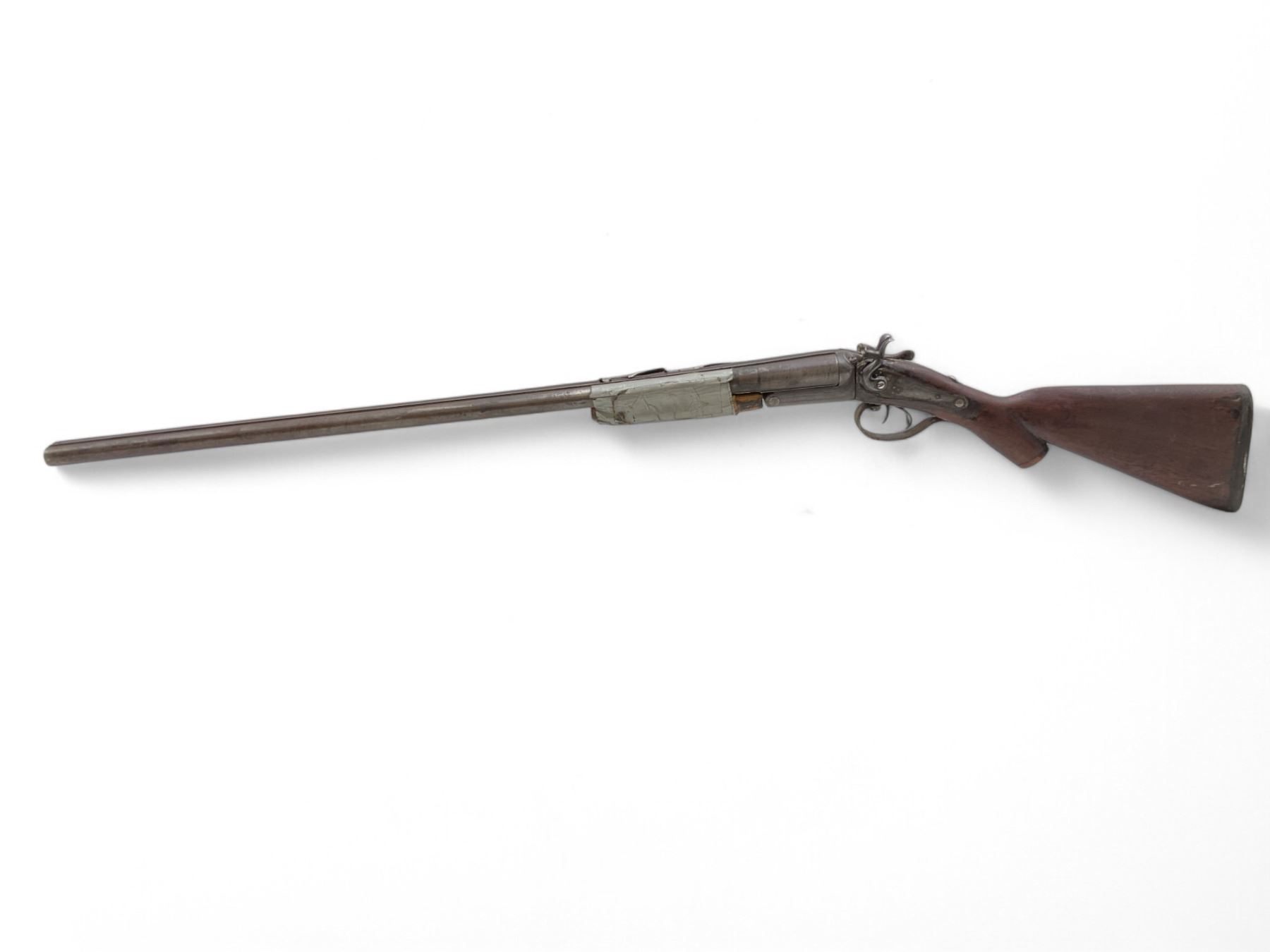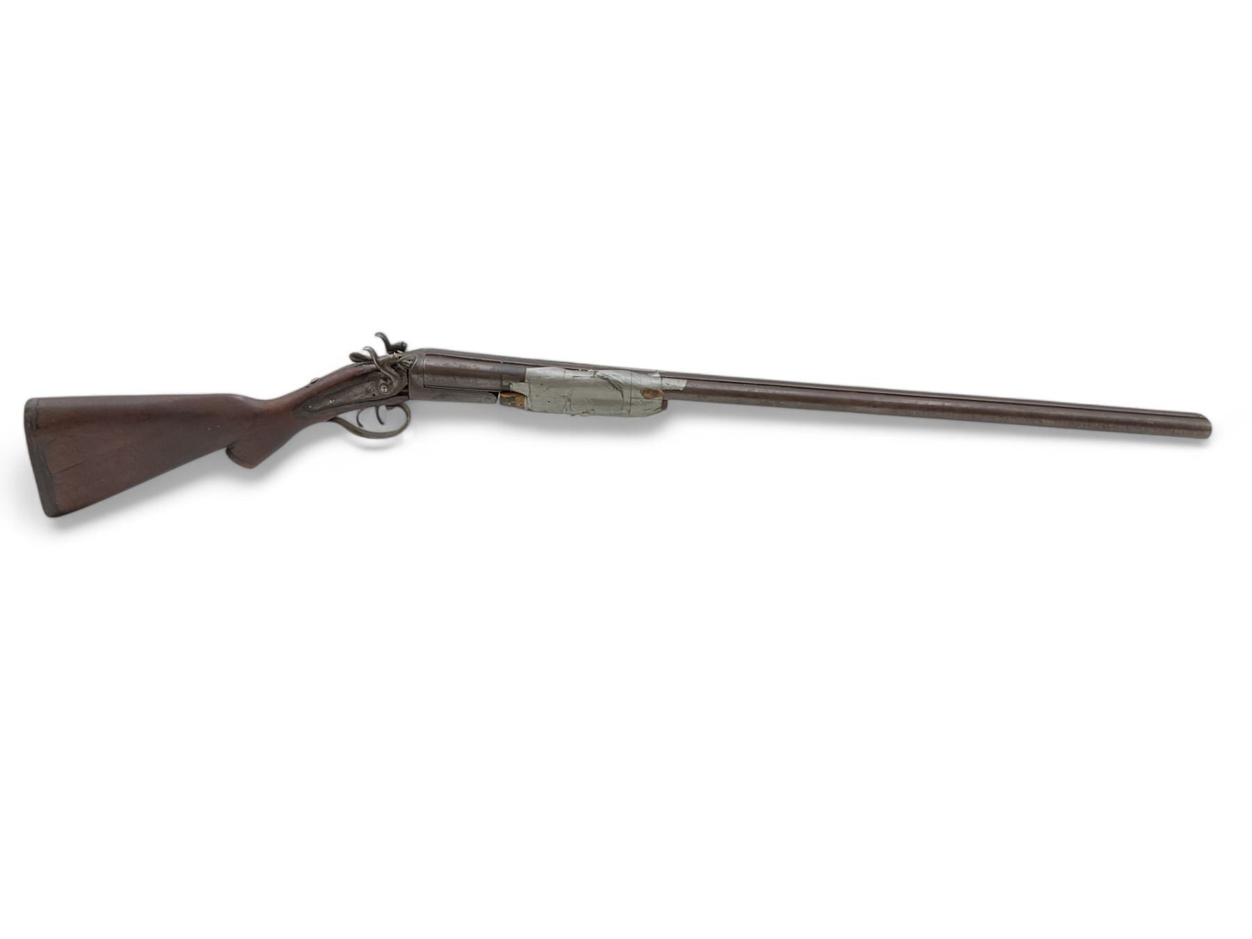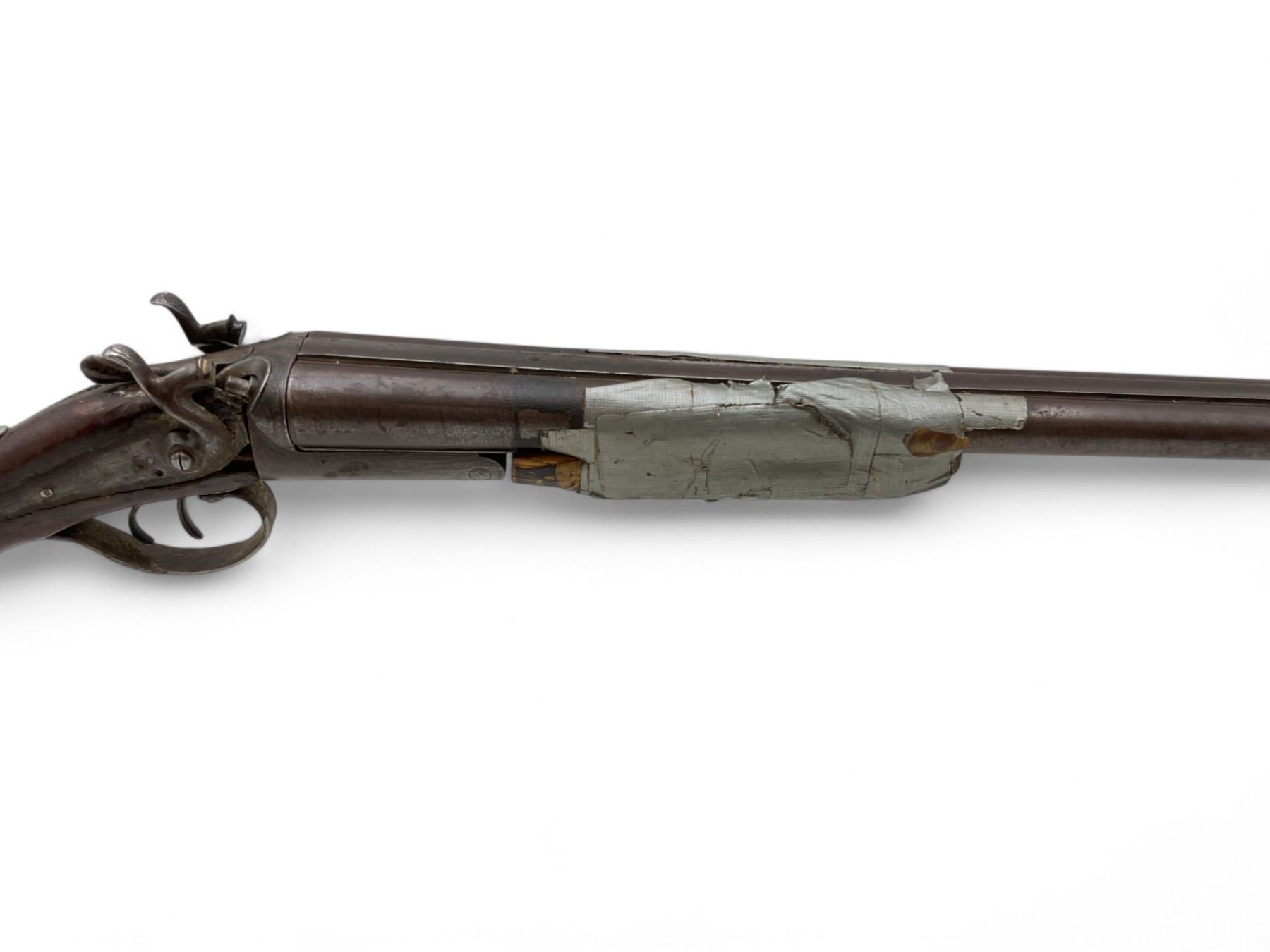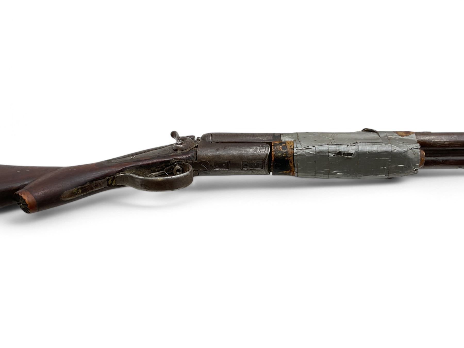 E. James And Co Side By Side 12Ga Shotgun 31" Barrels Wood Stock. Fixed chokes; double triggers. Rear stock is not original and is not fitted correctly. Wood forend is secured with duct tape and is not the correct one. Exposed hammers; right hammer does not lock back. Overall in poor condition; may be missing other parts. This is a non-restricted firearm.