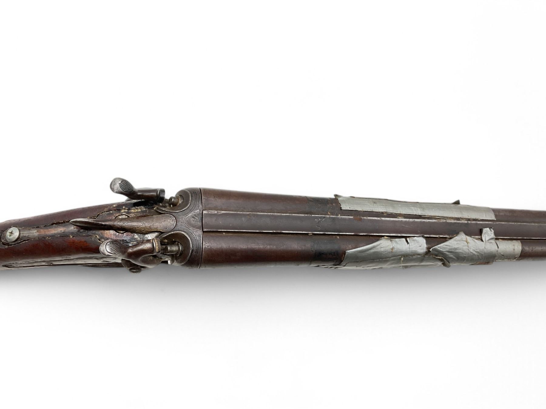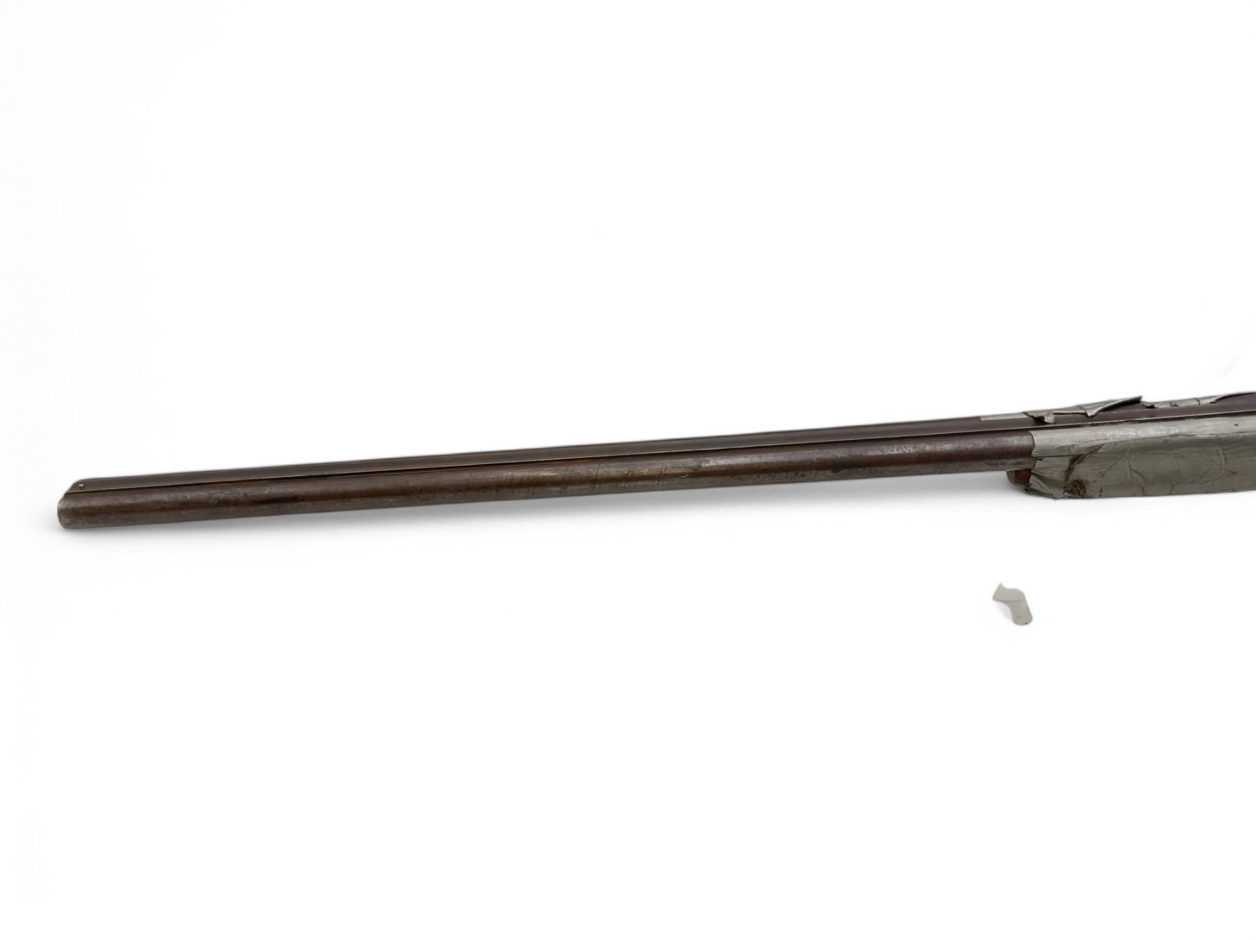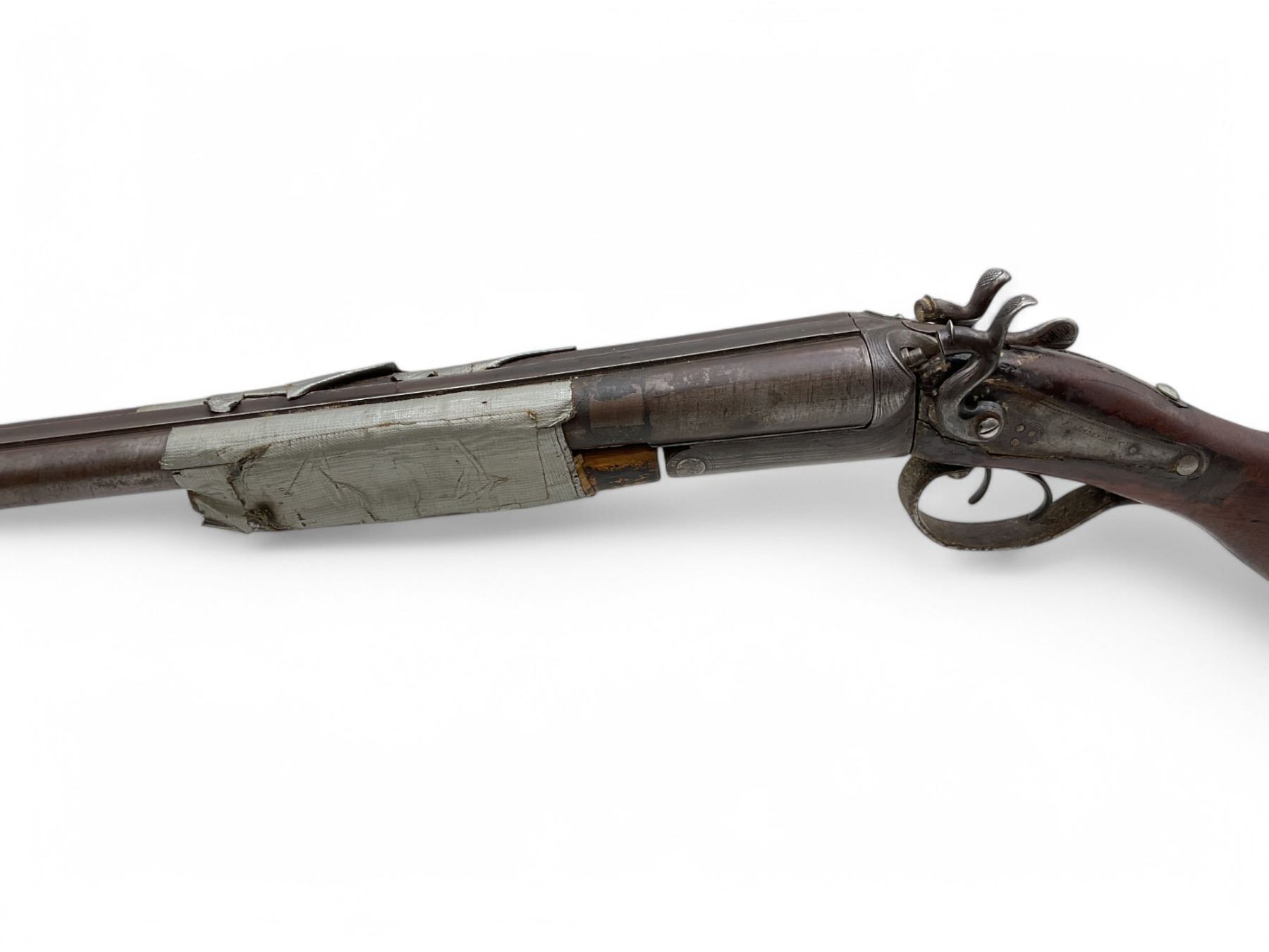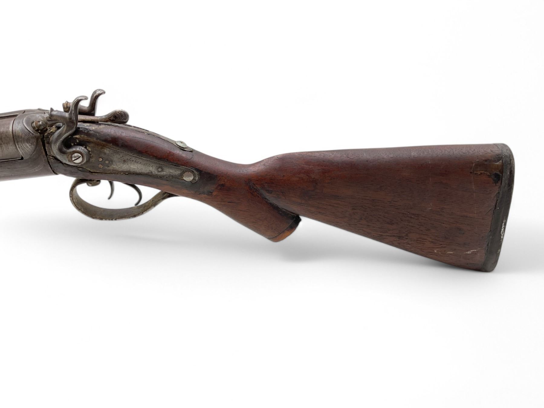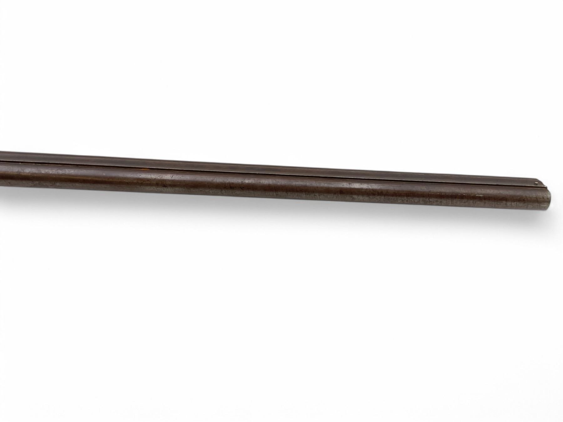 E. James And Co Side By Side 12Ga Shotgun 31" Barrels Wood Stock. Fixed chokes; double triggers. Rear stock is not original and is not fitted correctly. Wood forend is secured with duct tape and is not the correct one. Exposed hammers; right hammer does not lock back. Overall in poor condition; may be missing other parts. This is a non-restricted firearm.