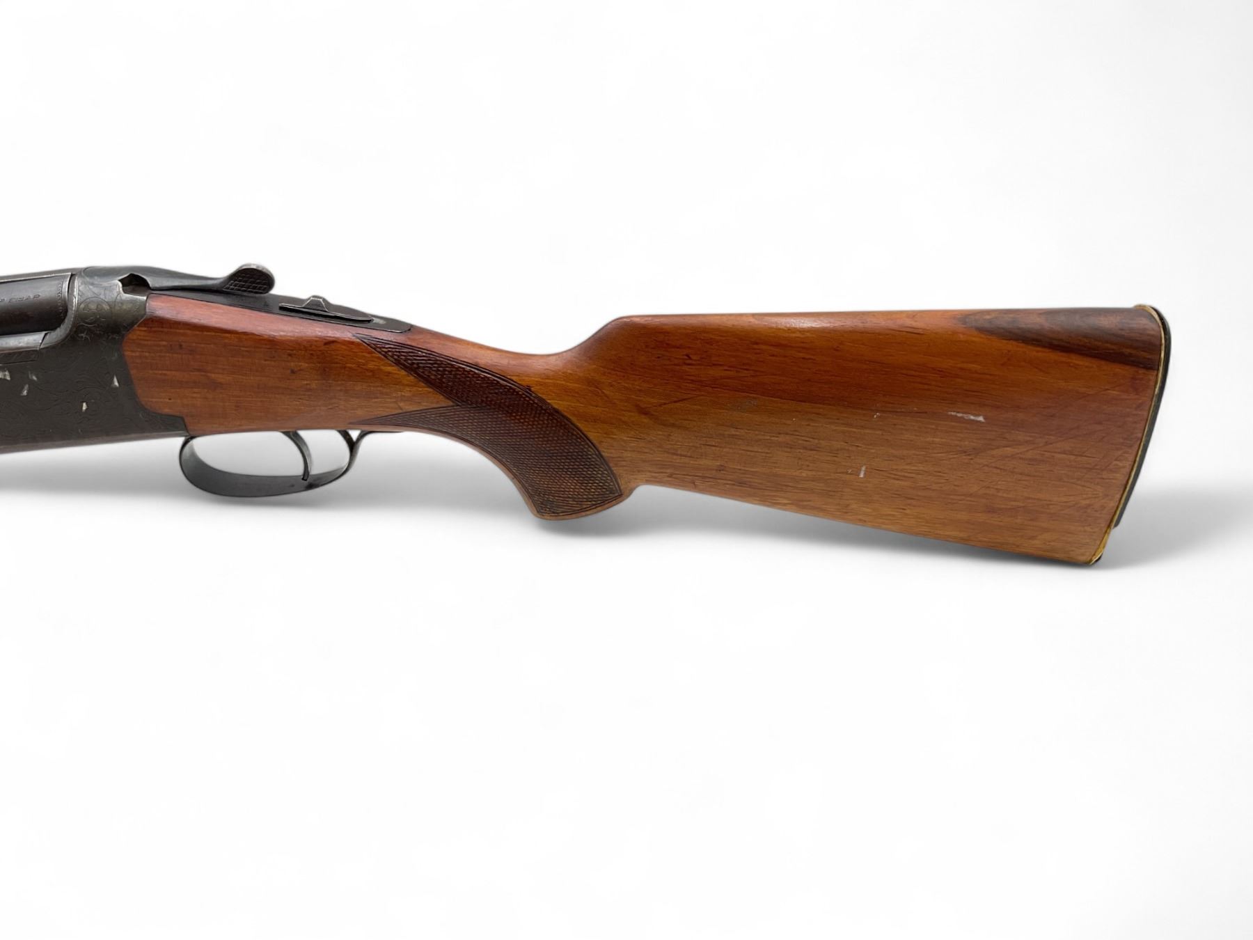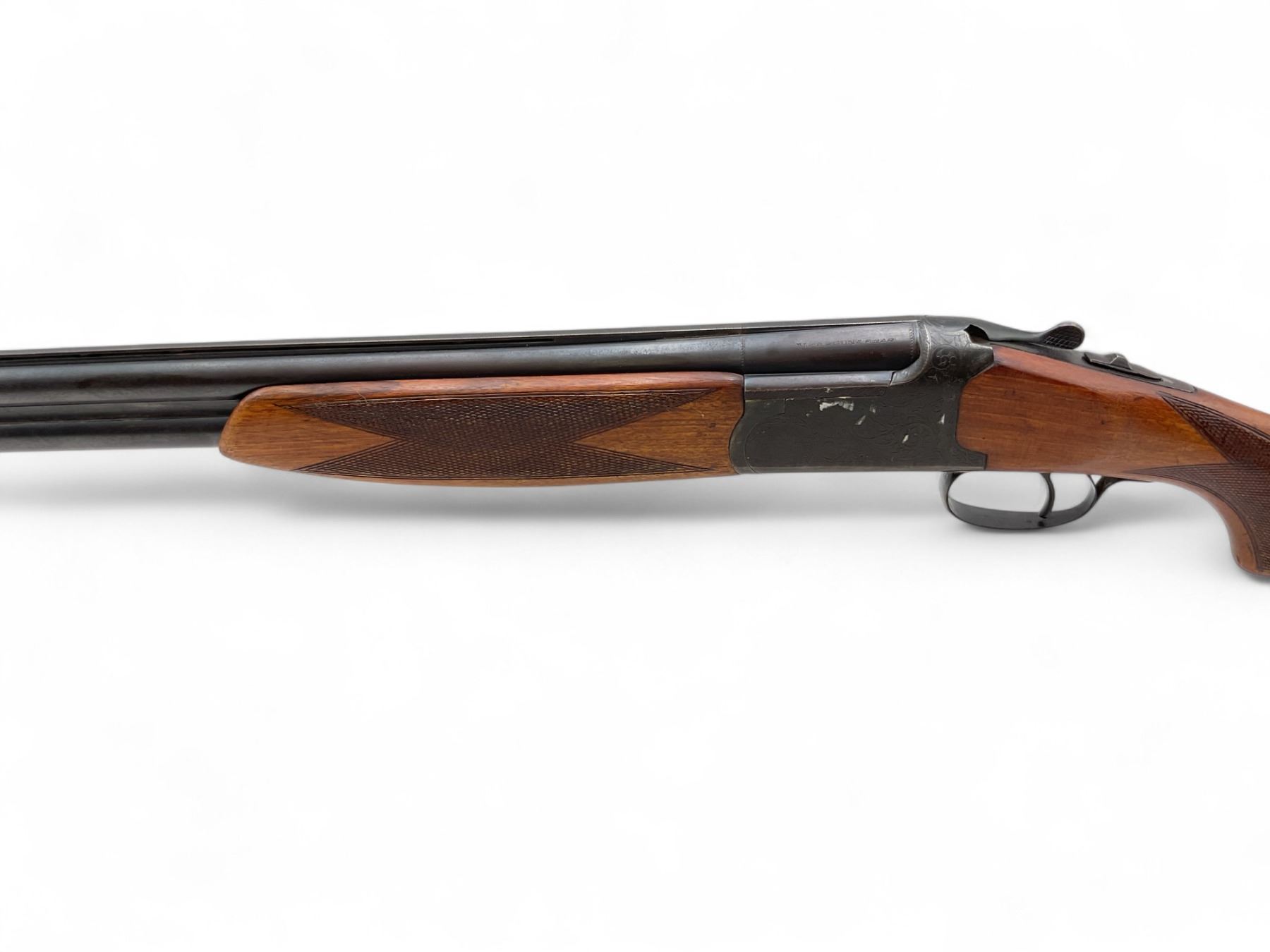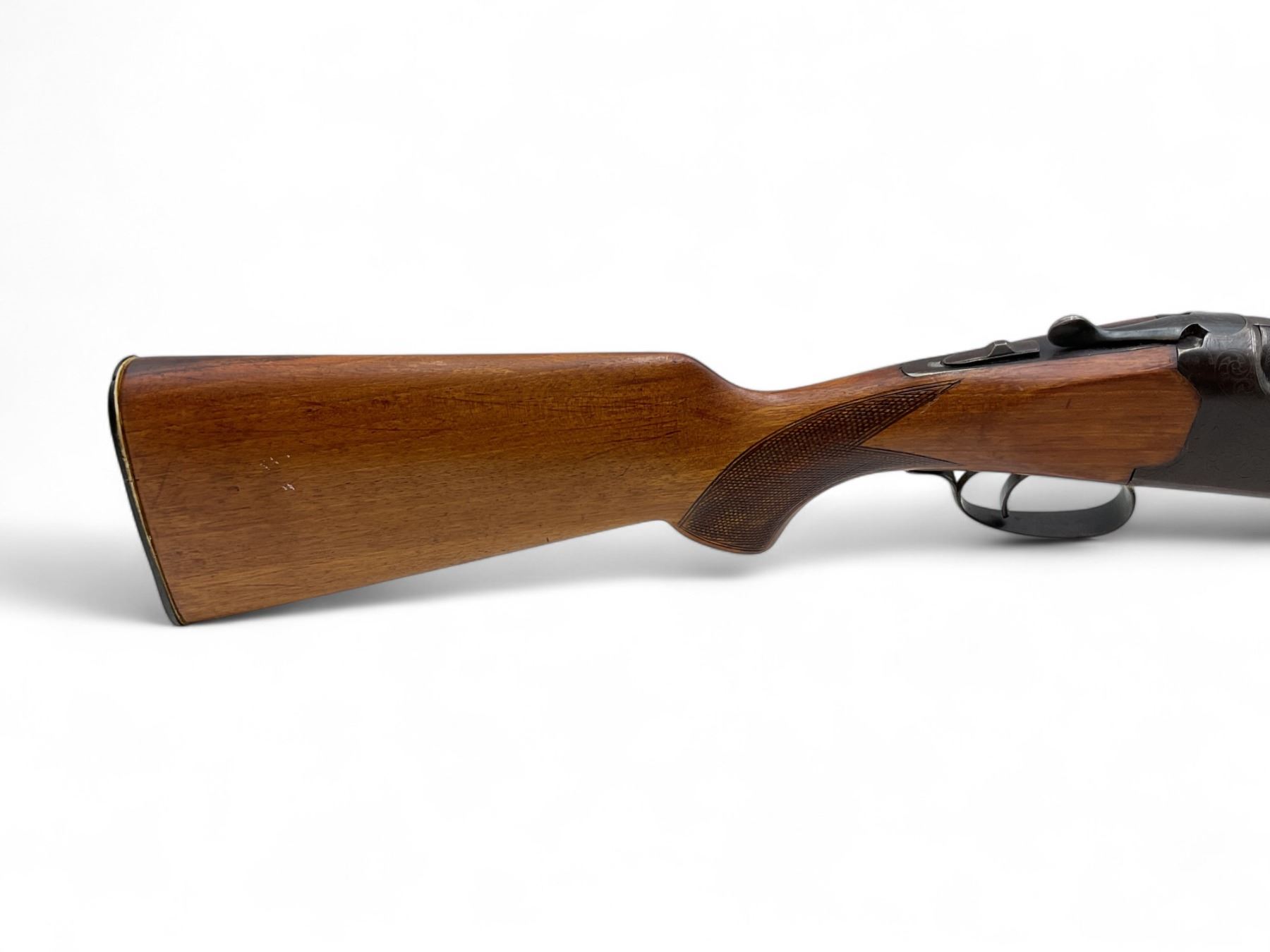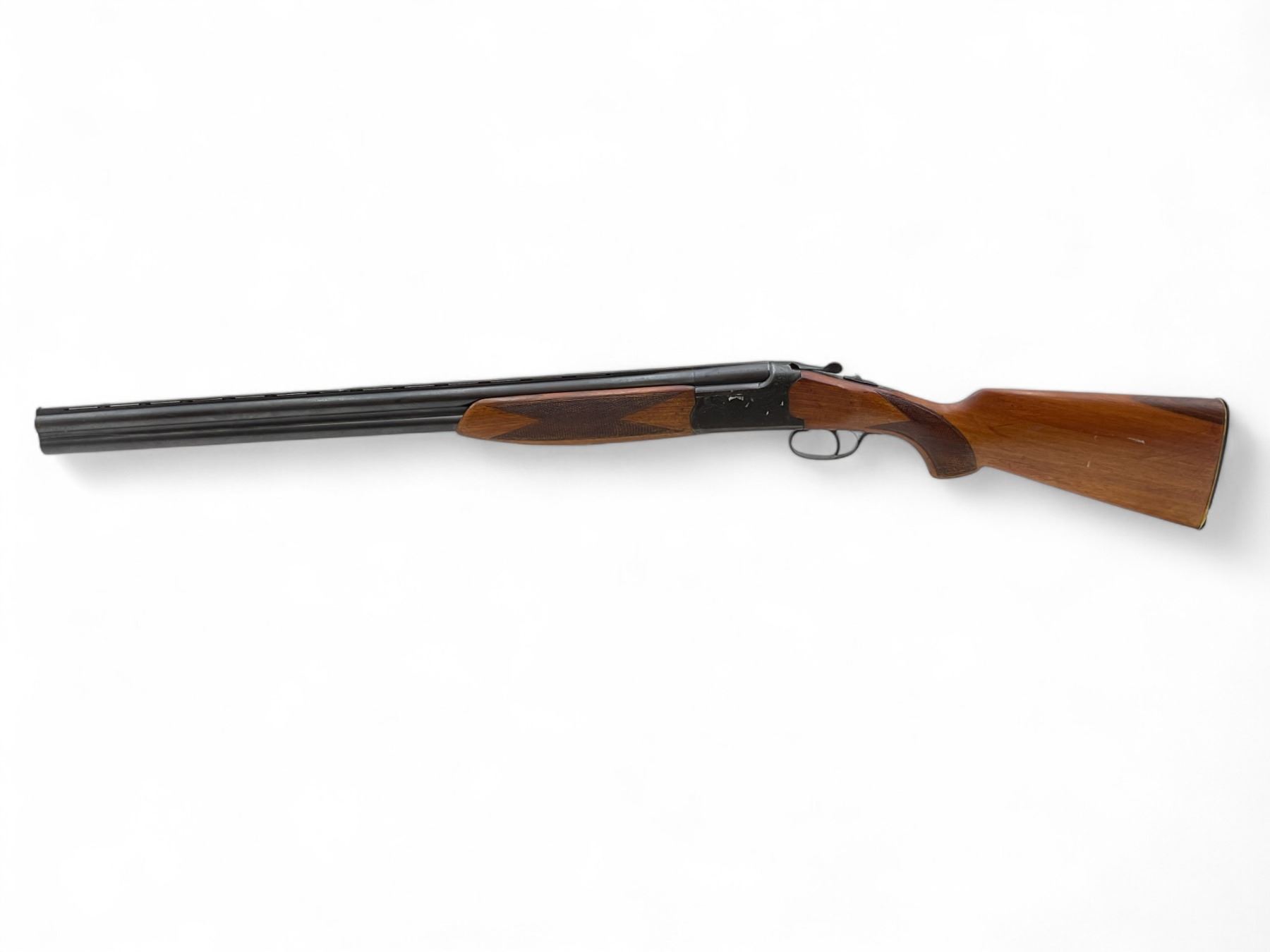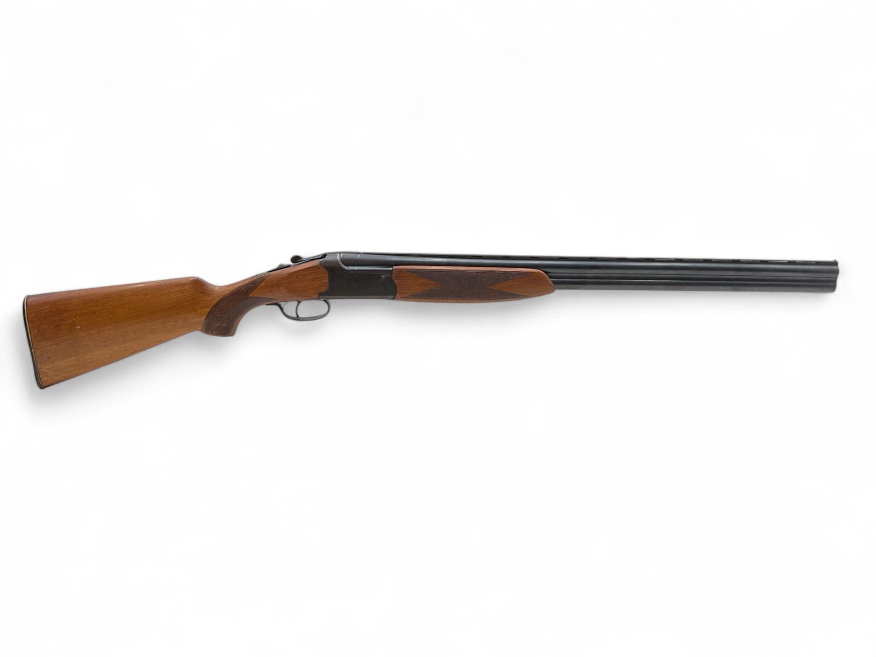 Eibar Over Under Shotgun 12Ga 2.75" Chambers 28" Barrels Wood Stock. Vent rib has several bends. Bead sight; fixed chokes. Rear butt plate cracked and broken. This is a non-restricted firearm.