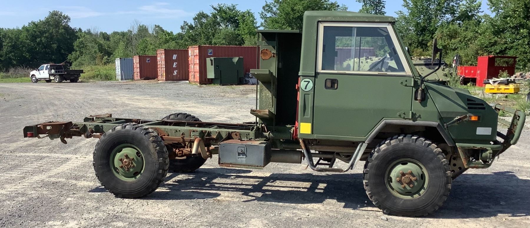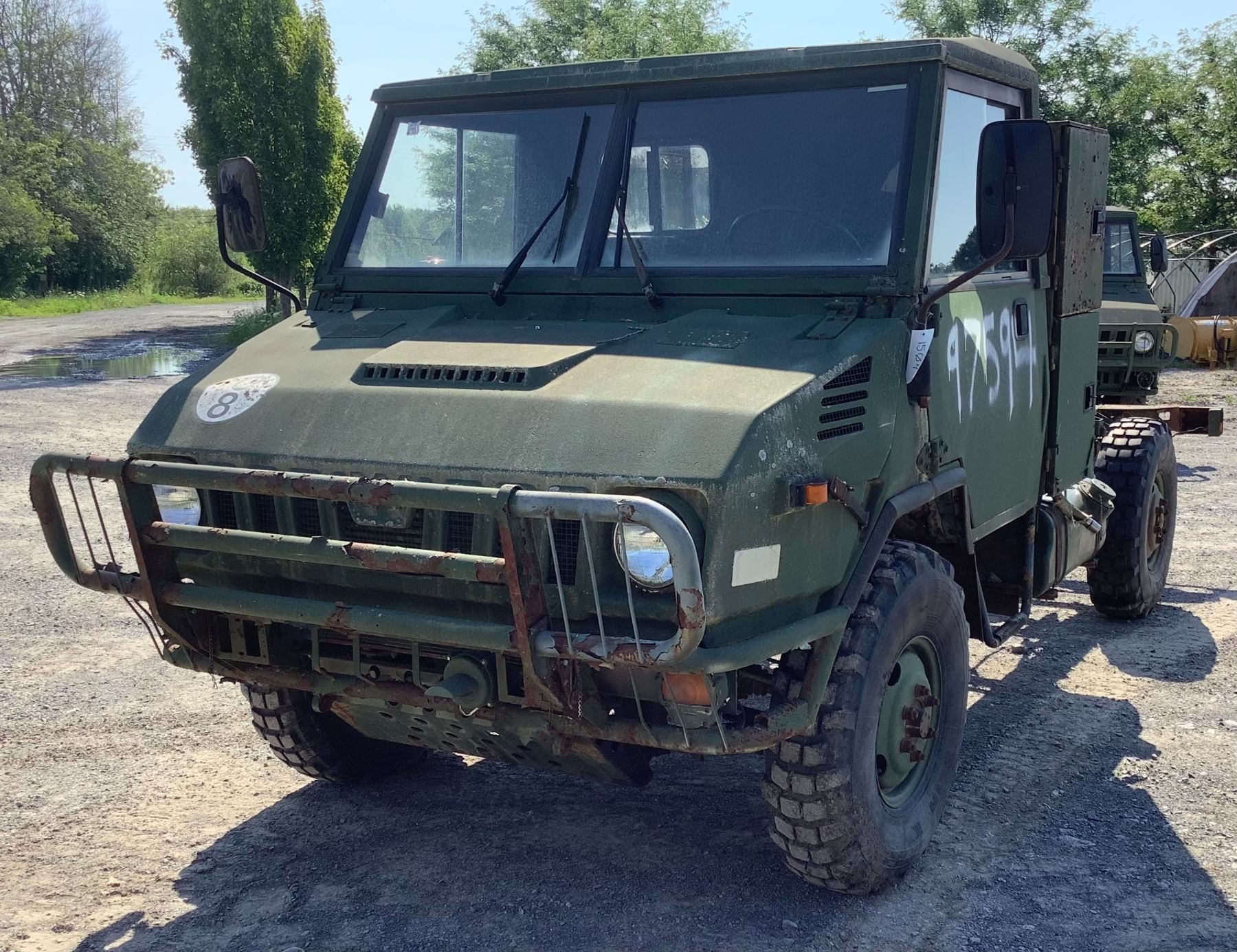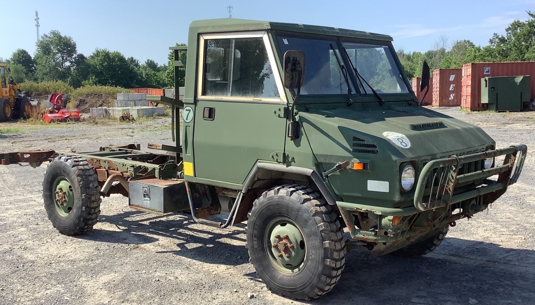 This is an ex Canadian Forces LSVW. The batteries are removed and we have not attempted to start it. One of the rear wheels seems to be locked up, we figure a brake is stuck on. One of the rear tires seems to have a leak as well. We pumped it up for the pictures but it slowly went down. It does not come with an ownership.