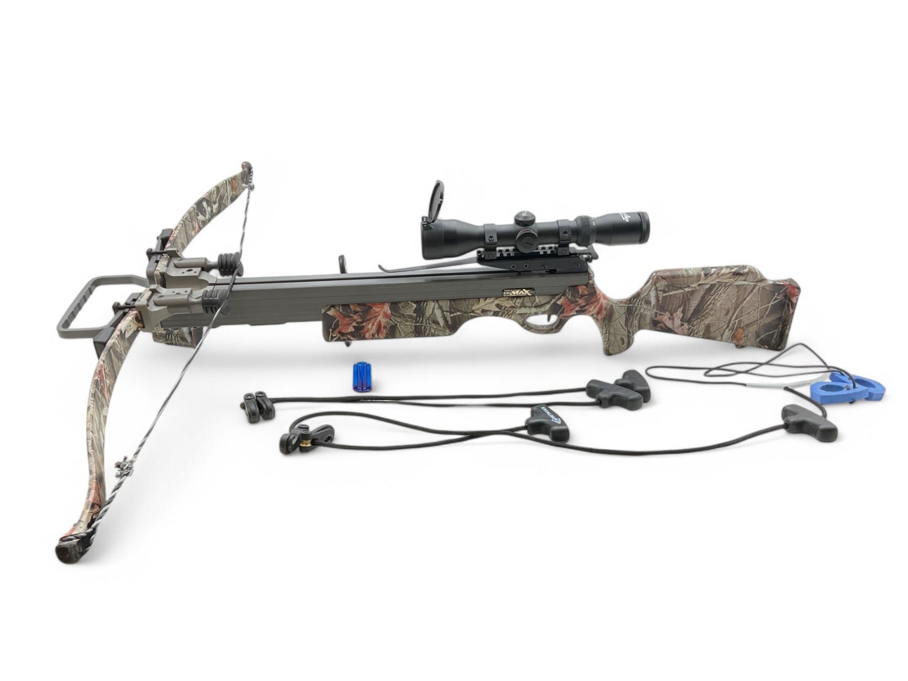 Excalibur ExoMax Crossbow Camo With Quiver Excalibur Twilight DLX Scope And Excalibur Case. Scope adjusts from 300FPS to 400FPS. Also includes cocking aid and camo cover.