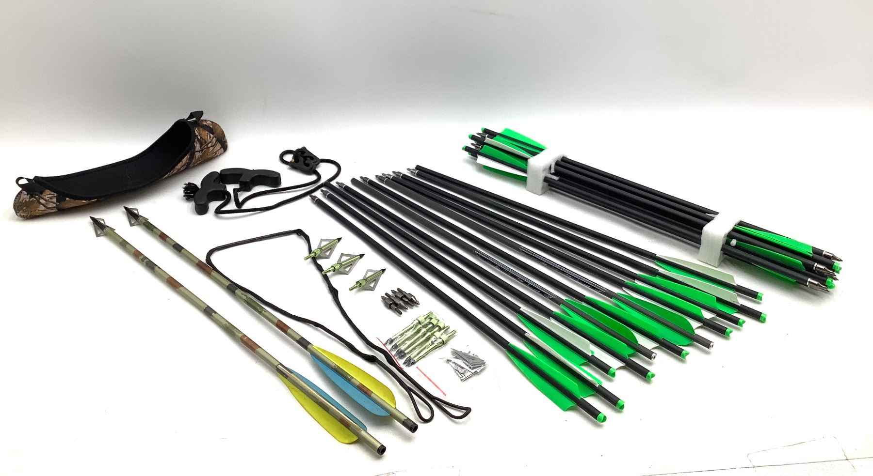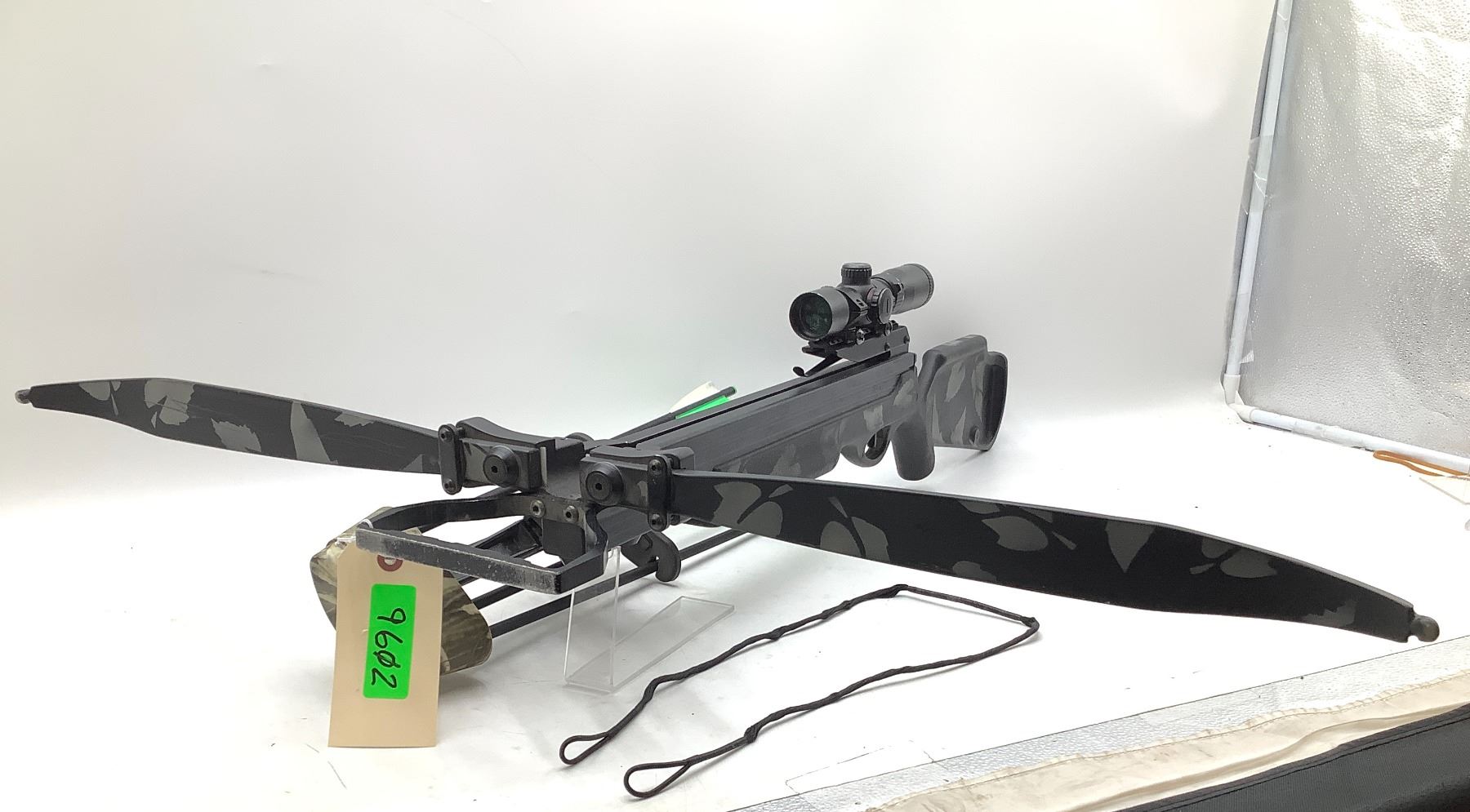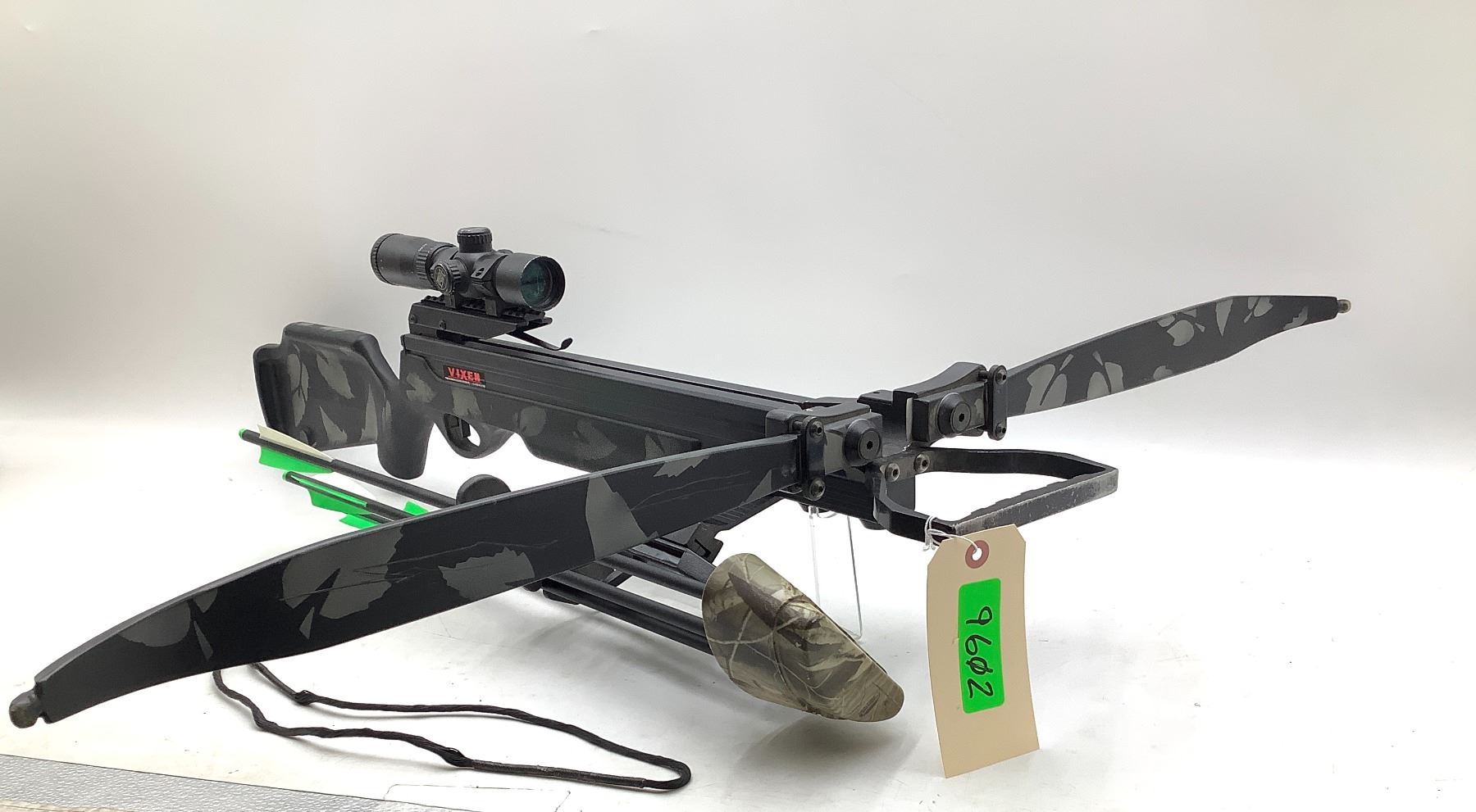 Excalibur Vixen Crossbow With Scope Quiver Case And Bolts. Tac Zone Scope, quiver includes 4 bolts with broadheads. String included but not installed on limbs. Comes with cocking aid. Also includes 23 additional bolts with various field points and 3 additional broad heads.