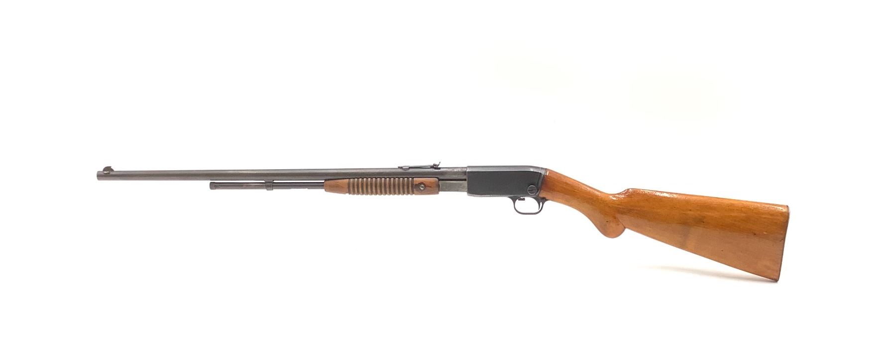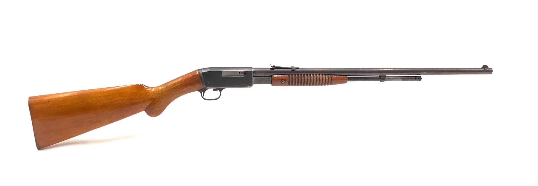 FN Browning Trombone Pump Action Rifle 22 Cal 21.5" Barrel Tube Fed Magazine. Open sights. Wood stock appears to have been refinished, scratches, cracks and nicks present. Metal finish is worn and scratched in areas. This is a non-restricted firearm.