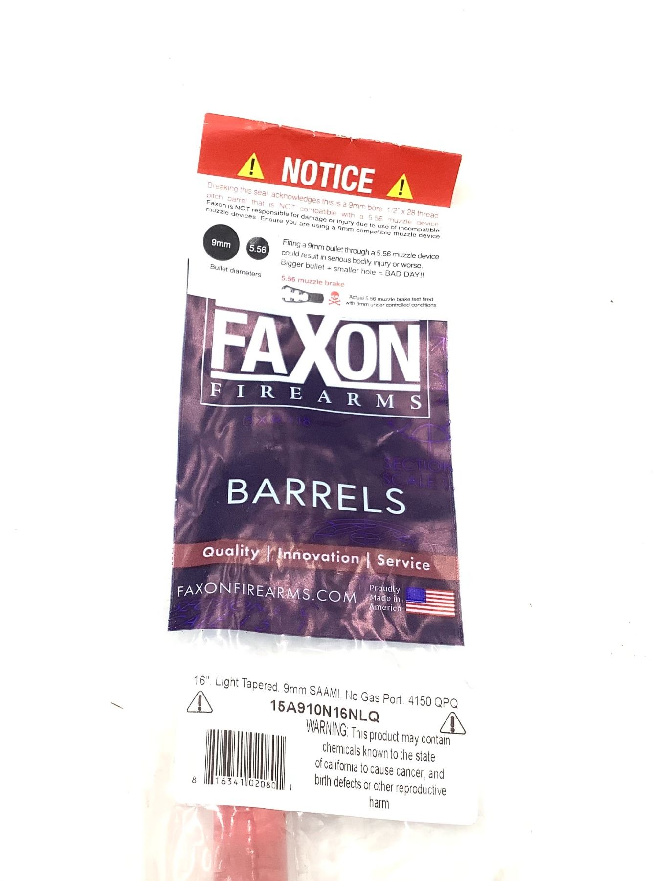 Faxon 15A910N16NLQ 16" Light Tapered Barrel 9MM SAAMI No Gas Port, New.