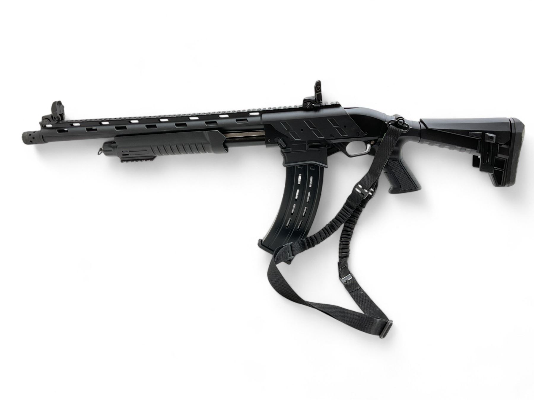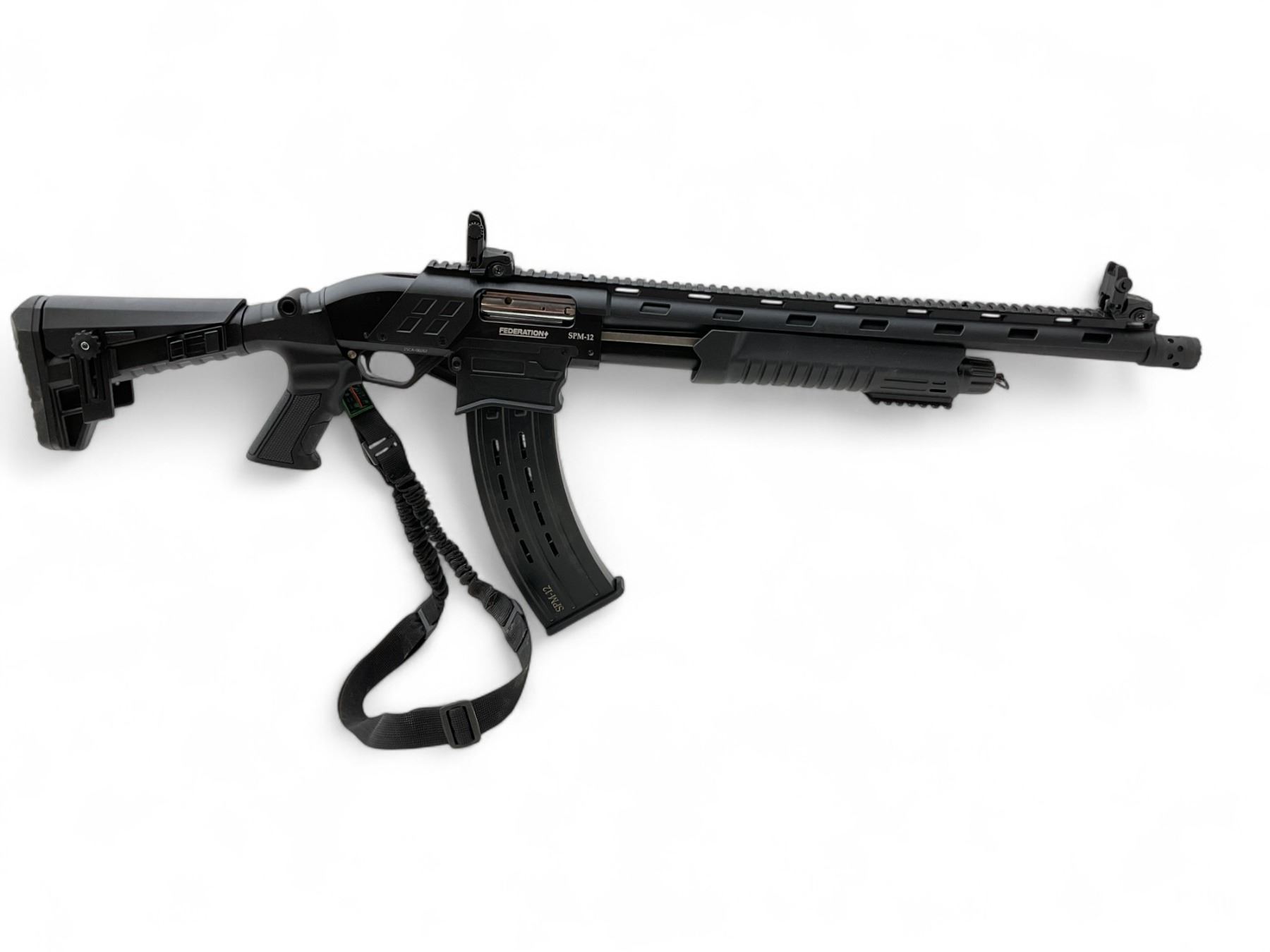 Federation Firearms SPM12 Pump Action 12Ga Shotgun 3" Chamber 18.5" Barrel. Detachable magazine, flip up sights. Removable choke, adjustable stock. Includes single point sling. This is a non-restricted firearm.