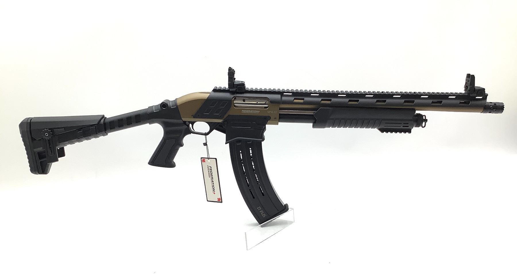 Federation Firearms SPM12 Pump Action 12Ga Shotgun 3" Chamber 18.5" Barrel FDE, New. Detachable magazine, flip up sights. Removable choke, adjustable stock. This is a non-restricted firearm.