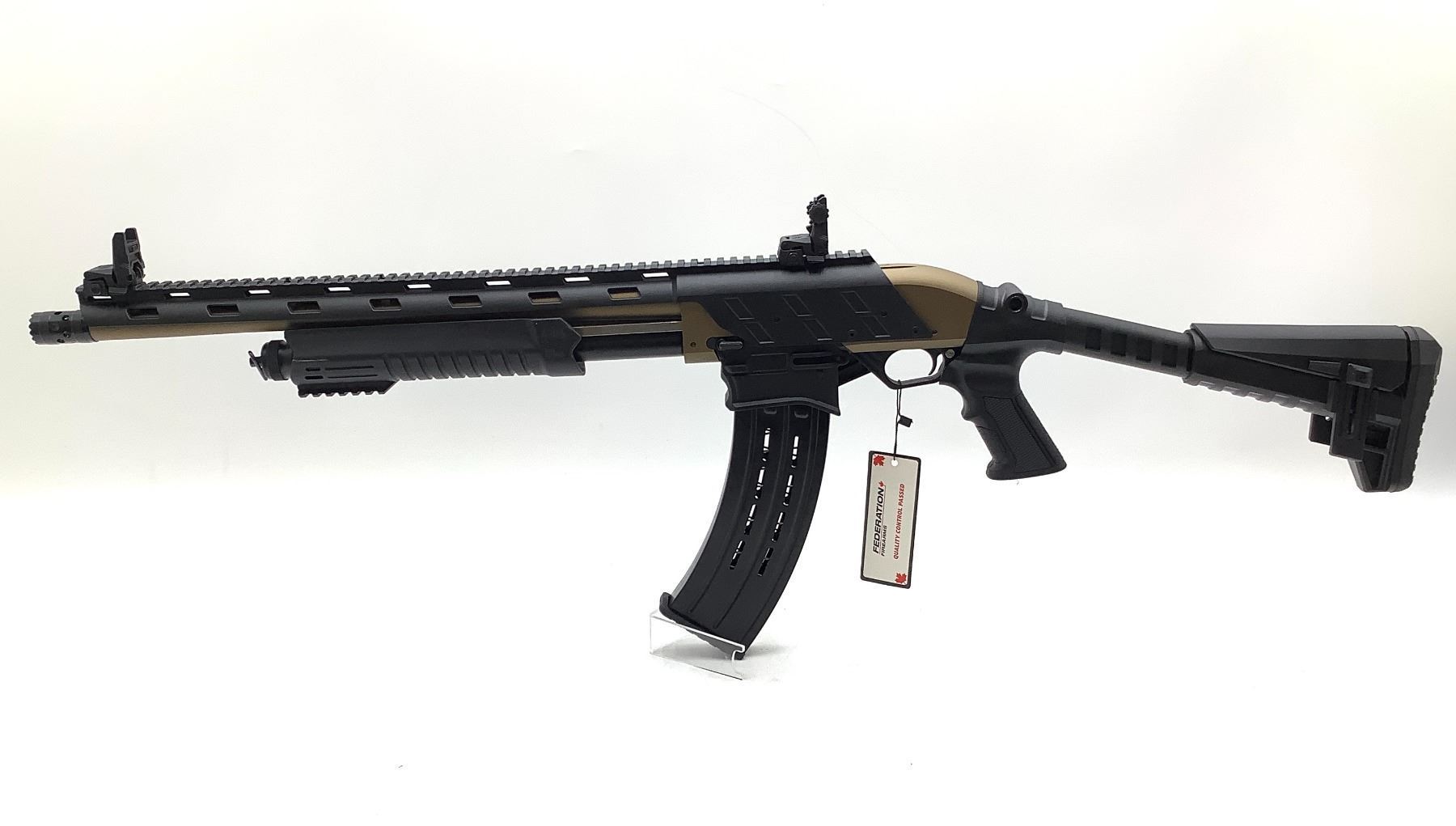 Federation Firearms SPM12 Pump Action 12Ga Shotgun 3" Chamber 18.5" Barrel FDE, New. Detachable magazine, flip up sights. Removable choke, adjustable stock. This is a non-restricted firearm.