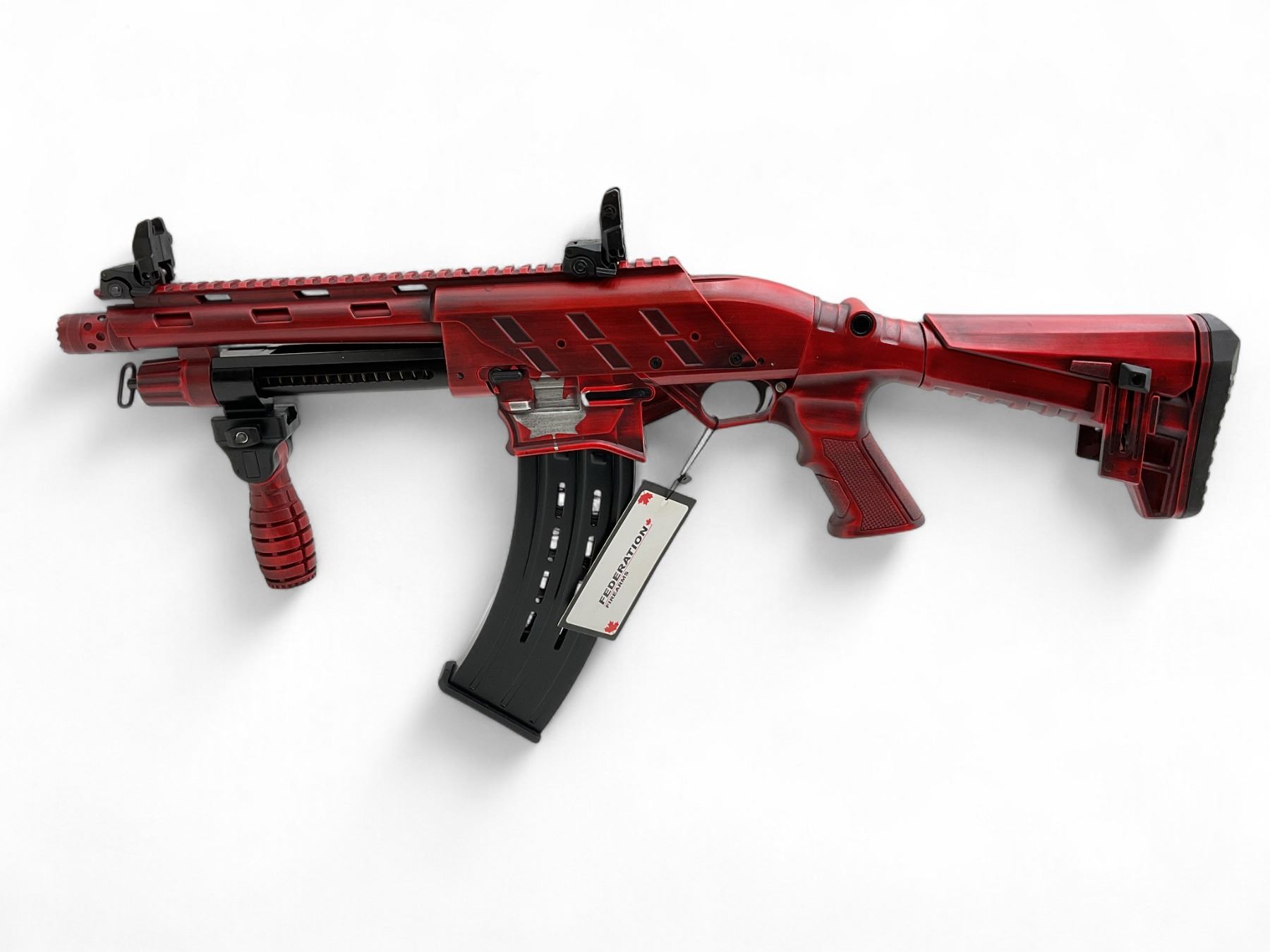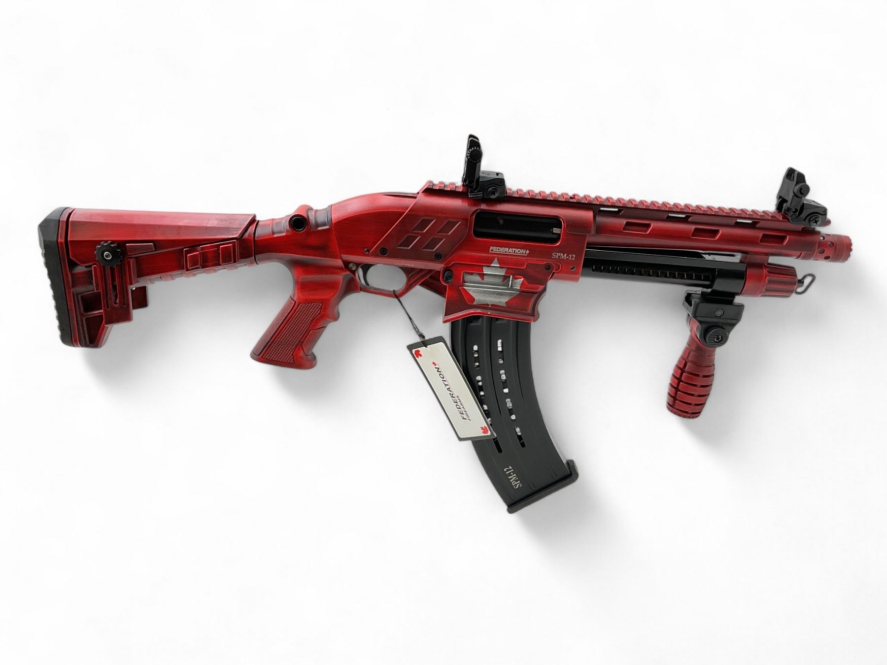 Federation Firearms SPM12 Shorty Pump Action 12Ga Shotgun 3" Chamber 9" Barrel Canadian Flag, New. Detachable magazine, flip up sights. Removable choke, adjustable stock. This is a non-restricted firearm.