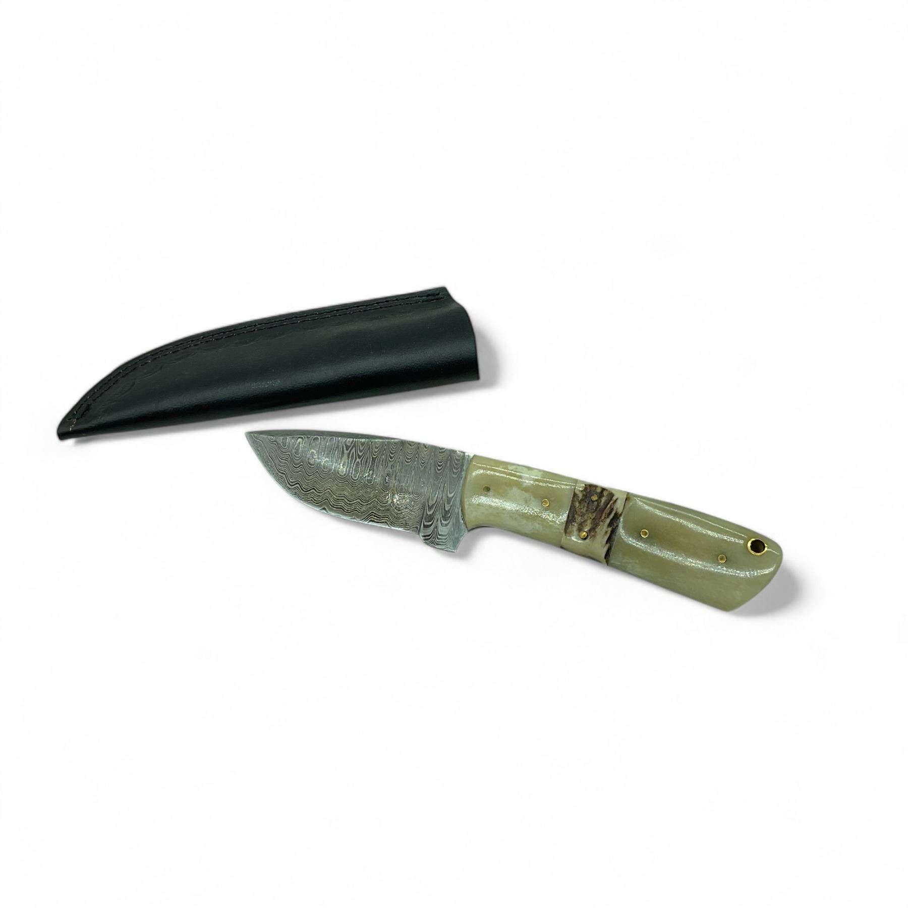 Fixed 3 1/4" Damascus Blade Knife with Bone Handle and Leather Belt Sheath