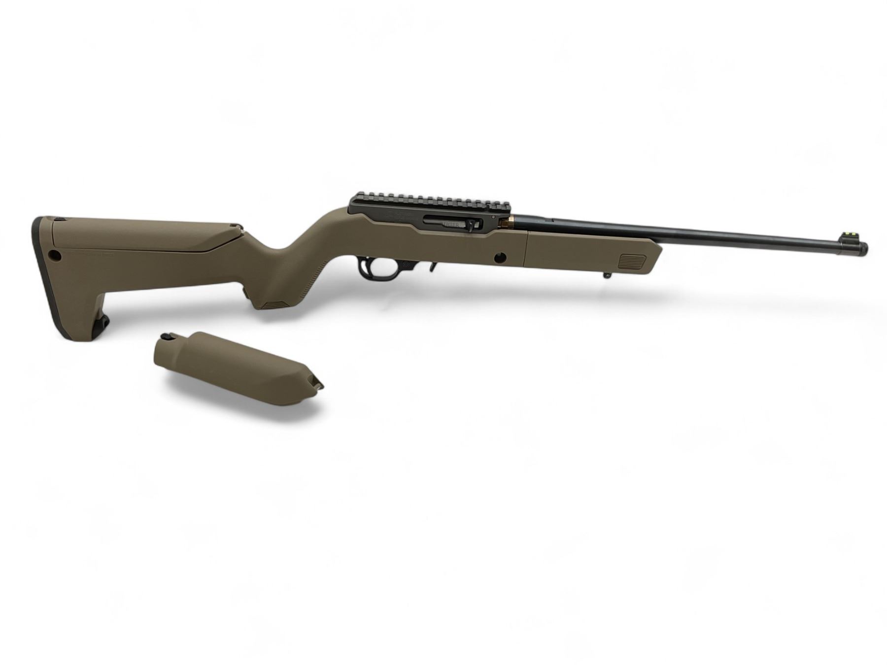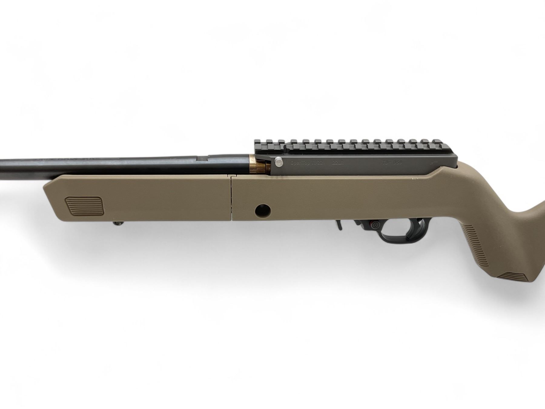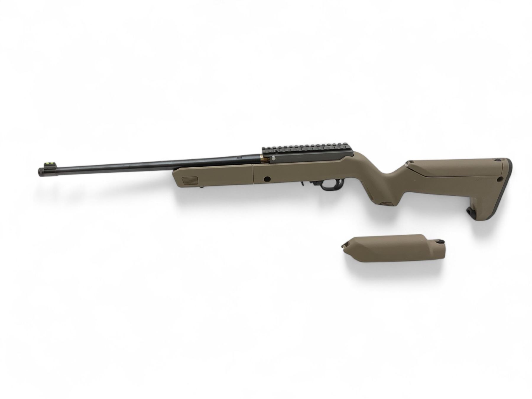 Flethcher Rifle Works Ruger Take Down Open Top 10/22 Semi Auto Rifle .22LR 16" Barrel Tan Magpul X22 Stock. Includes 4 detachable magazines. Fiber optic front sight; no rear sight. X22 stock includes extra cheek riser; cheek riser front tab is broken on stock. This is a non-restricted firearm.