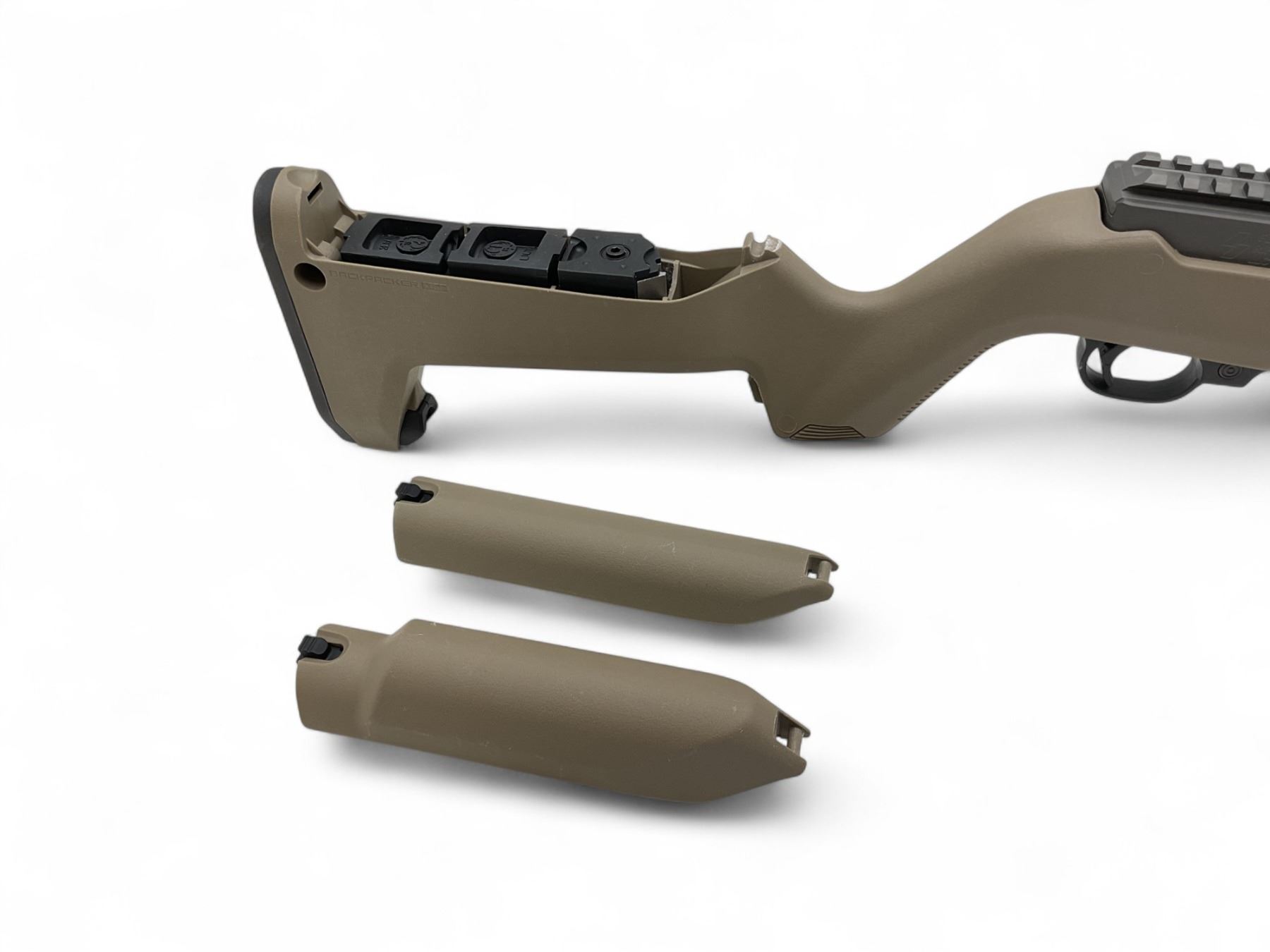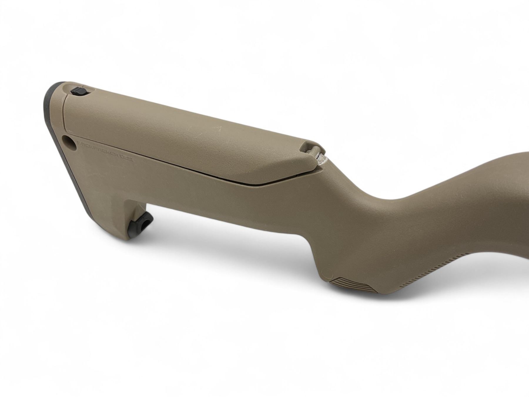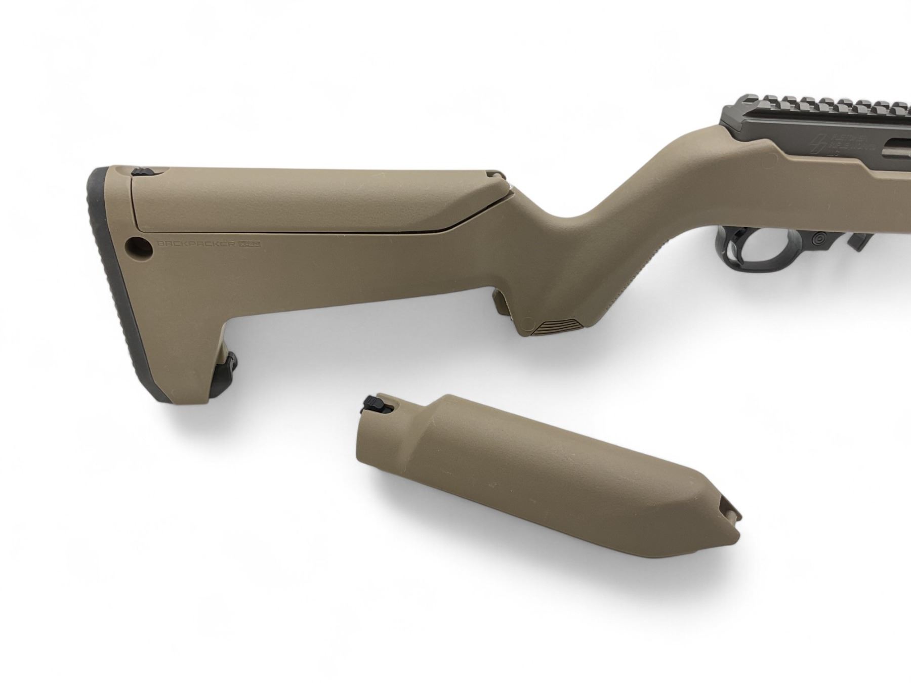 Flethcher Rifle Works Ruger Take Down Open Top 10/22 Semi Auto Rifle .22LR 16" Barrel Tan Magpul X22 Stock. Includes 4 detachable magazines. Fiber optic front sight; no rear sight. X22 stock includes extra cheek riser; cheek riser front tab is broken on stock. This is a non-restricted firearm.