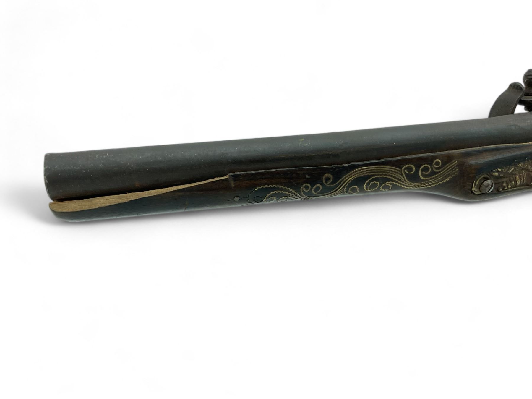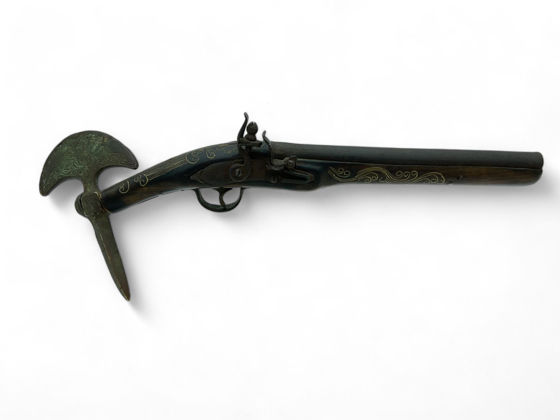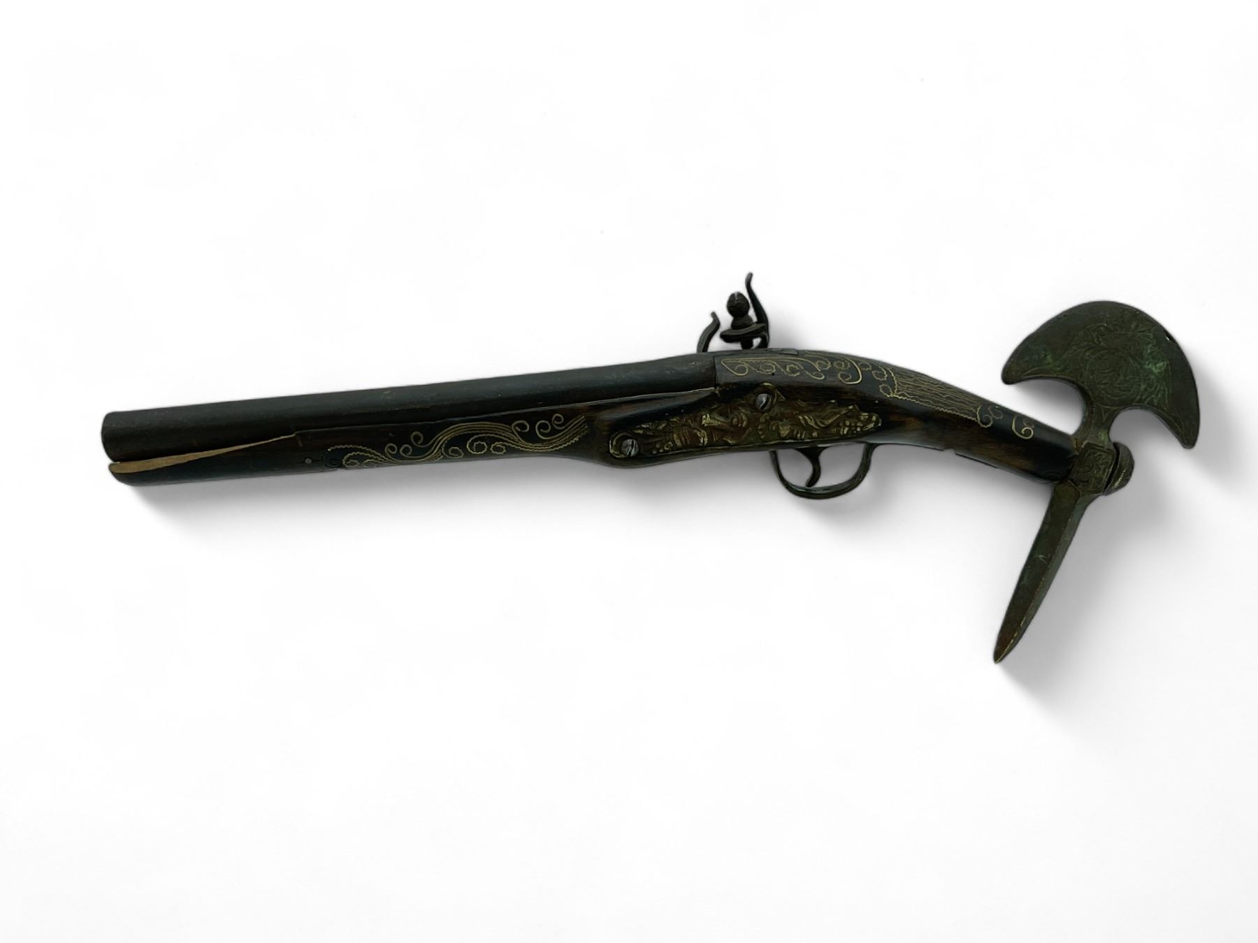 Flintlock Muzzle loading Black Powder Pistol With Axe Head Grip, Antique. May be a reproduction or prop. Wood stock cracked; untested. You must be over 18 years of age to purchase this item.