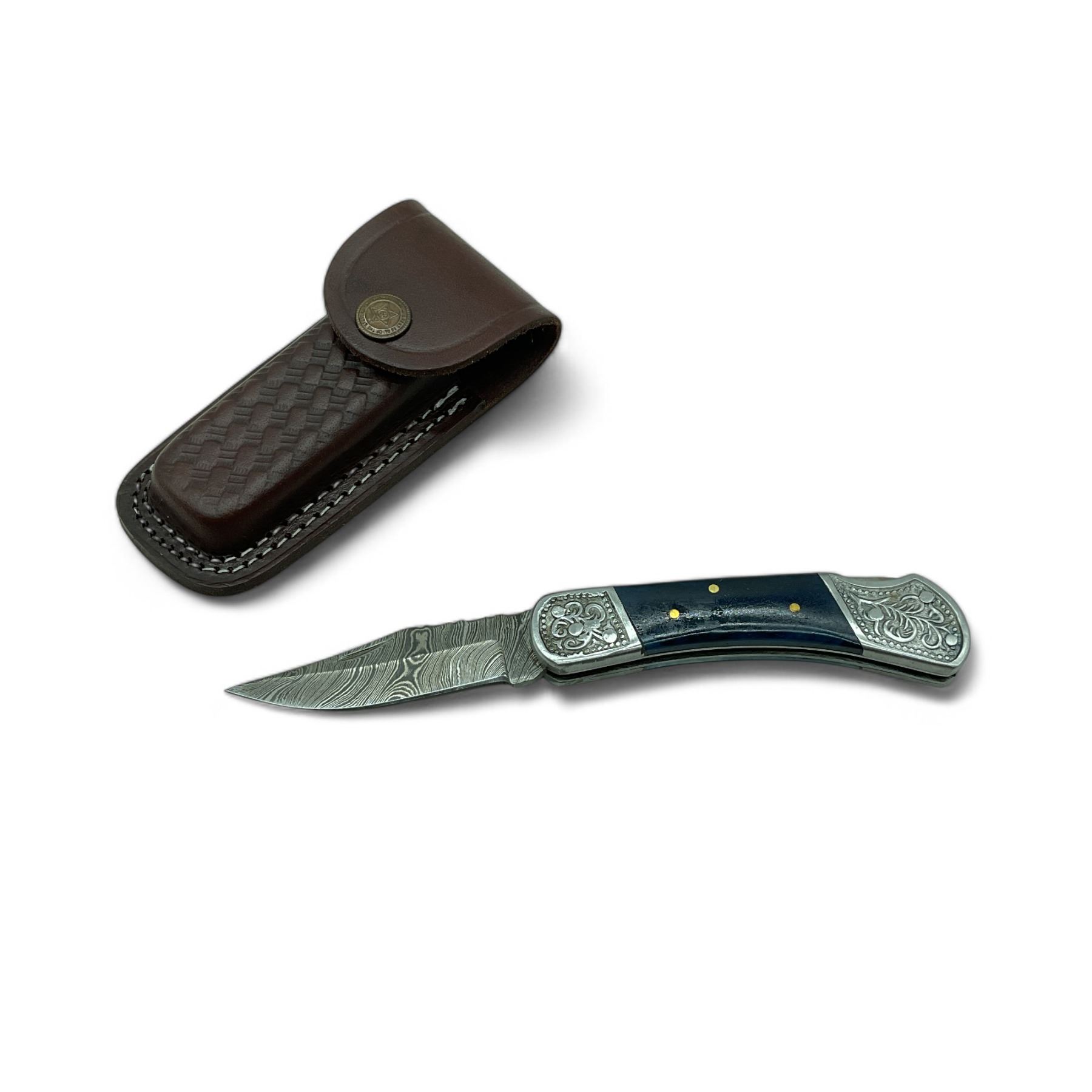 Folding 2 3/4" Damascus Blade Knife with Bone Handle and Leather Sheath