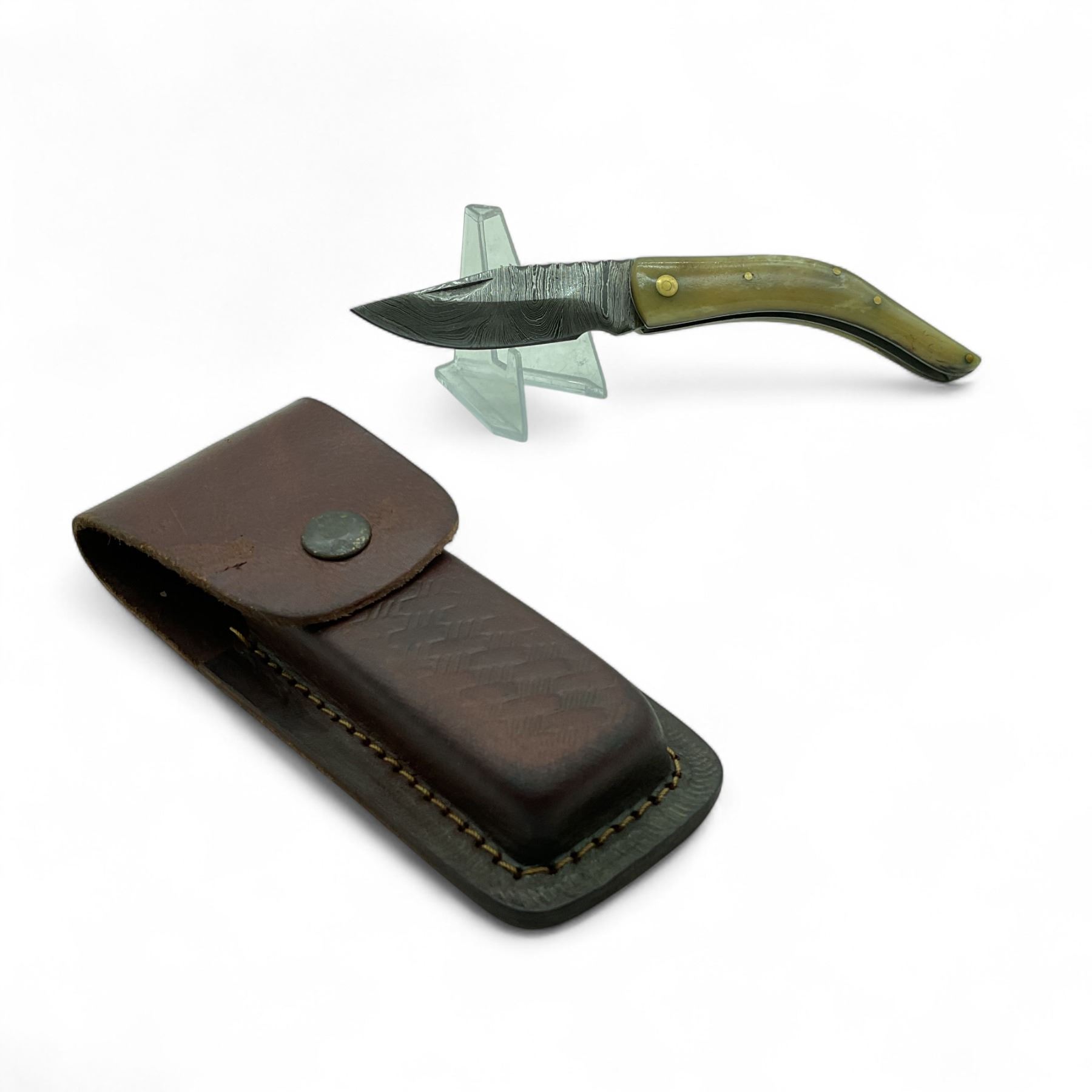 Folding 2.5" Damascus Blade Knife with Leather Sheath
