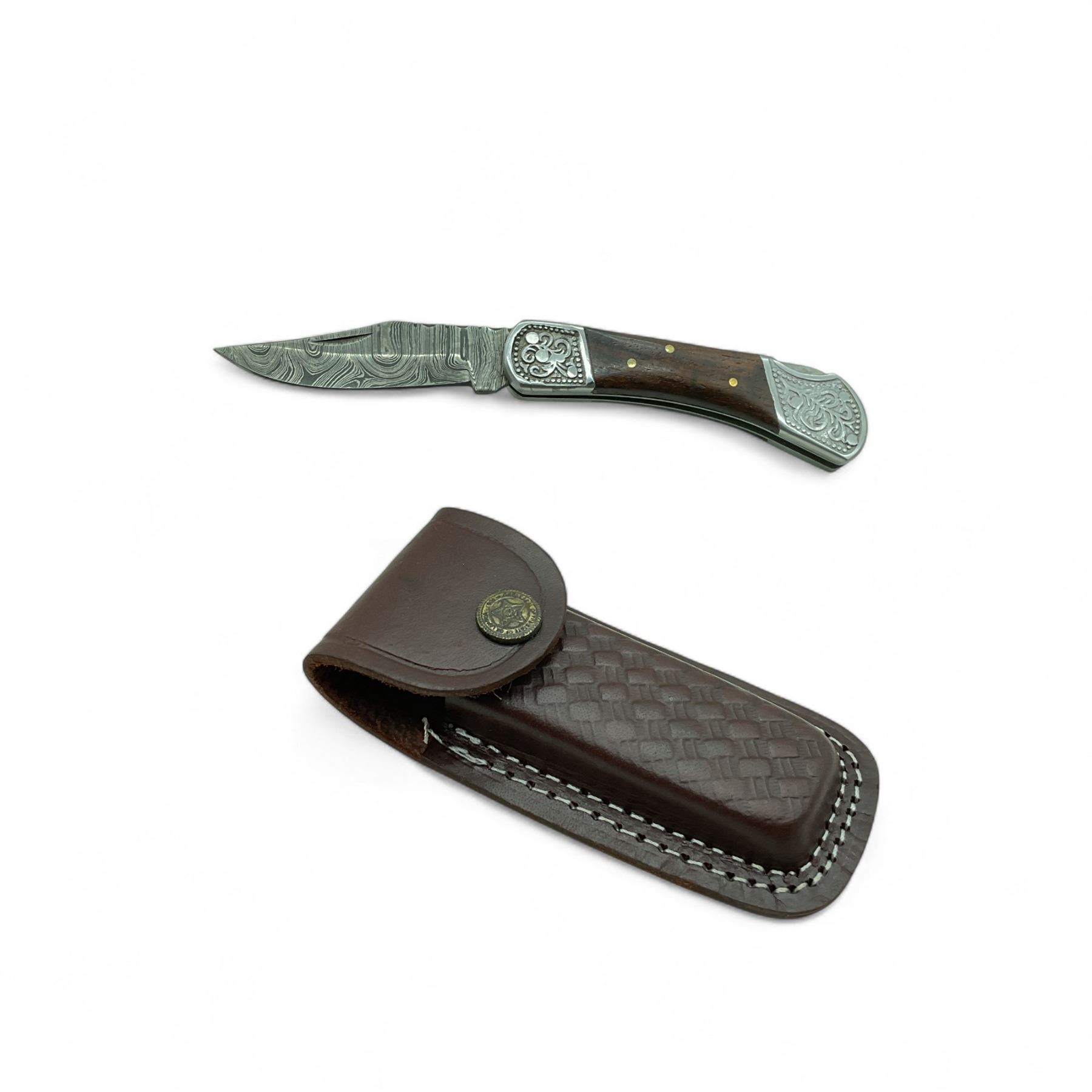 Folding 2.75" Damascus Blade Knife with Leather Sheath