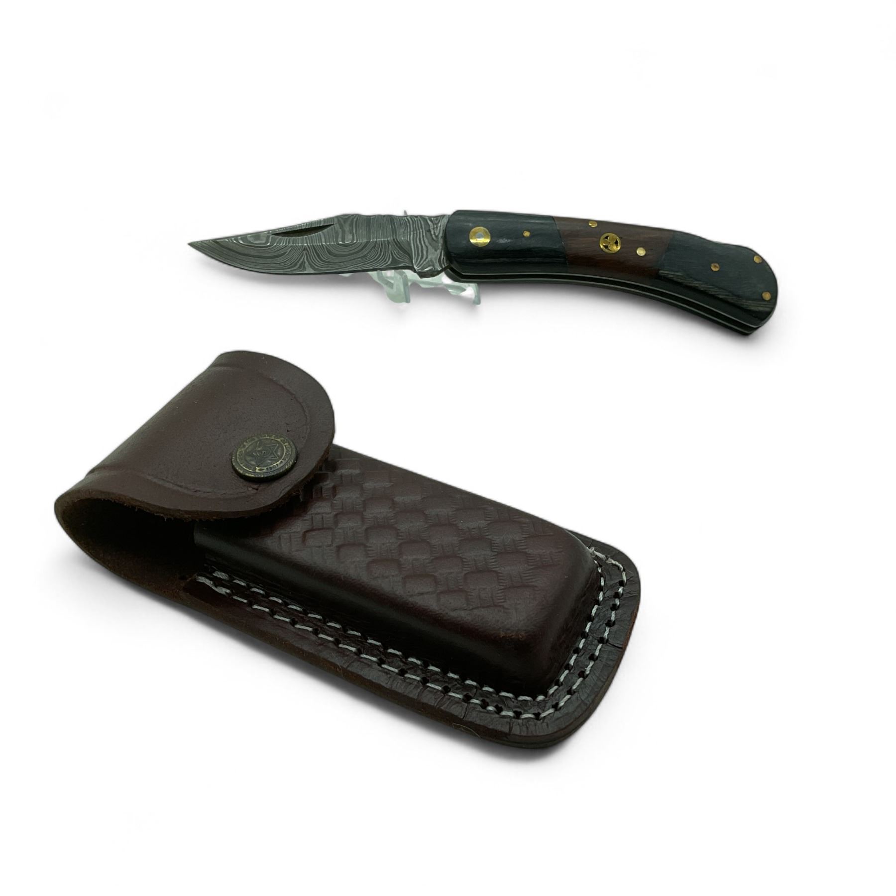 Folding Damascus 2.75" Blade Knife with Leather Sheath