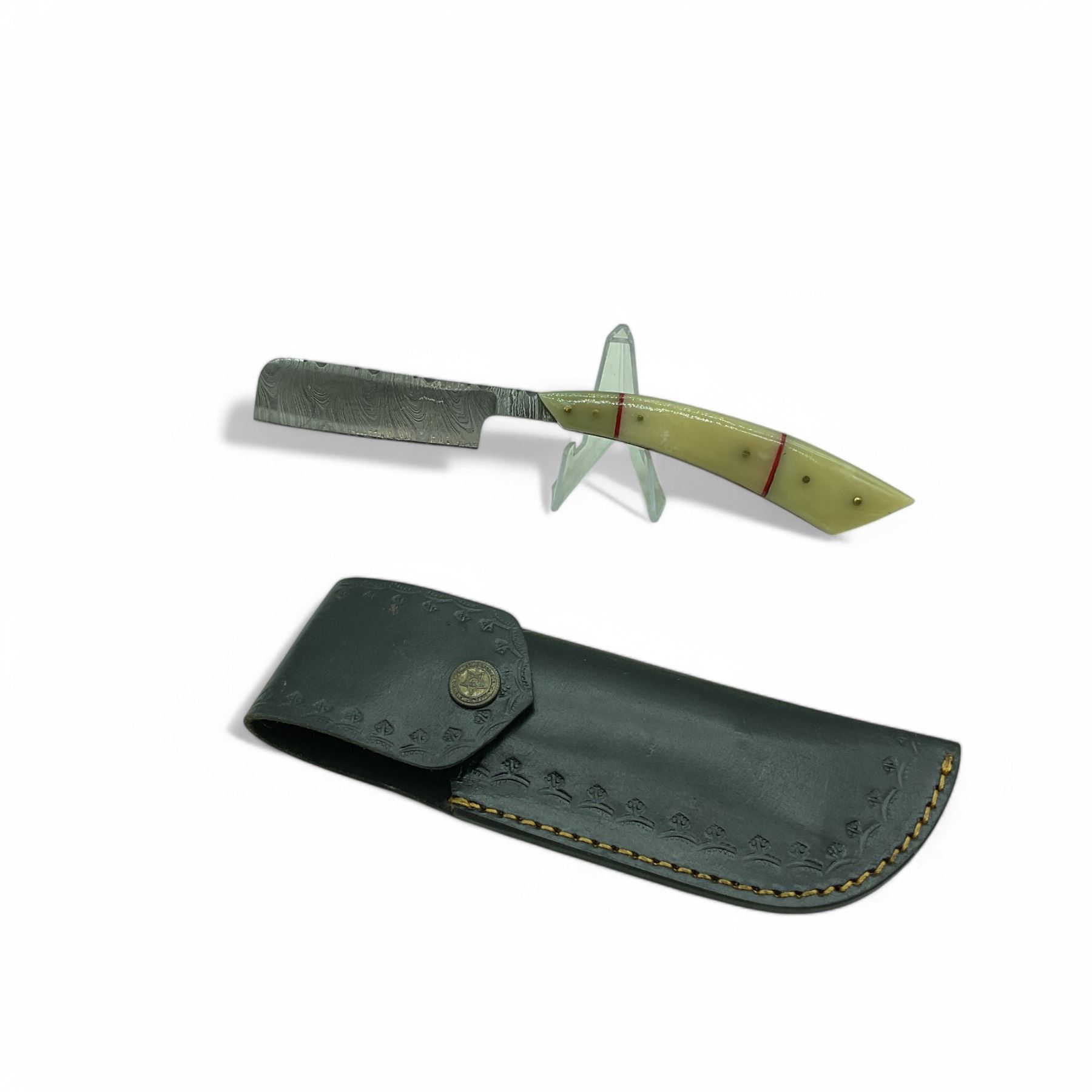 Folding Damascus Razor Blade with Bone Handle and Leather Belt Sheath