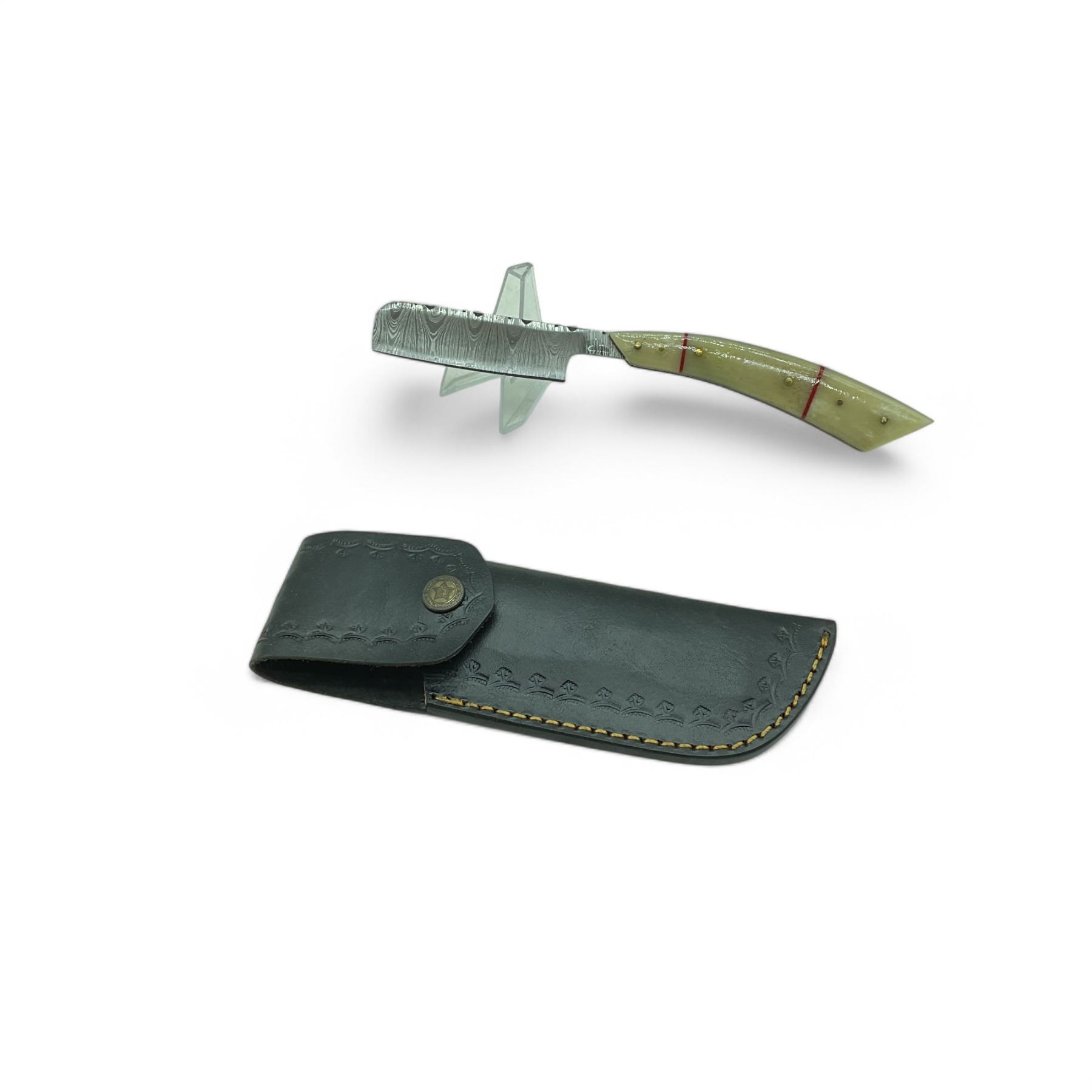 Folding Damascus Razor Blade with Bone Handle and Leather Belt Sheath